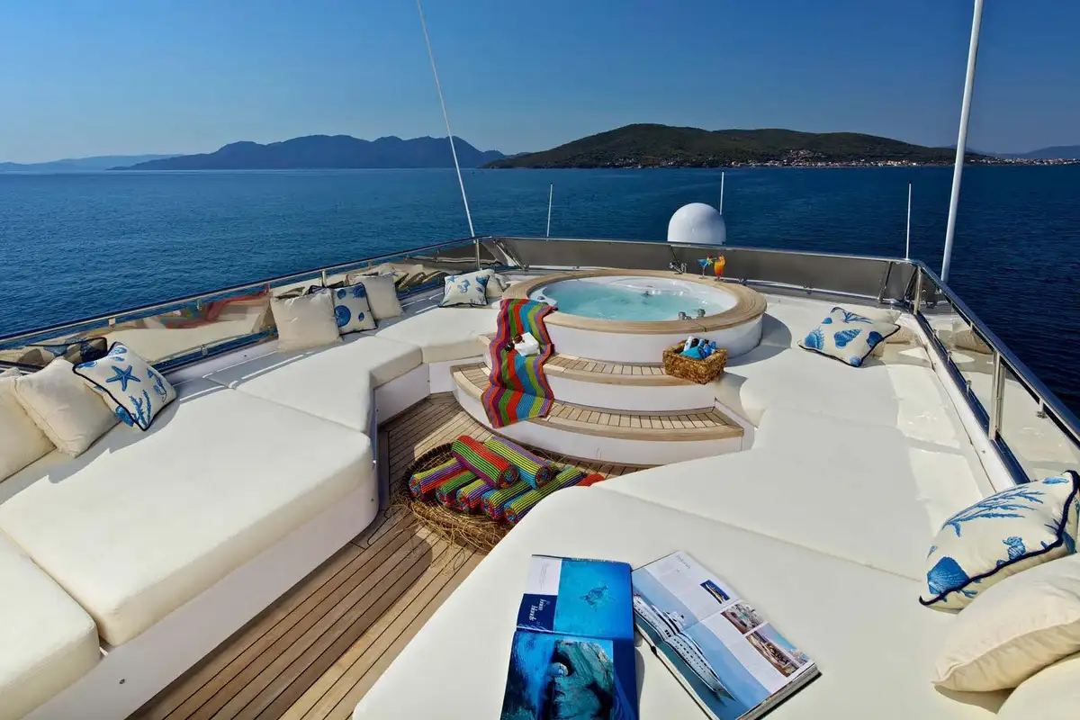 O’RION’s deck spaces offer your guests many areas to relax too. On the main deck the cockpit you’ll find a relaxed and exclusive al fresco dining area, while up the stairs, to port, the upper deck offers a shaded al fresco lounge area. It’s the sun deck with the lounge area to the rear, and the jacuzzi and vast sunpads found ahead, where most guests enjoy hanging out – when they’re not making the most of O’RION’s collection of water sports equipment.