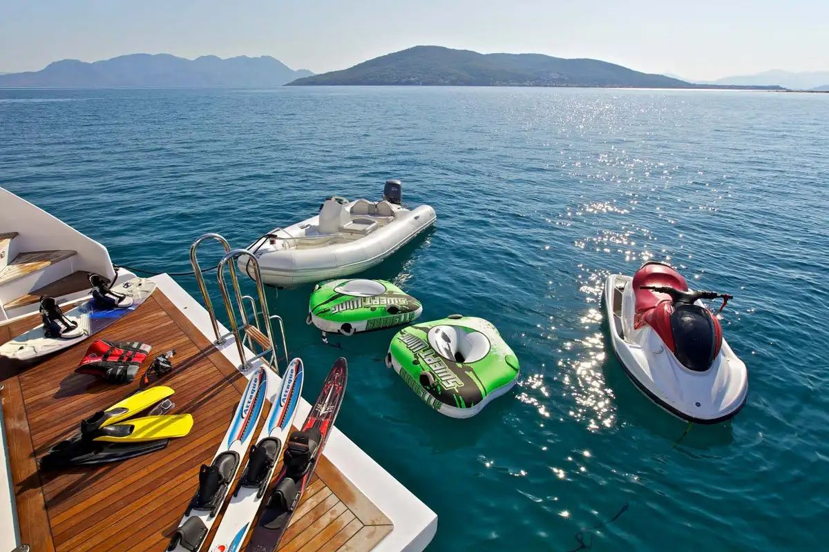 Those seeking on-the-water action won’t be disappointed. With a two-person jetski, a collection of skis, boards and towable inflatables, two SUPs, and swimming and fishing equipment, there is something for everyone on O’RION.