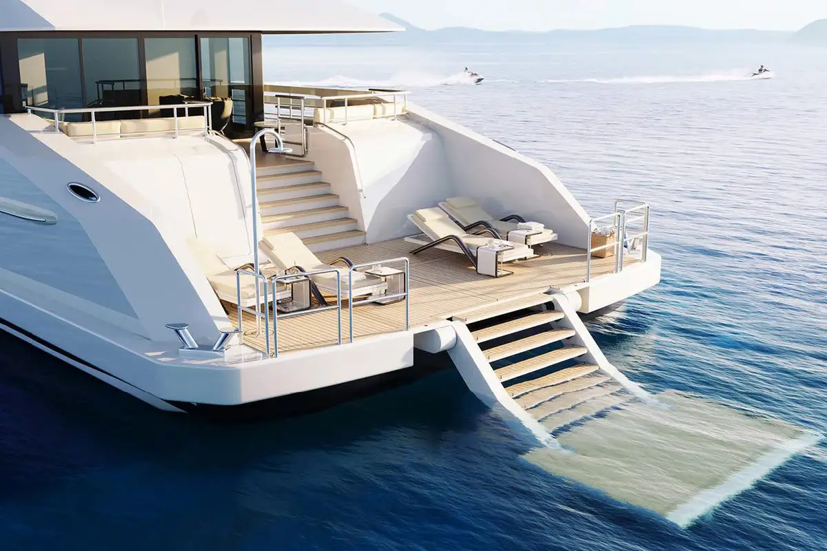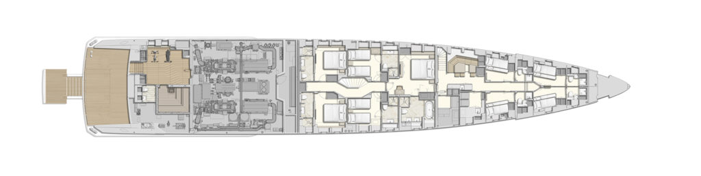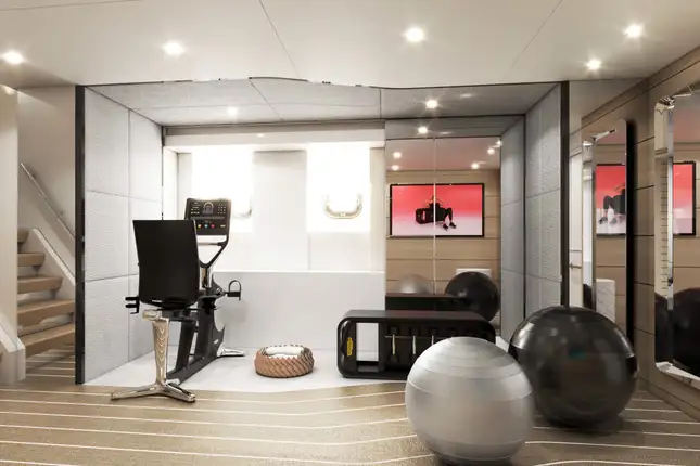 Elsewhere on the lower deck, wellness is the order of the day with a sauna and gym. There’s also a beach club with a fold-down transform platform for extra space, plus a hydraulic swim platform, ensuring comfortable access to the water as well as safe boarding.
