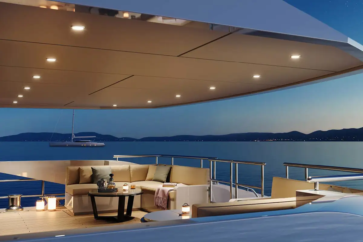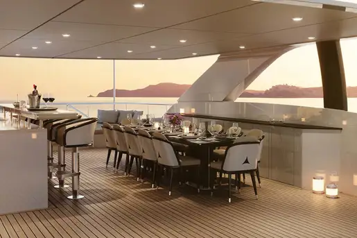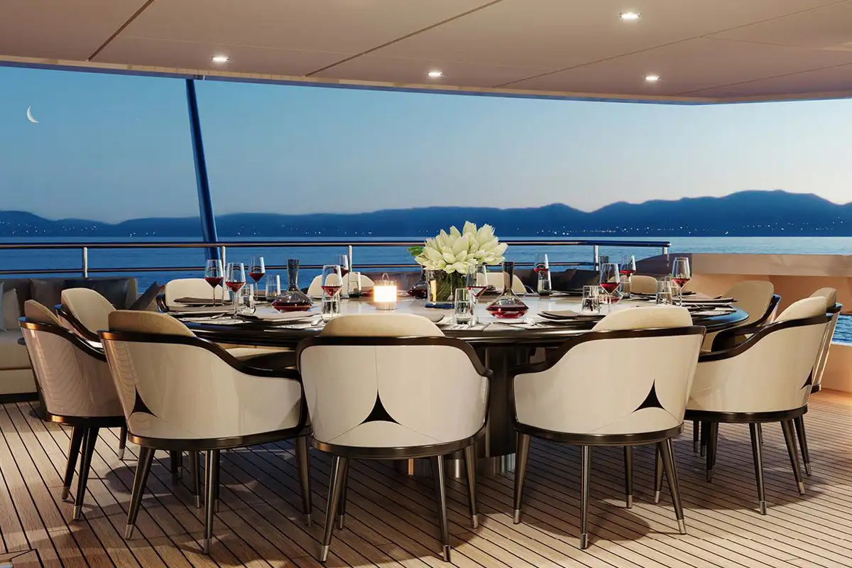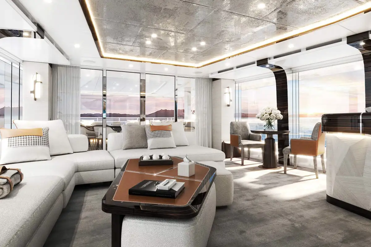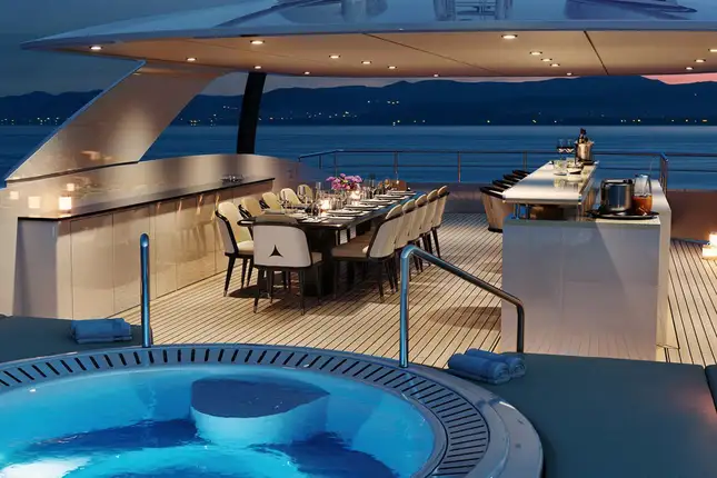 Exterior spaces have been thoughtfully designed to flow effortlessly into the interior, creating a seamless connection to the sea. The expansive sun deck is perfect for laid-back lounging, shaded by a hardtop and complete with a jacuzzi. On the bridge deck aft, a large circular dining table and sofa seating set the stage for relaxed entertaining, while the main deck aft offers a further casual lounge area.