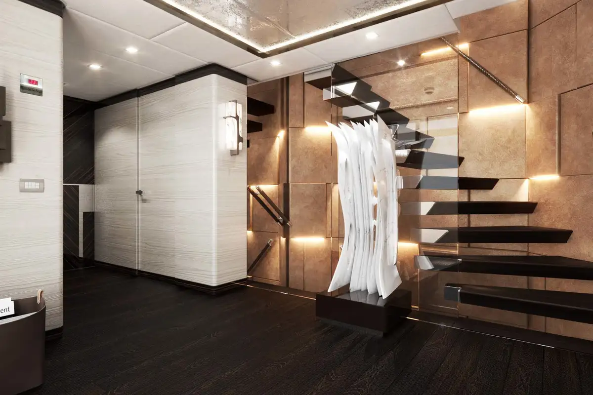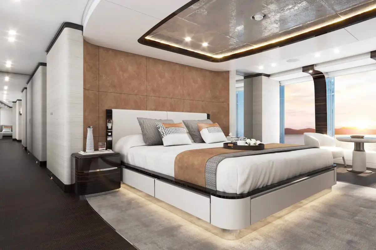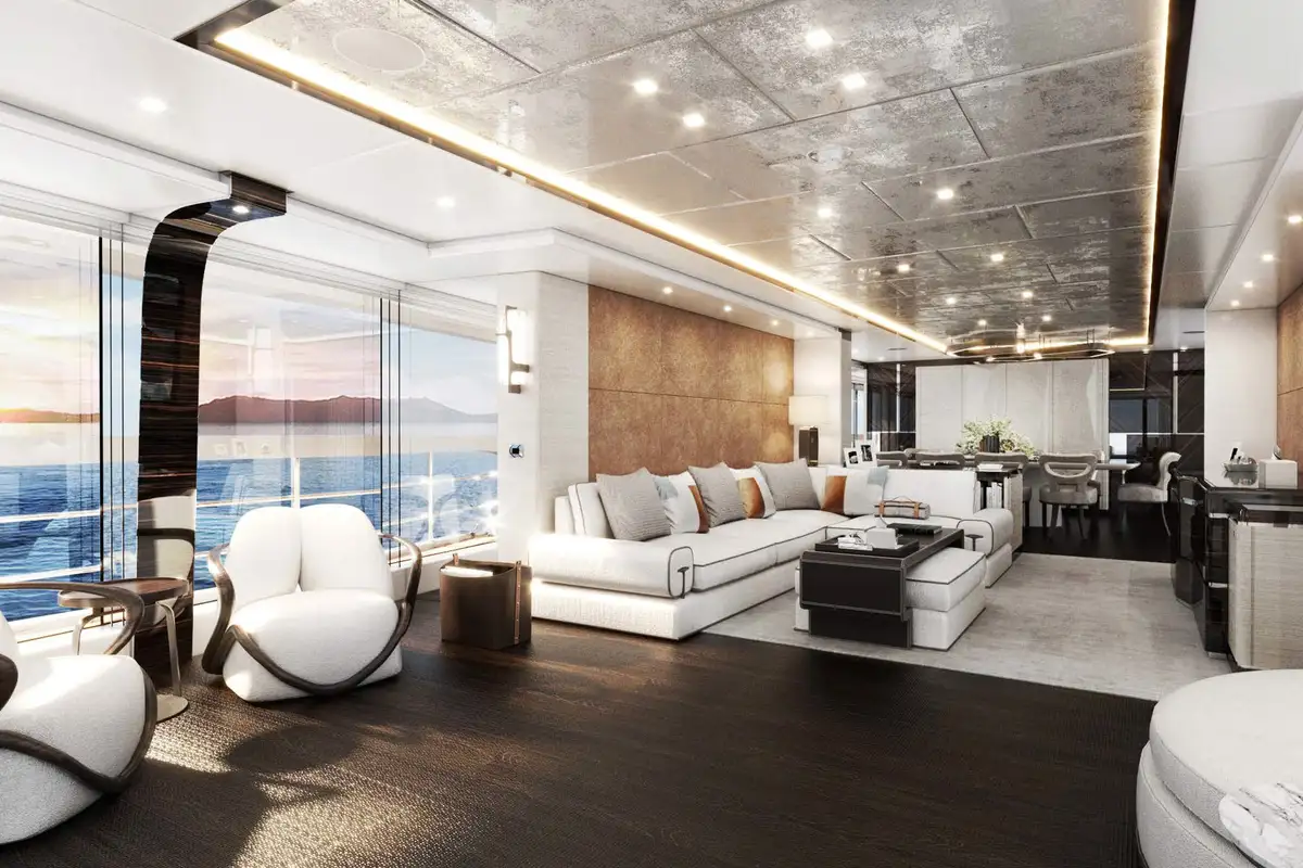 Inside, floor-to-ceiling windows and open bulwarks flood the living spaces with natural light and panoramic views. Interiors are bright and contemporary, blending opulence with warmth through carefully curated textures and materials.