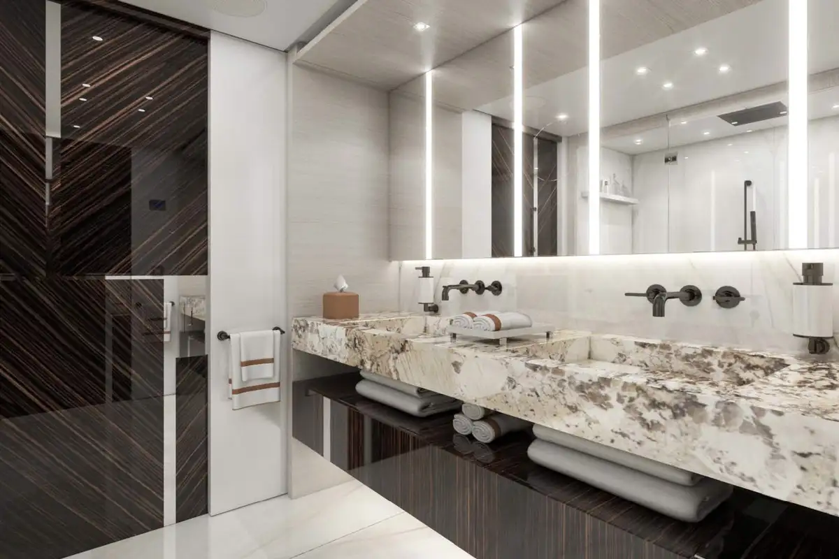 ORION sleeps up to 12 guests across six cabins. The full-beam owner’s suite, located on the main deck, is a standout space, while the lower deck hosts a full-beam VIP, two doubles, and two twin cabins – ideal for flexible guest arrangements.