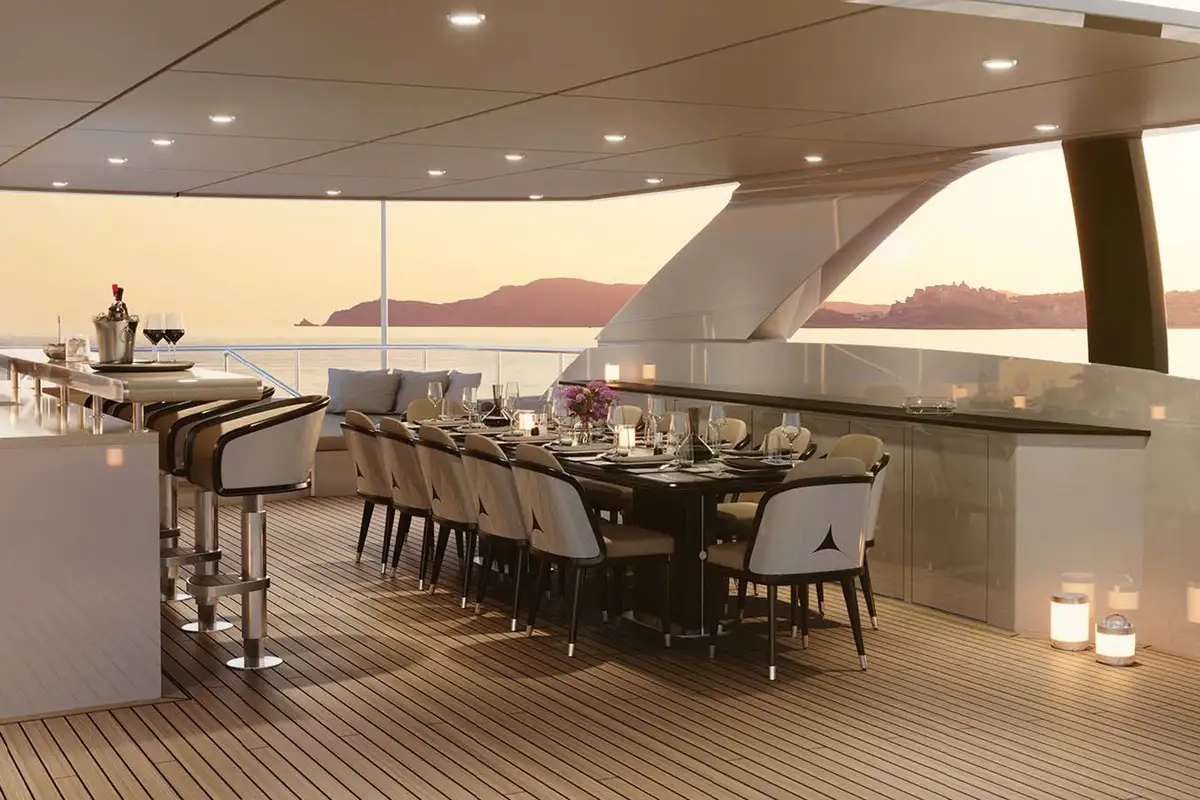 The upper deck lounge is a social hub, with a fully serviced bar, games table, and a large sofa for movie nights or evening cocktails. Forward on the main deck, a formal dining area invites guests to enjoy refined meals with uninterrupted sea views, complemented by a welcoming lounge aft.