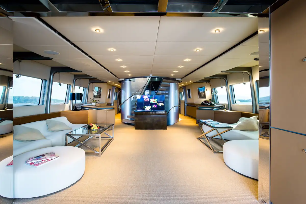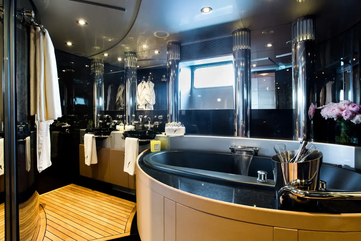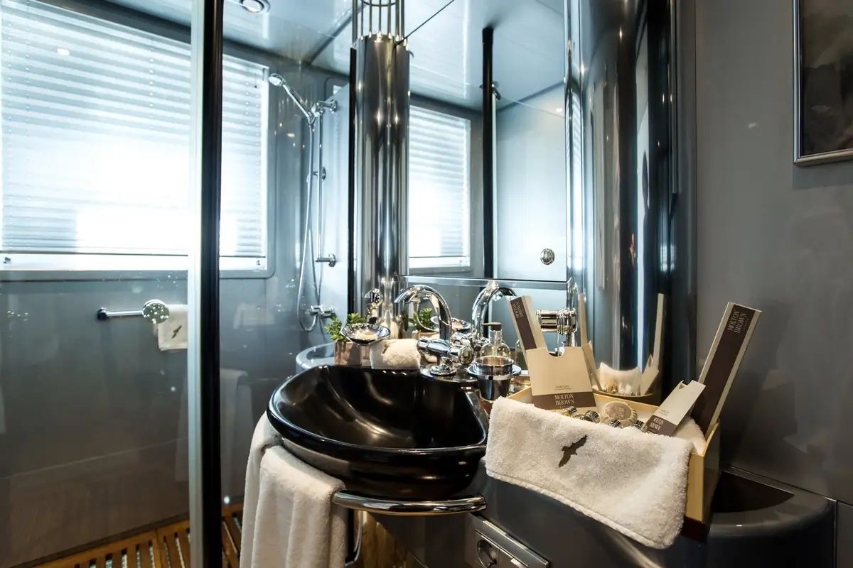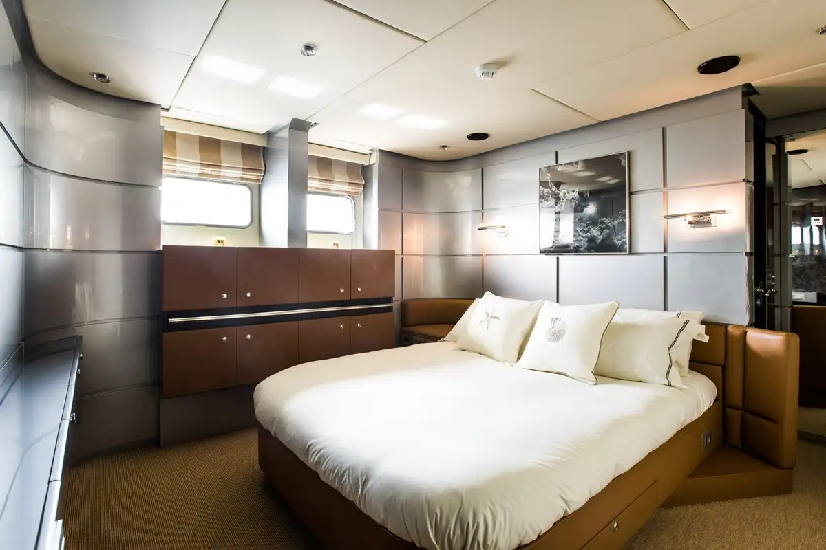 Ten guests are accommodated across four cabins on the lower deck- all of which feature modern furnishings and understated features. In 2007 and again in 2016, she underwent full refurbishments when all the interiors were upgraded to ensure she remains fresh and contemporary. The master suite is located forward and fills the full width of the yacht with a king-sized bed, large bathroom with jacuzzi spa bath set out on a semi-circular floorplan. The bedroom and bathroom is separated by a glass panel to provide a feeling of a much greater space; at the flick of a switch this glass can turn opaque or clear. There are a further three suites- two double cabins and a quadruple cabin, all with en suite shower rooms.