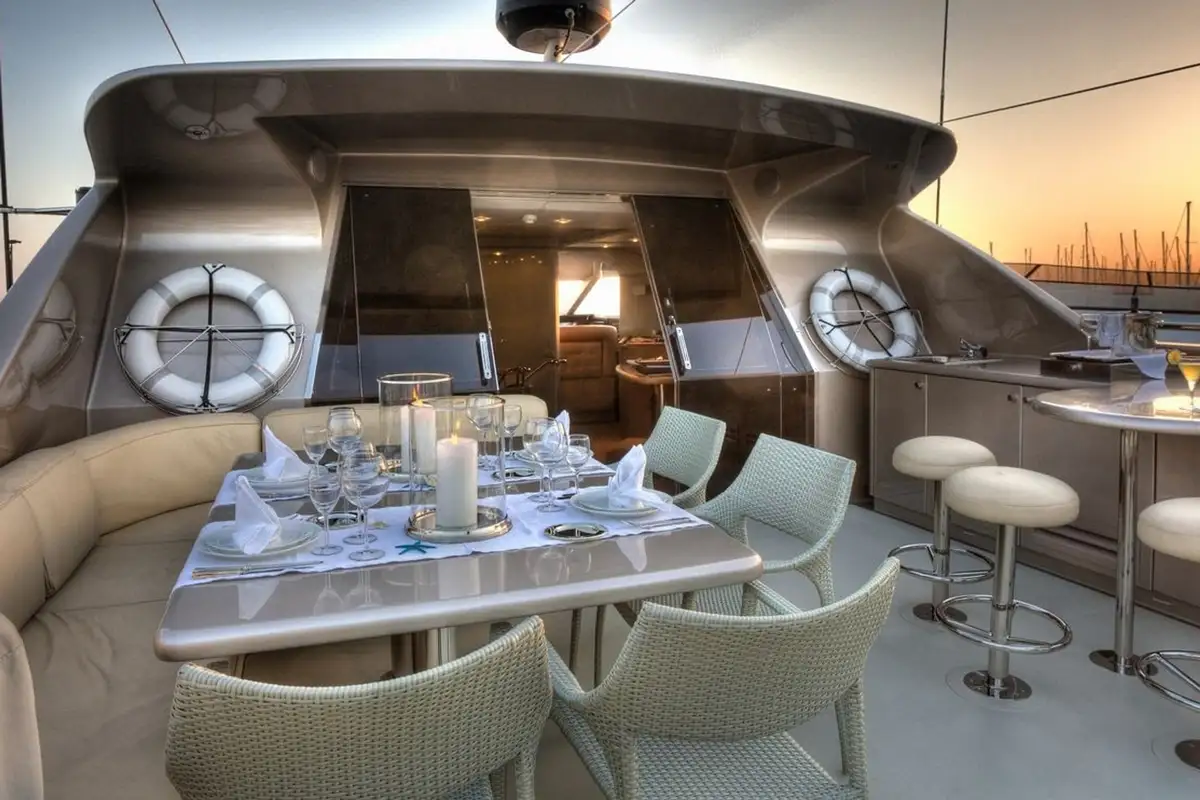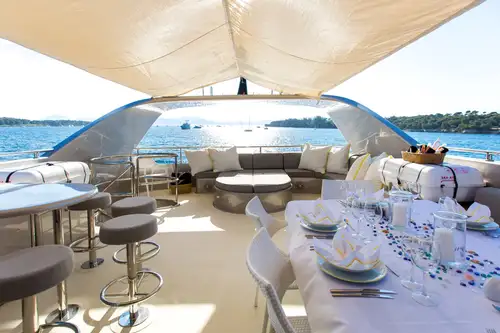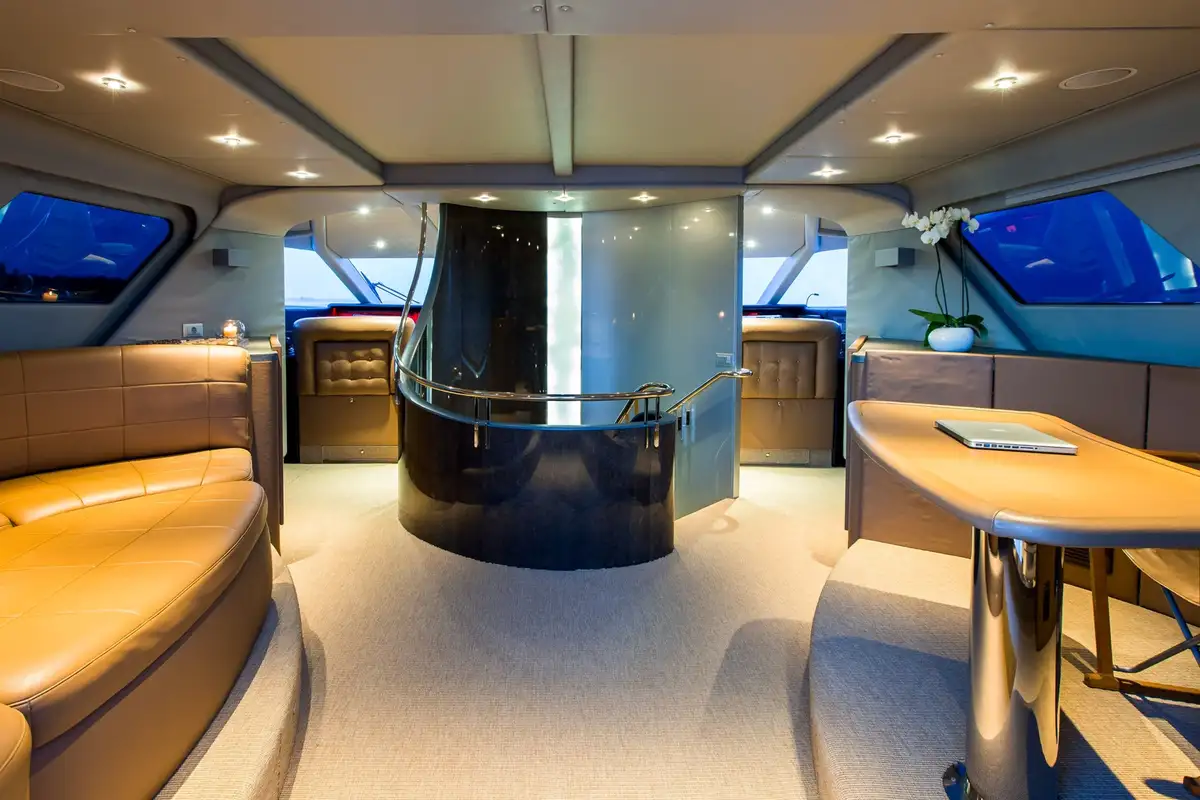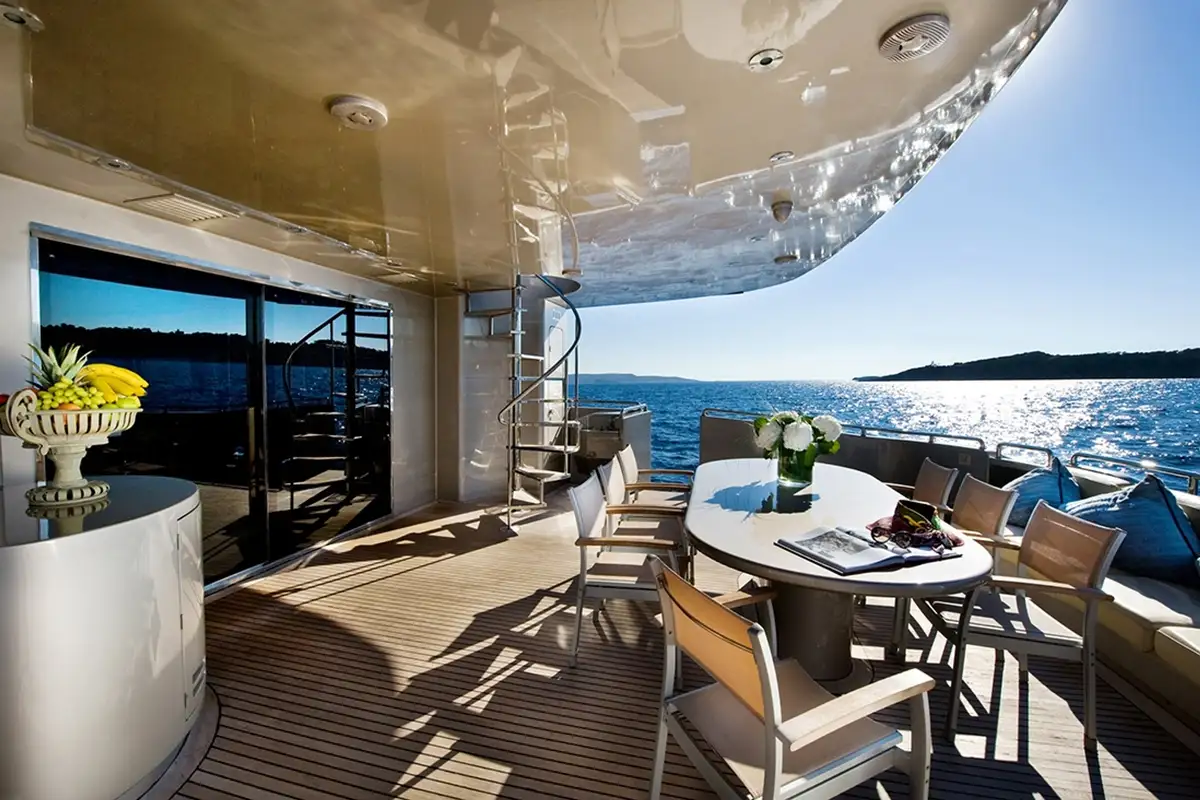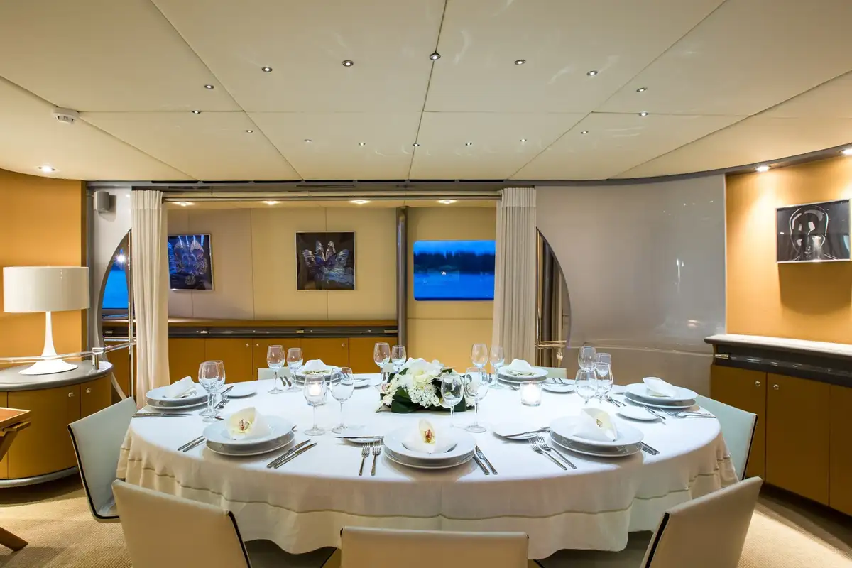 Ten guests are accommodated across four cabins on the lower deck- all of which feature modern furnishings and understated features. In 2007 and again in 2016, she underwent full refurbishments when all the interiors were upgraded to ensure she remains fresh and contemporary. The master suite is located forward and fills the full width of the yacht with a king-sized bed, large bathroom with jacuzzi spa bath set out on a semi-circular floorplan. The bedroom and bathroom is separated by a glass panel to provide a feeling of a much greater space; at the flick of a switch this glass can turn opaque or clear. There are a further three suites- two double cabins and a quadruple cabin, all with en suite shower rooms.