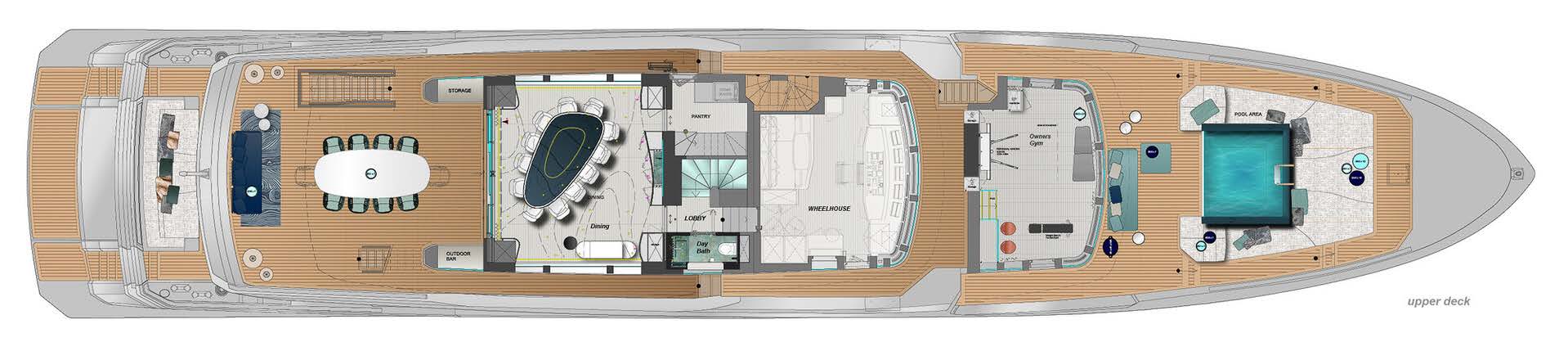 - Main deck master cabin connected to private owner's gym on the upper deck
