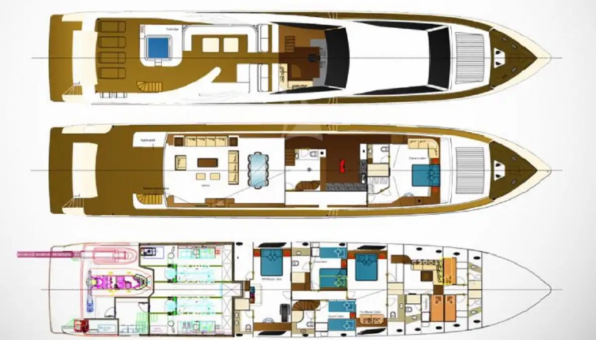 On the lower deck, two full-beam VIP suites are generously appointed, each with large hull windows, a sofa, a desk, and an en suite bathroom. These luxurious cabins provide guests with an exceptional level of privacy and space. Two additional twin suites (one with a pullman berth) make this an ideal choice for families or mixed groups of friends.