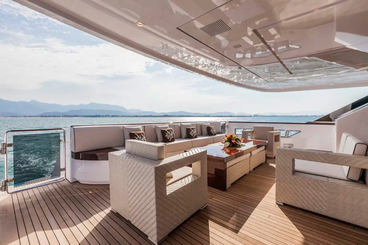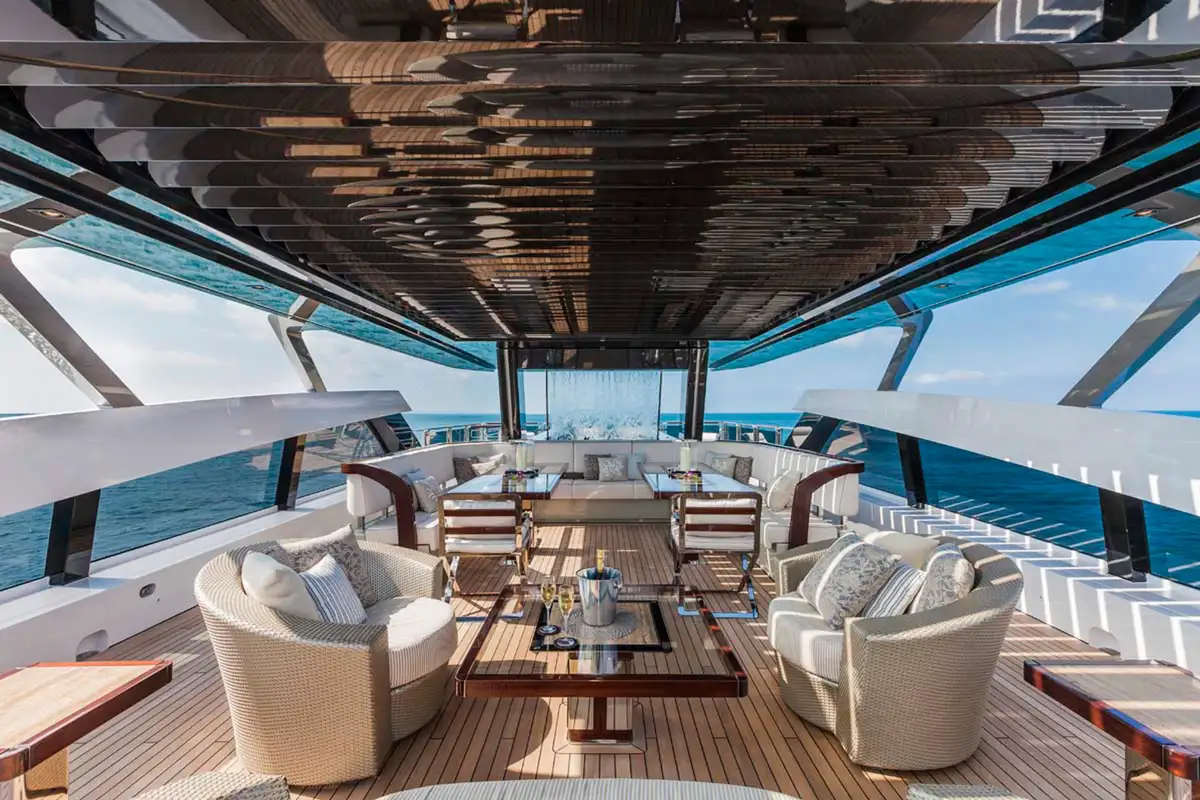 The sprawling sun deck is her showstopper. With a fully equipped bar, BBQ, al fresco dining, and sunloungers, it’s crowned by a 3.5m pool with its own waterfall. A louvered hardtop roof adjusts for optimal shade, while forward is an observation sofa ideal for soaking up panoramic views.