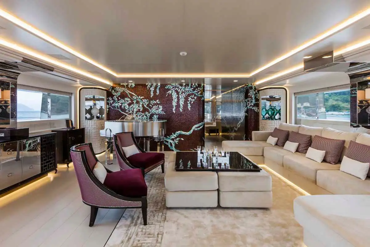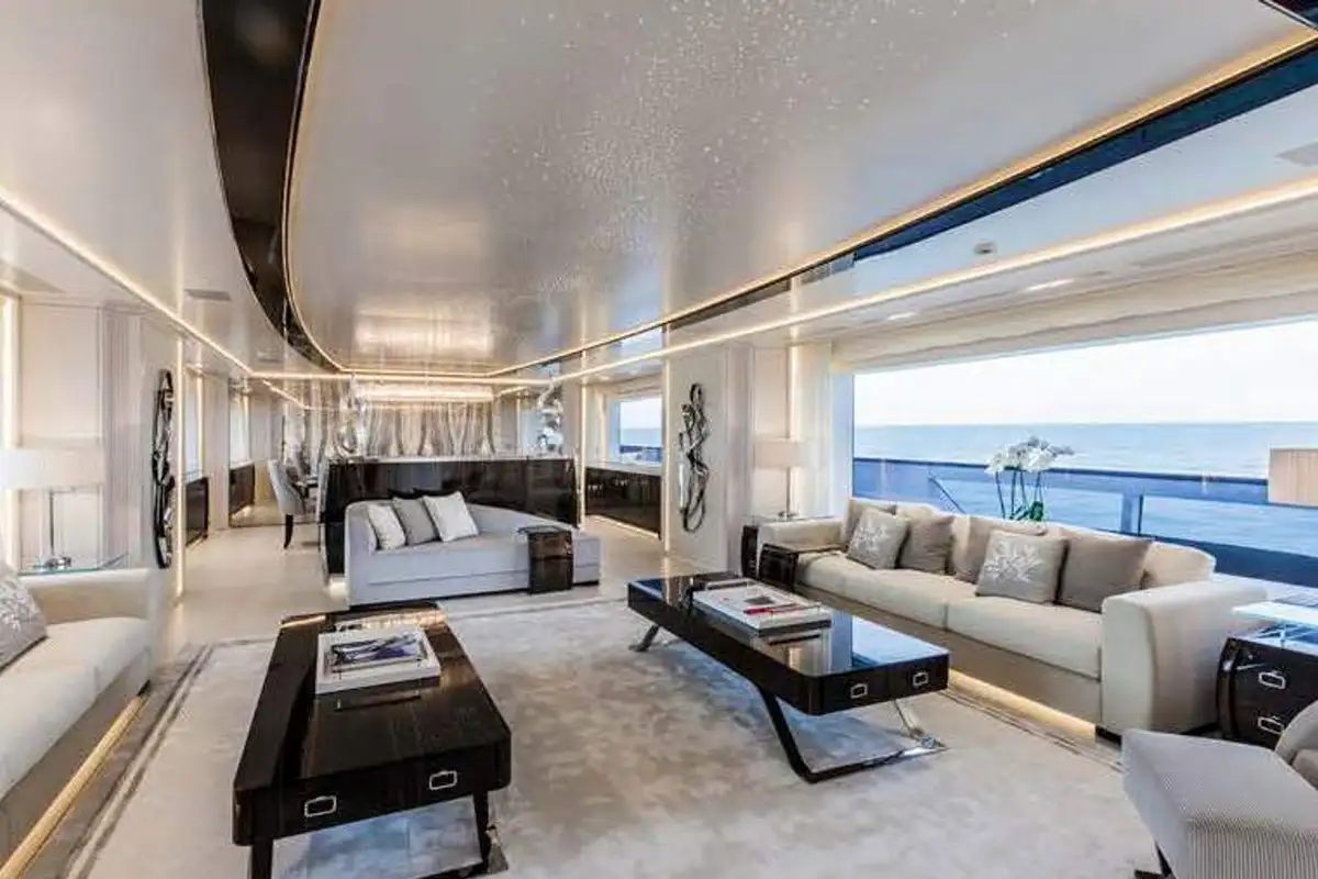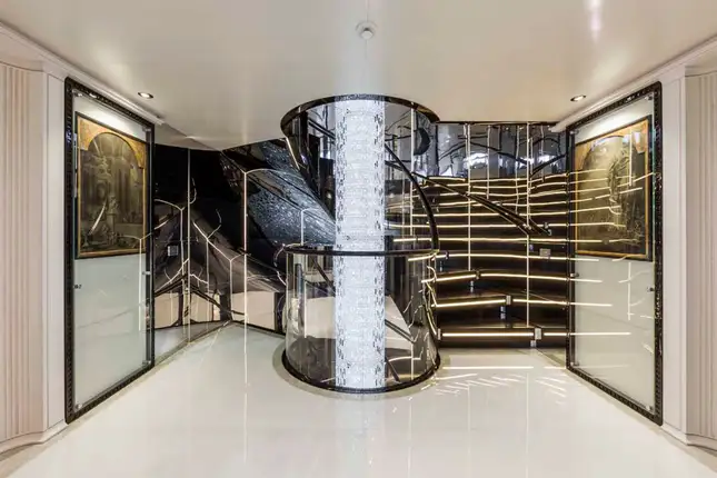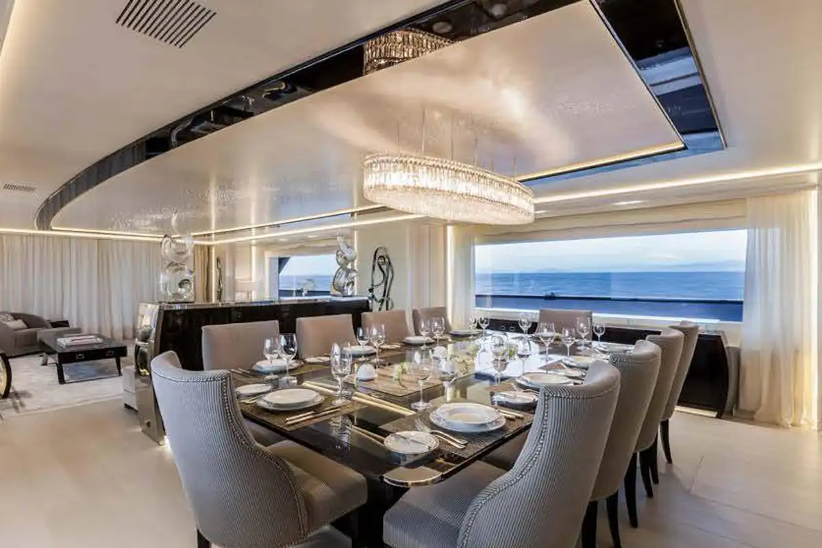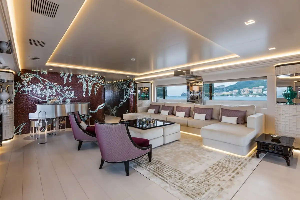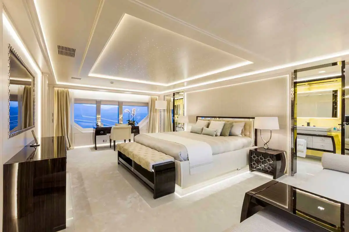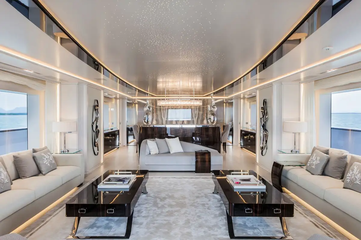 Step inside and discover the main deck lounge, whose gem-studded ceiling casts sparkling reflections. This open space flows into a formal dining area for eight, illuminated by a Swarovski chandelier. The upper deck’s lounge is equally impressive, featuring a self-playing, silver-wrapped piano, and a cinema projector – all framed by handmade mosaic accents.