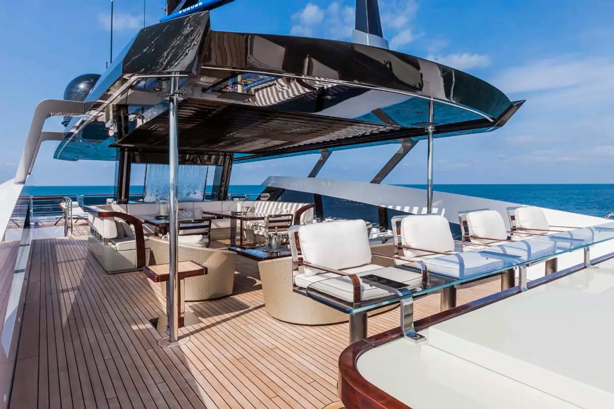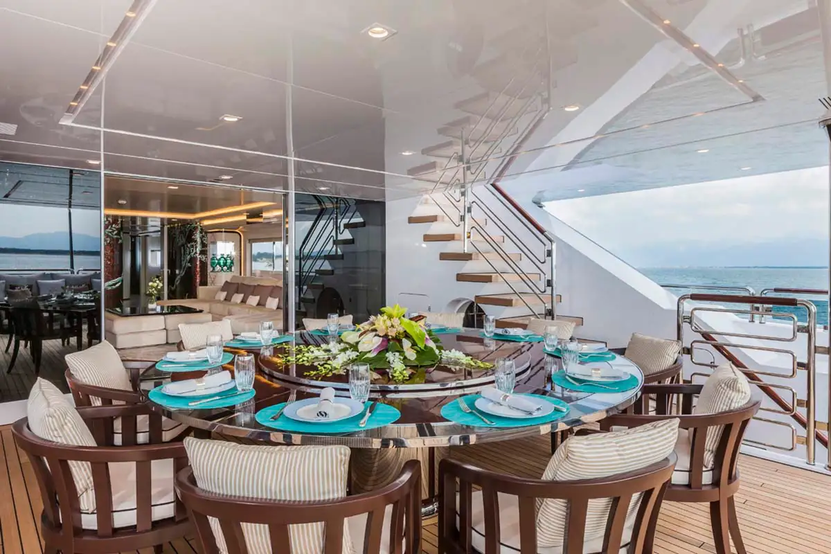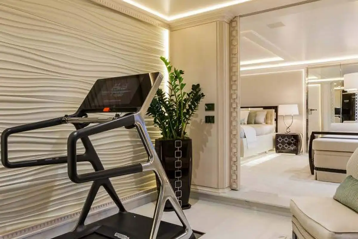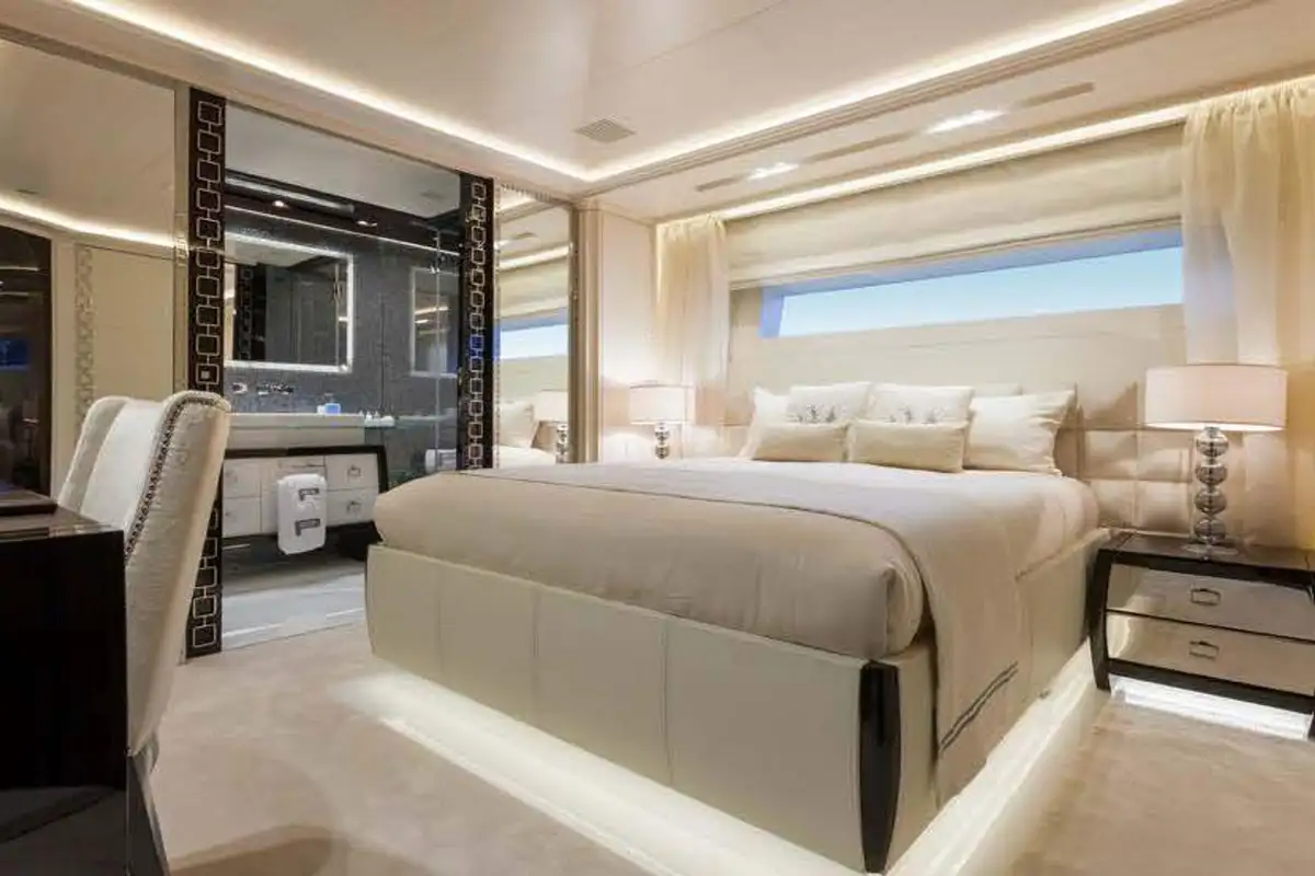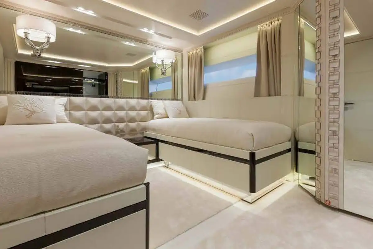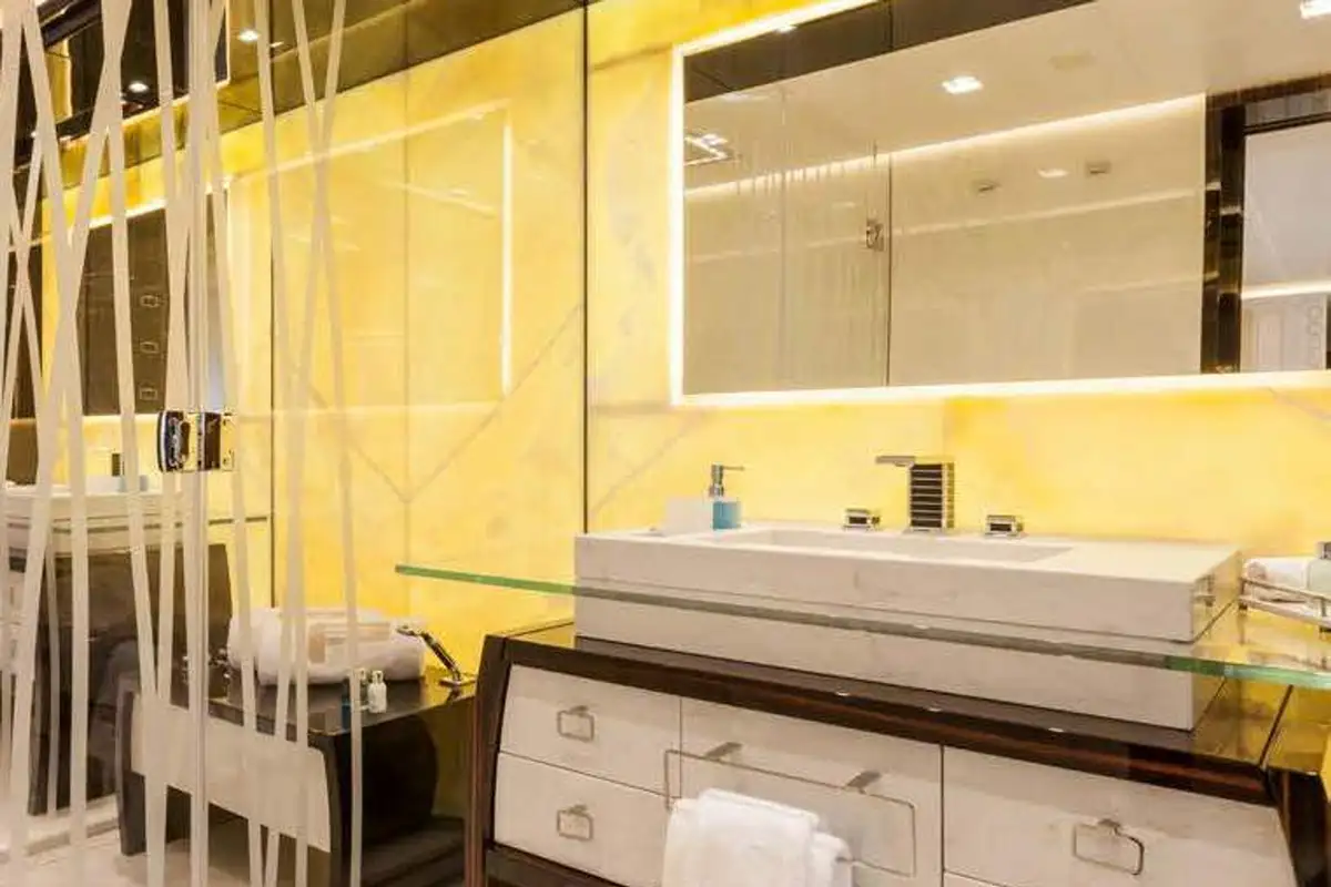 Step inside and discover the main deck lounge, whose gem-studded ceiling casts sparkling reflections. This open space flows into a formal dining area for eight, illuminated by a Swarovski chandelier. The upper deck’s lounge is equally impressive, featuring a self-playing, silver-wrapped piano, and a cinema projector – all framed by handmade mosaic accents.