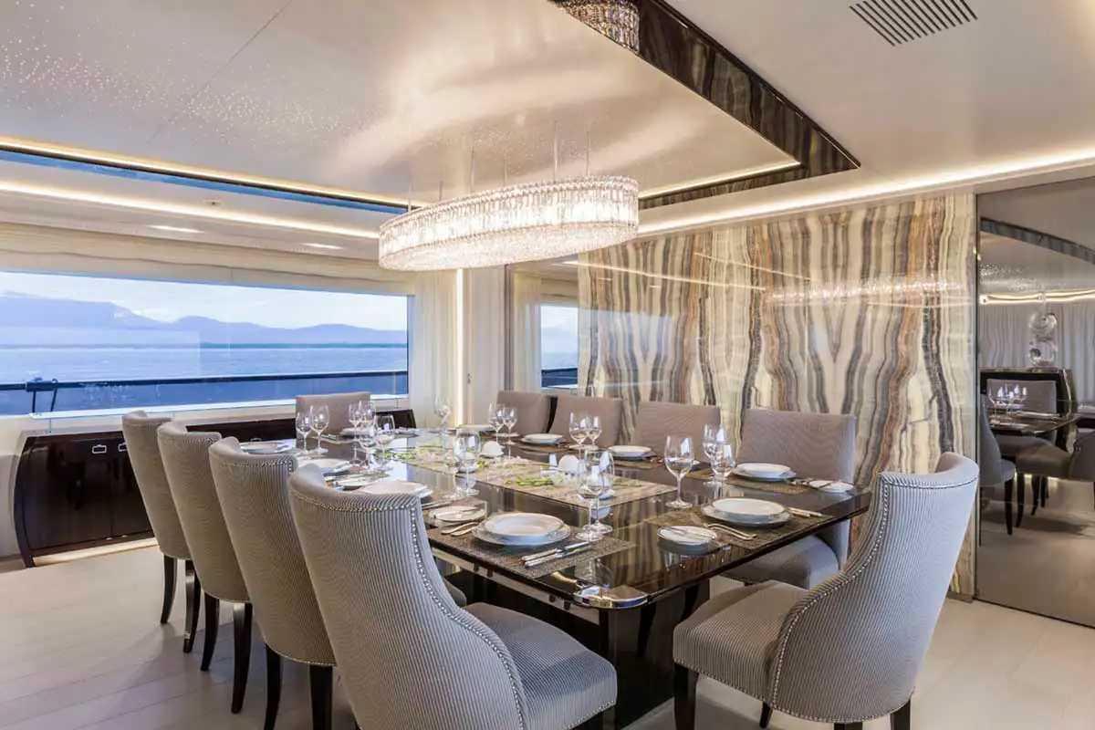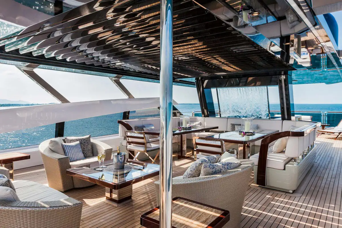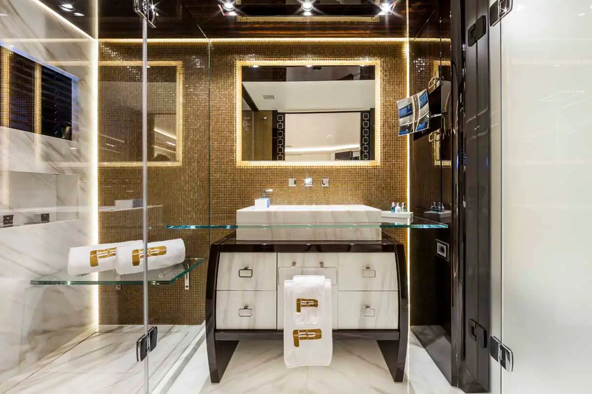 On board PARILLION, glittering design meets high-performance. Dripping in crystal, glasswork, and coloured mosaics, she’s a floating masterpiece. And at the heart of her appeal? An array of standout amenities: a waterfall pool, cinema projector, beach club, and all the latest watertoys.