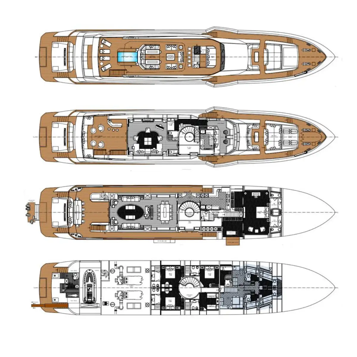 The sprawling sun deck is her showstopper. With a fully equipped bar, BBQ, al fresco dining, and sunloungers, it’s crowned by a 3.5m pool with its own waterfall. A louvered hardtop roof adjusts for optimal shade, while forward is an observation sofa ideal for soaking up panoramic views.
