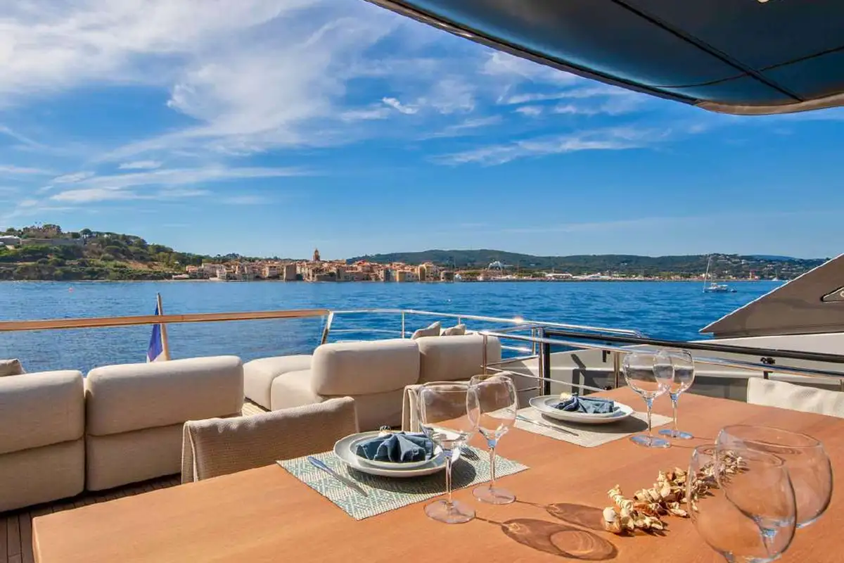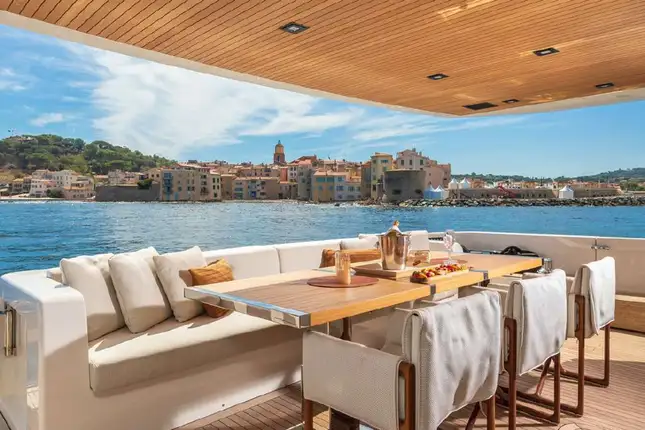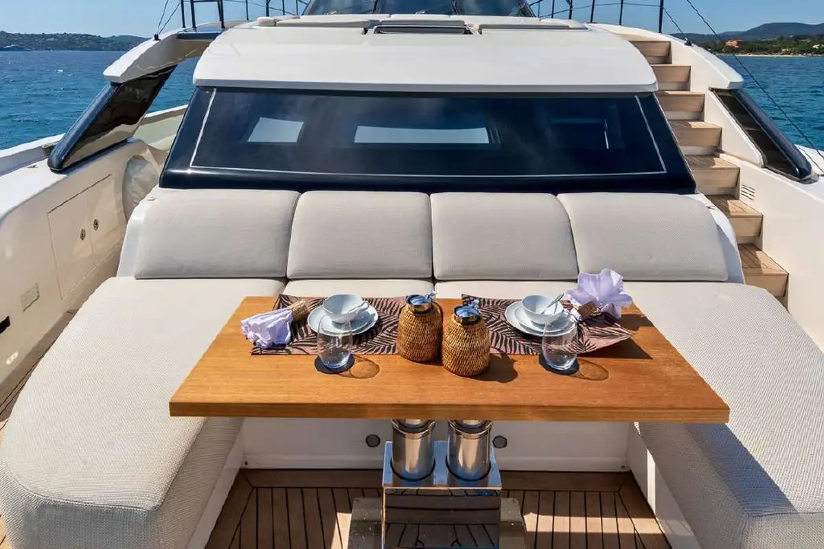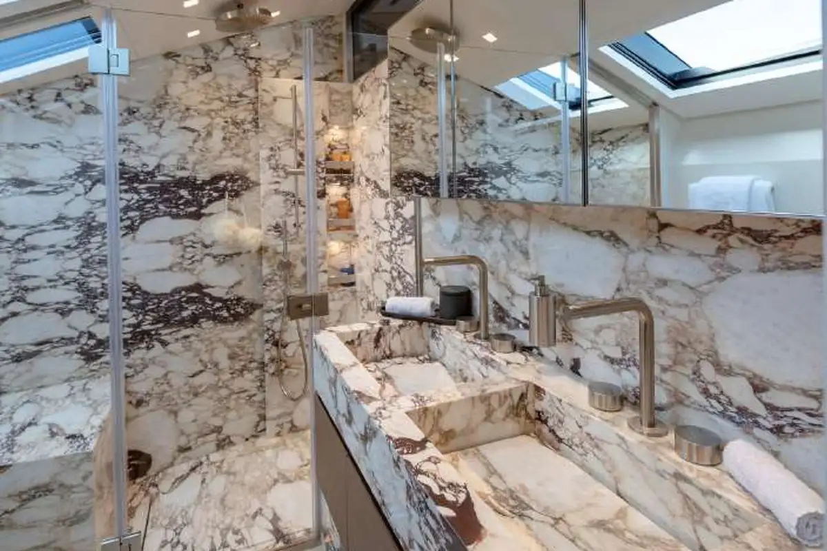 The expansive flybridge invites guests to unwind in style, complete with a shaded al fresco dining area, sun loungers, and panoramic views—ideal for sunset cocktails or relaxed morning coffees. On the main deck aft, a convivial lounge space flows seamlessly into the main deck lounge, while the foredeck provides a private retreat with sunpads and informal seating for quiet moments at sea.