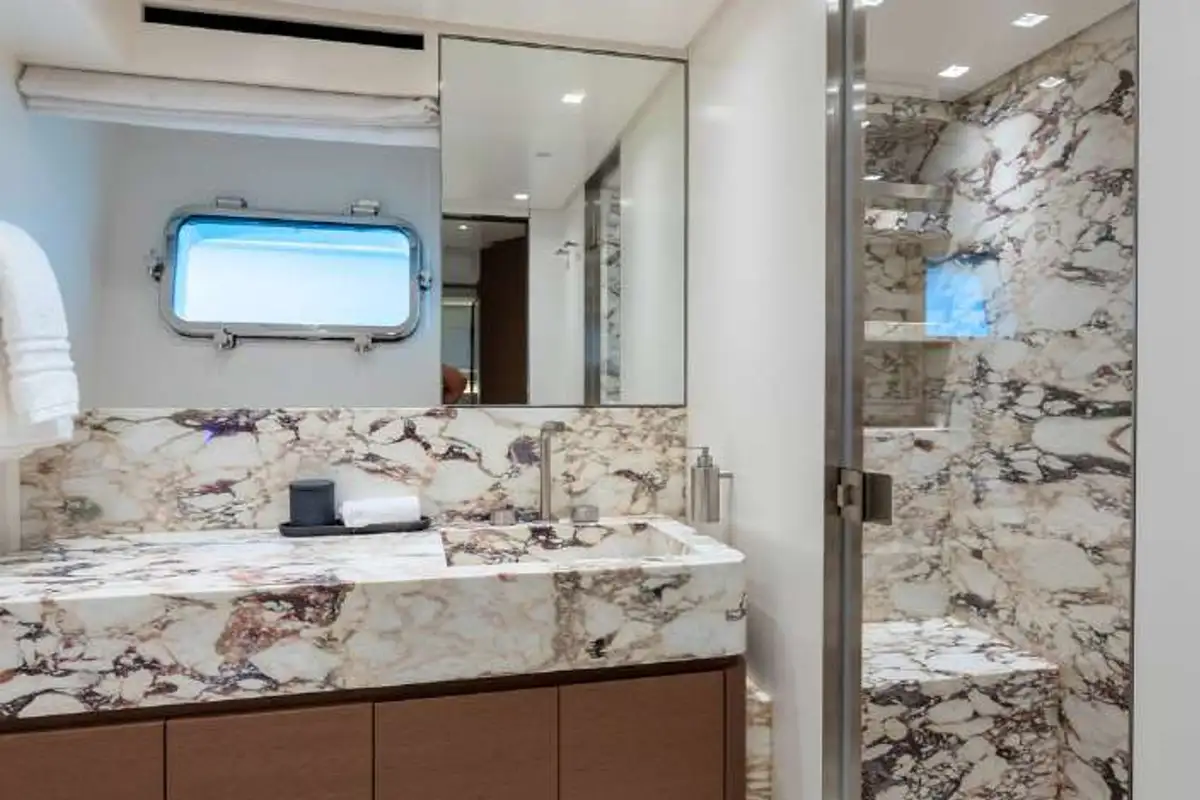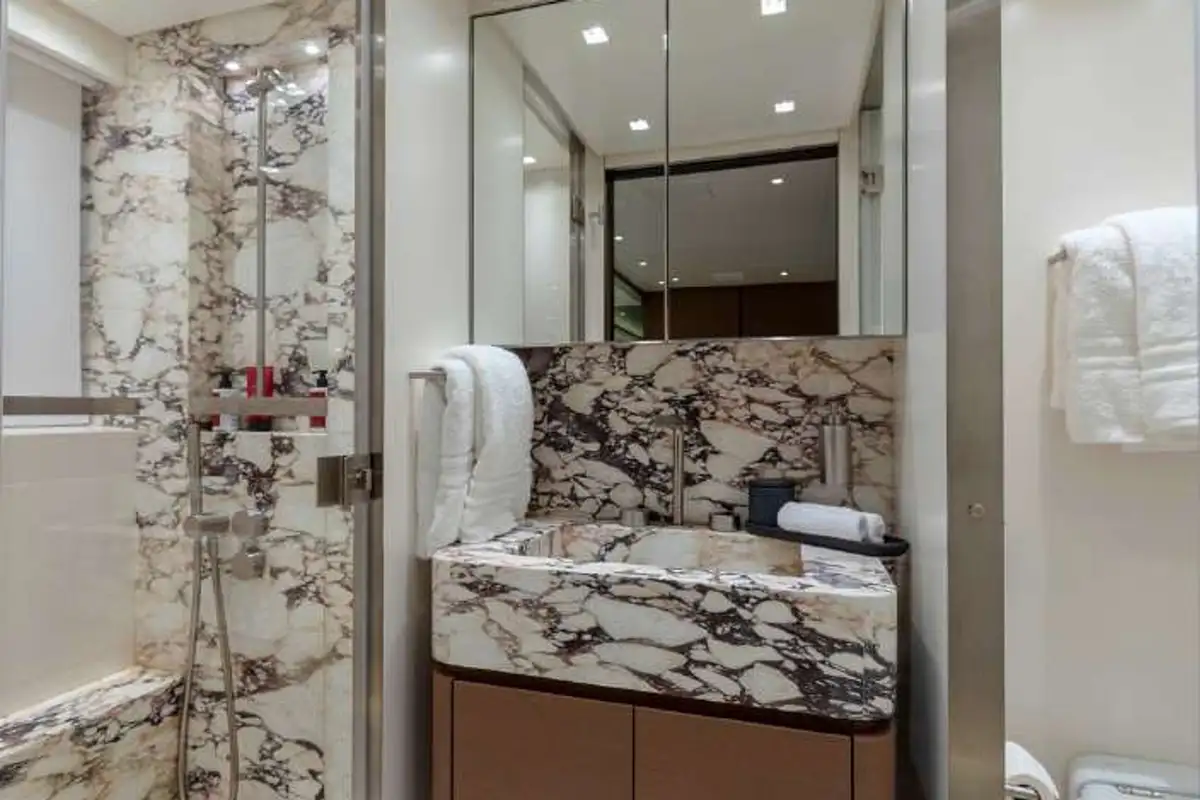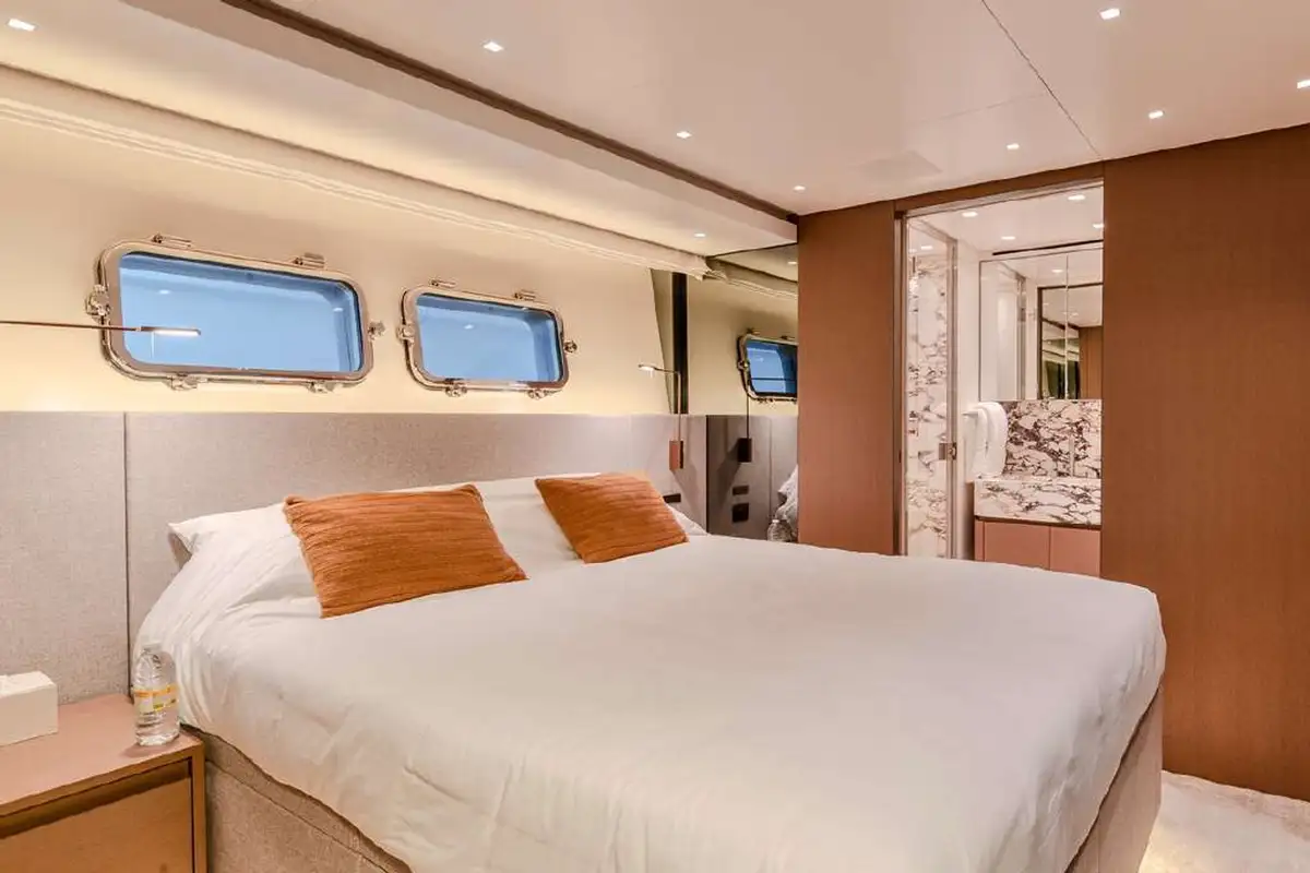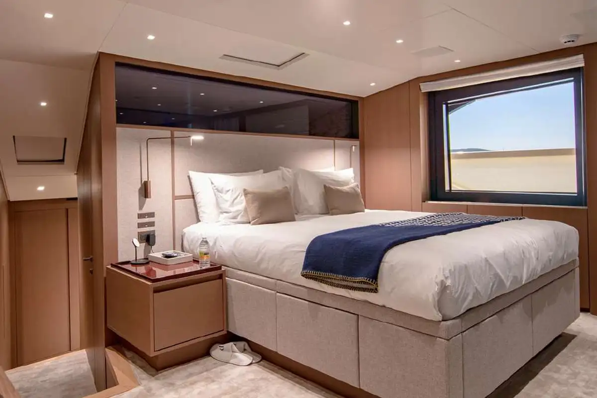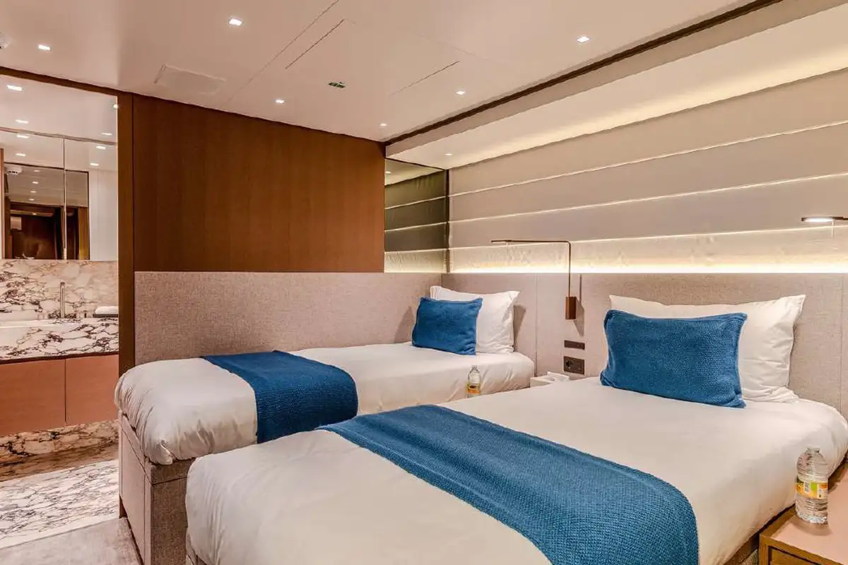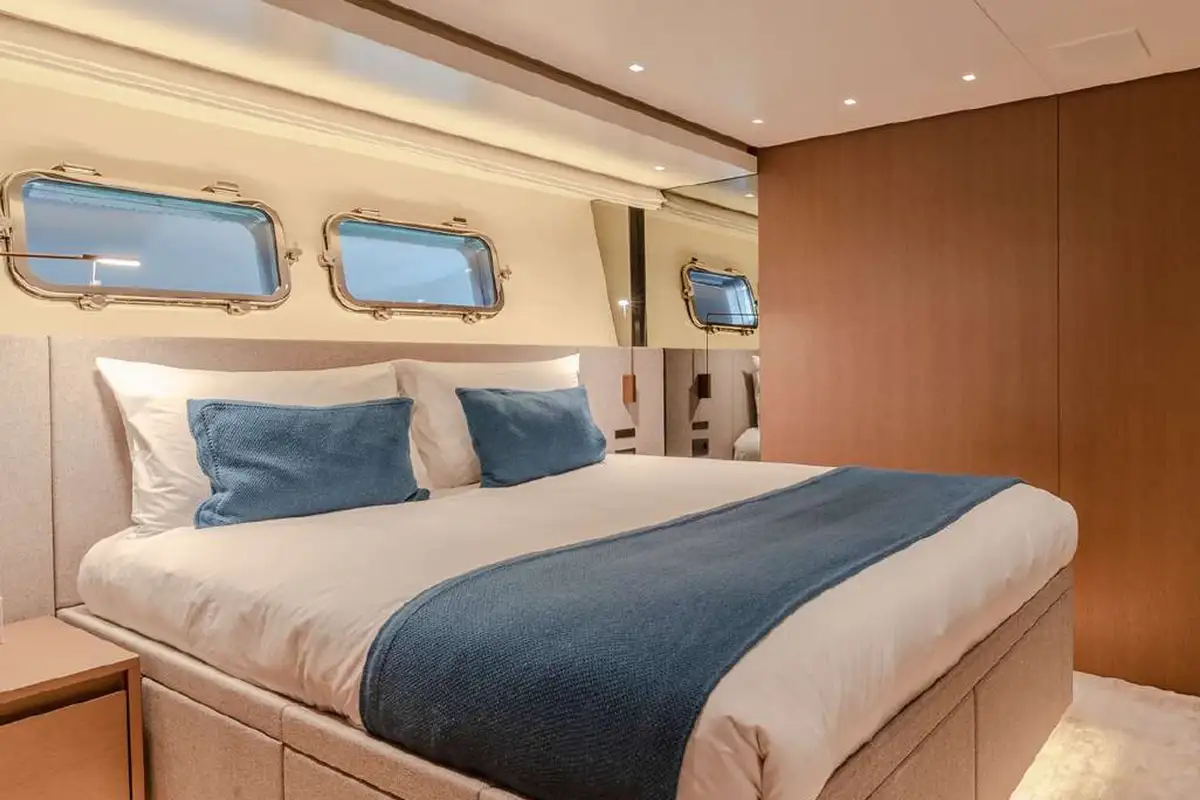 PAUSE accommodates up to eight guests across four beautifully appointed cabins, each designed with a soothing, modern flair. The master suite offers generous proportions, complete with ensuite facilities and ample storage. Additional guest cabins, comprising a VIP and two double cabins, ensure versatility for families and groups alike.