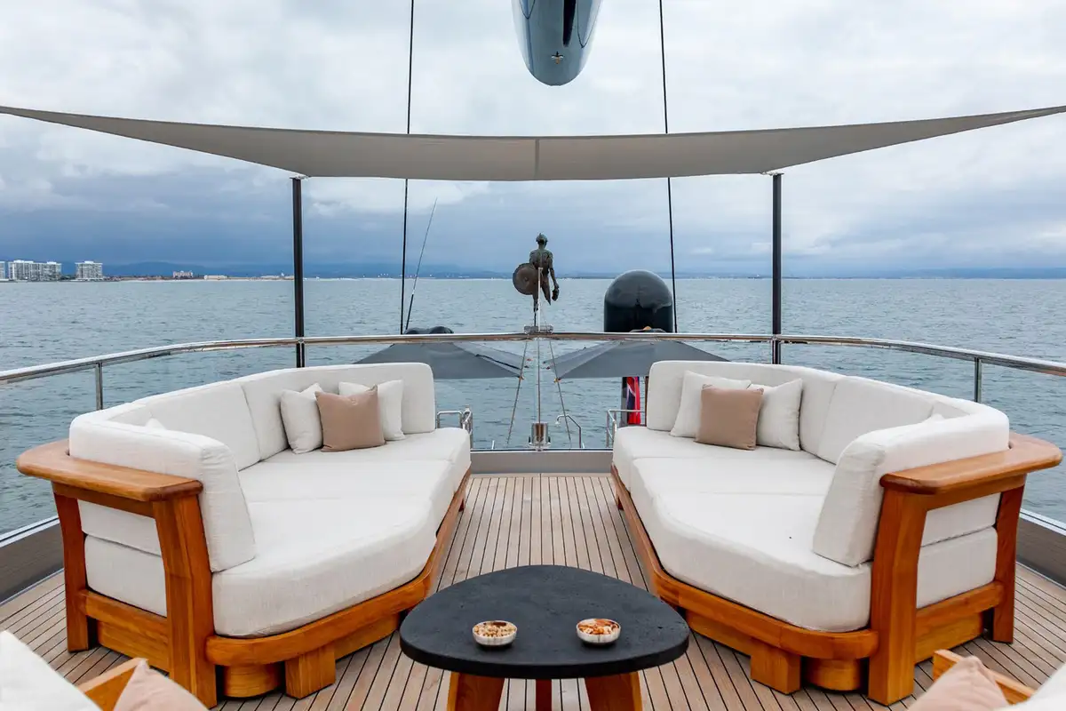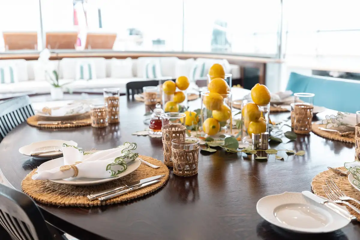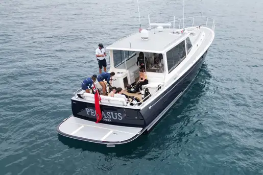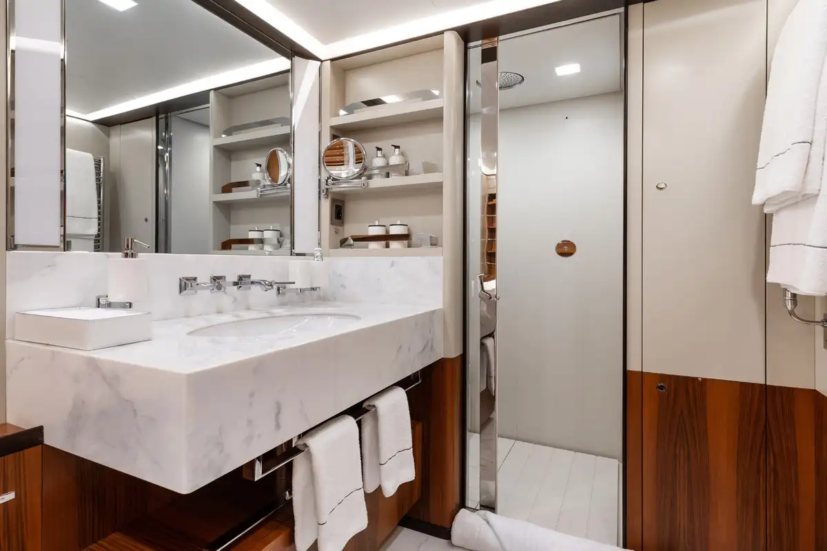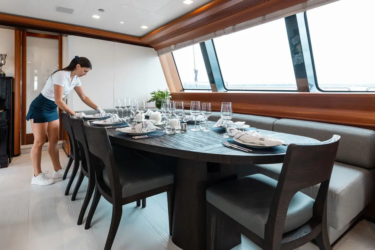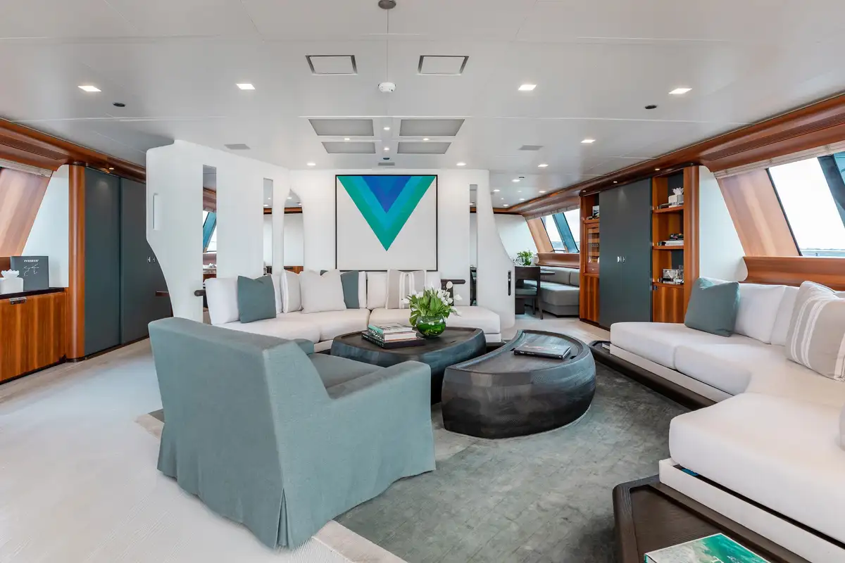 During a charter aboard PERSEUS^3 guests can experience fun and relaxation both on and off the water. Wake up with a refreshing morning swim, diving off the fold down swim platform. Enjoy a leisurely breakfast in the main deck cockpit – the preferred spot for al fresco dining, protected from the elements by curved glass. Make the most of the peace up on the large flybridge where there is a good selection of sofas, sun pads and cushions to laze around on. Alternatively, chill out with family or friends on the foredeck where there is a heated swimming pool with counter current and sun loungers.