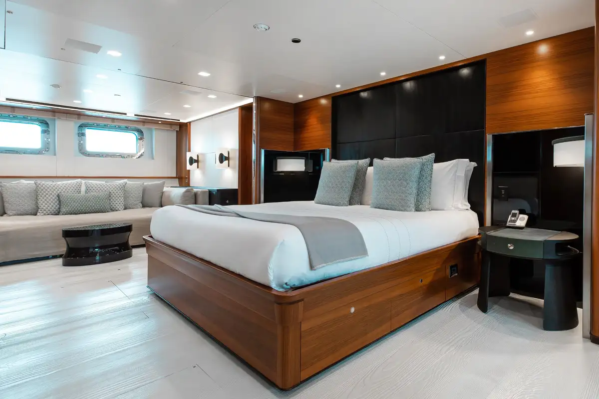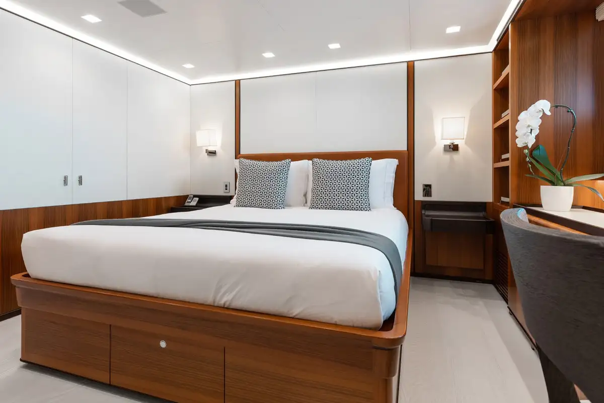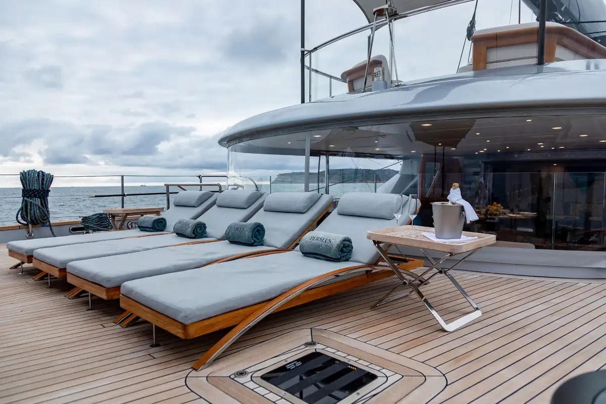 When it’s time to call it a day, the accommodation on PERSEUS^3 is ideal for groups of family or friends. The full beam master suite has its own private lounge and study, which can be split into two separate cabins to create a sixth cabin. The rest of the guest accommodation comprises two VIP cabins, two twin cabins and one convertible cabin, allowing for all manner of arrangements depending on the charter party. Her successful charter record is a credit to her 11 crew who are on hand to ensure that you feel completely at home on this superb sailing yacht.
