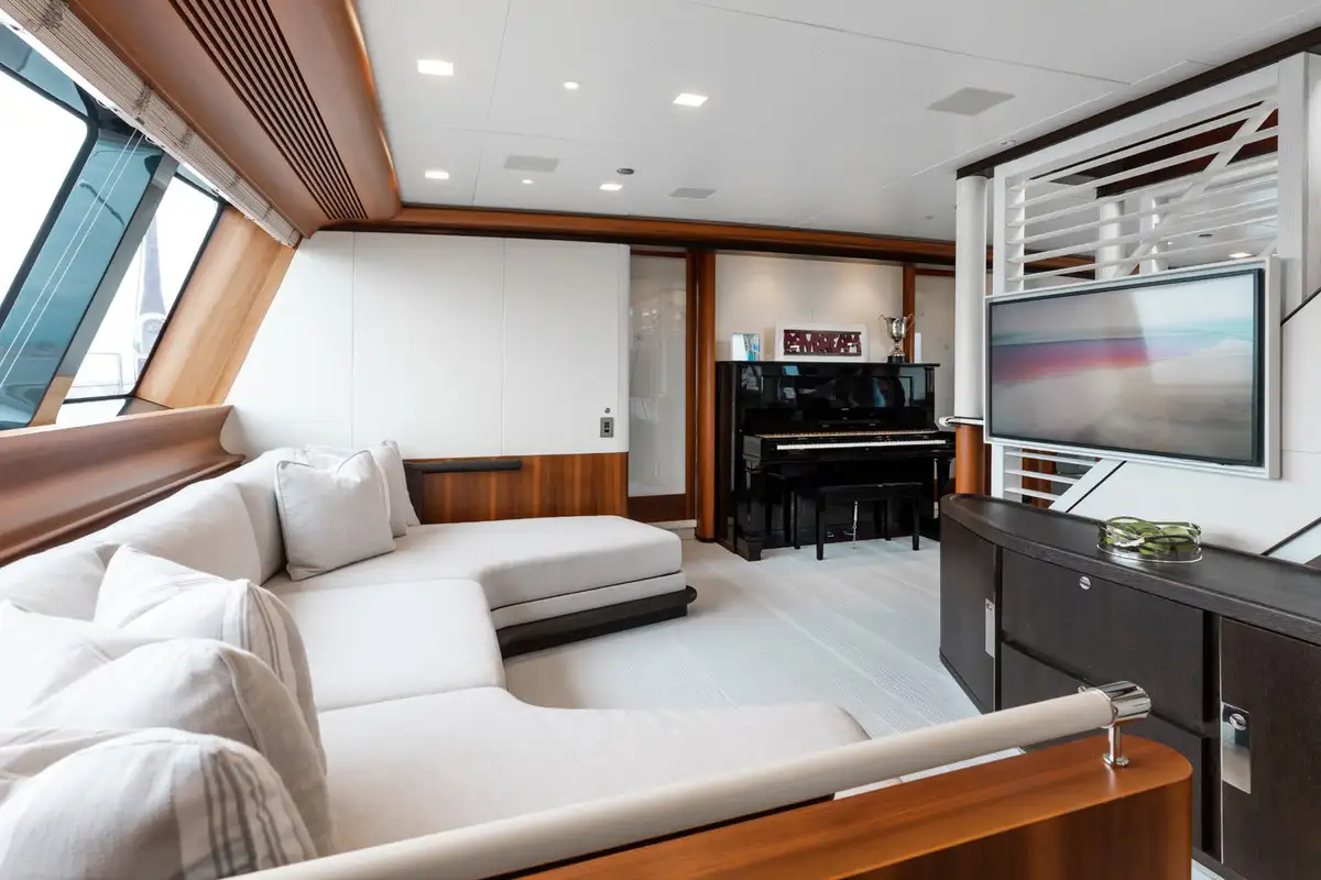 At the end of the afternoon it’s time to freshen up and step up on deck for a sundowner, while your talented chef prepares an exquisite dinner to be served either in the sheltered cockpit or in the main saloon dining area accompanied by music from the self-playing piano. Sit up late with a nightcap on the flybridge or lose yourself with a movie in the main saloon complete with deep comfy sofas.