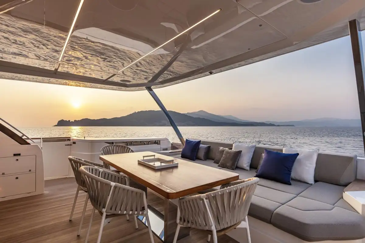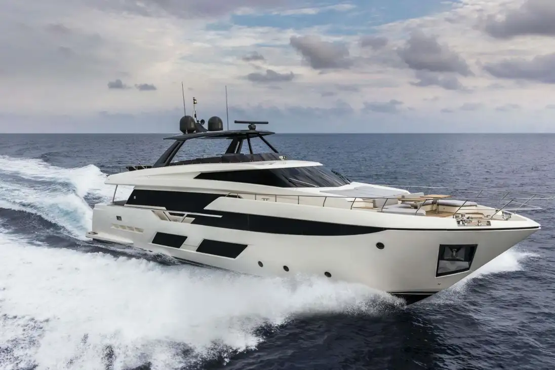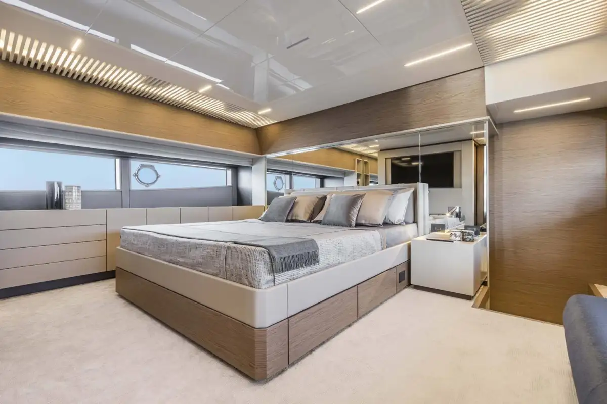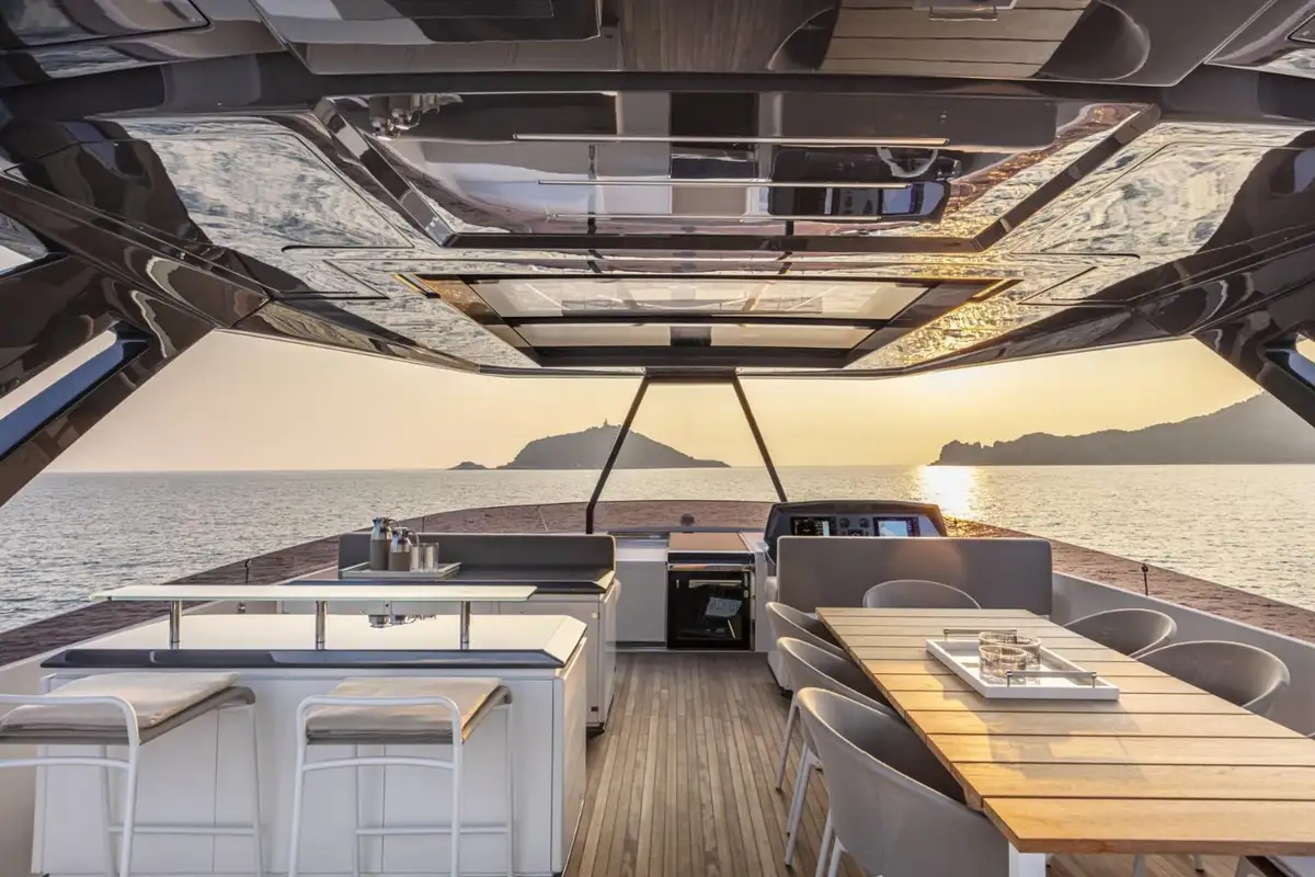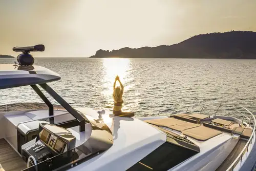 The majestic Ferretti Yachts 920 instantly catches the eye. Its dynamic, irrepressible profile develops the stylistic design features that have led to the international success of recently launched models and have completely modernised the fleet. In addition to the raised forward section, other stunning aspects include the remarkable number of relaxation spaces and the luxurious furnishings in the outdoor areas. The magnificent interiors rival the versions found in higher category models.