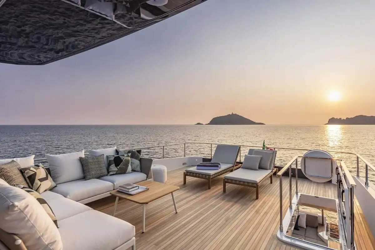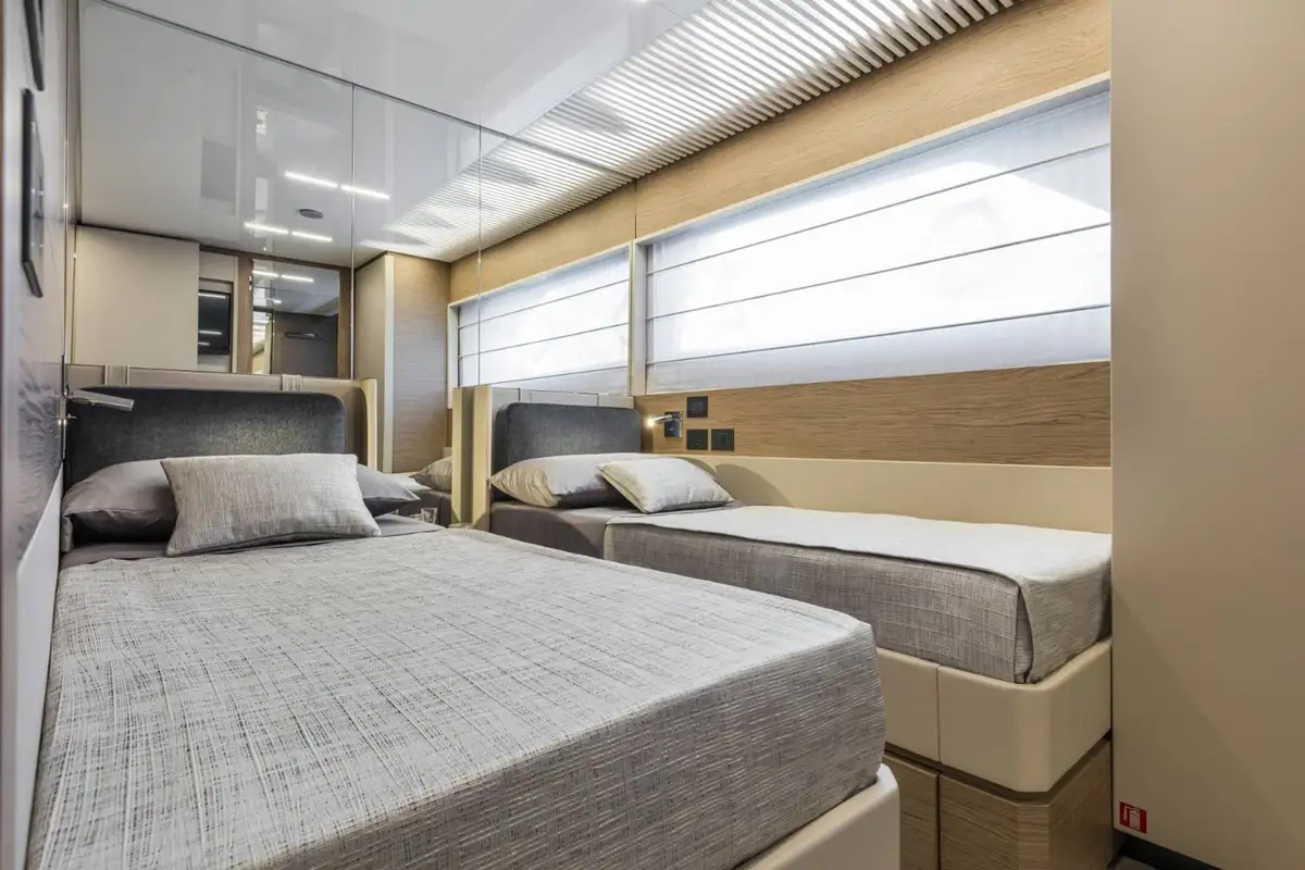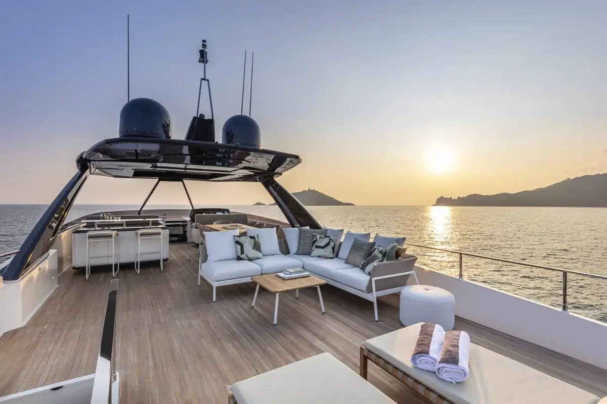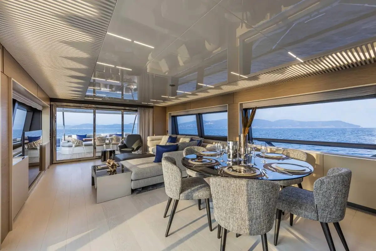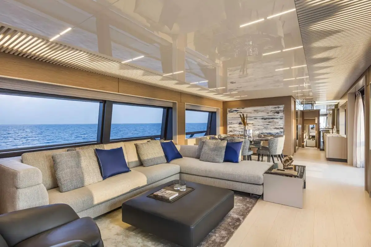 The majestic Ferretti Yachts 920 instantly catches the eye. Its dynamic, irrepressible profile develops the stylistic design features that have led to the international success of recently launched models and have completely modernised the fleet. In addition to the raised forward section, other stunning aspects include the remarkable number of relaxation spaces and the luxurious furnishings in the outdoor areas. The magnificent interiors rival the versions found in higher category models.