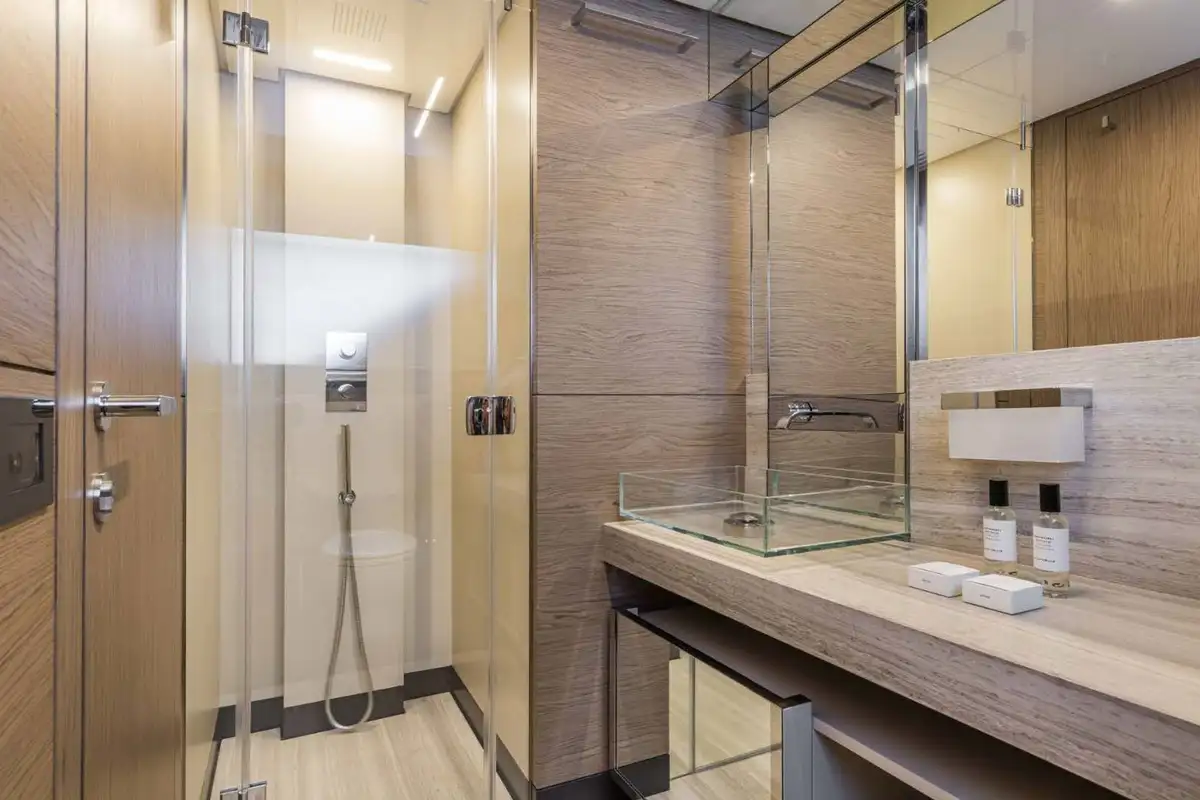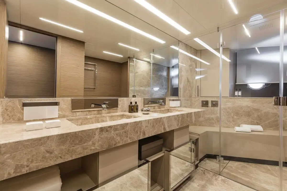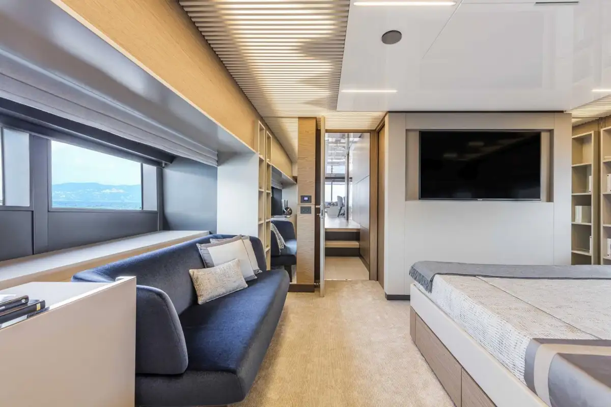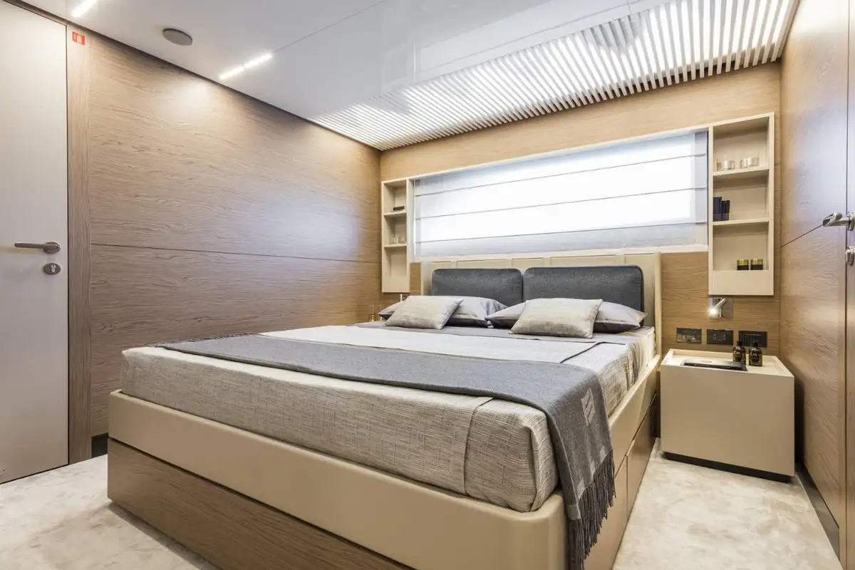 M/Y Piola, Ferretti Yachts 920, is an exceptional yacht not just in terms of its size but also because of its innovative nature. The splendid flybridge stands out due to the ground-breaking introduction of the “wide body” concept. In addition to giving the yacht an imposing presence on the water, the raised forward section of the hull has also allowed a “wide-body” master suite to be included on the main deck. The yacht’s “bold” character is emphasized by the gunwale, which continues beyond the bulwark walkways and “cuts” into the design of the windows in the master cabin.