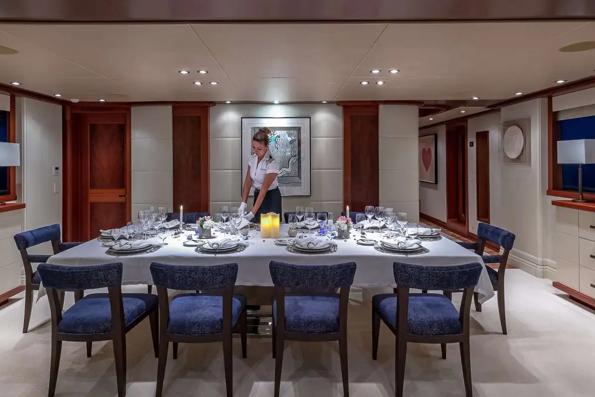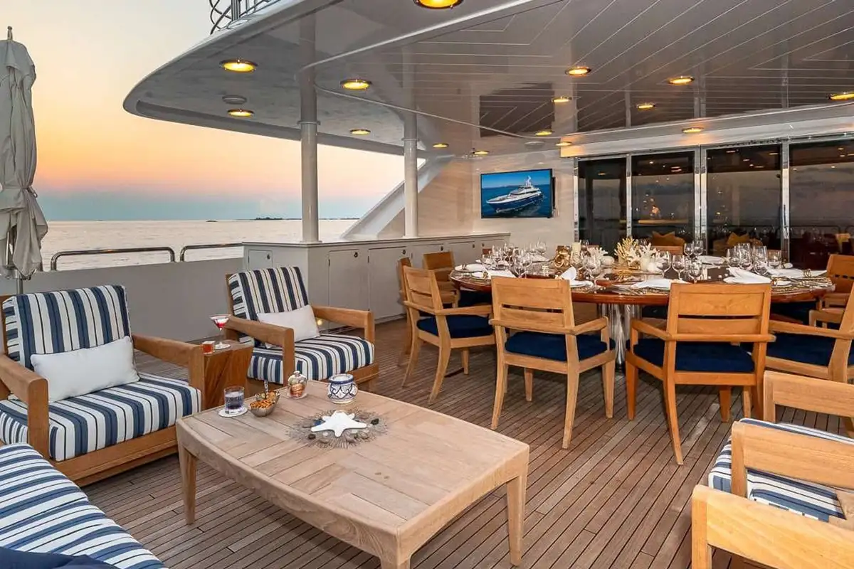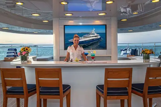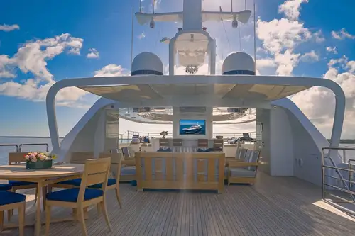 An elevator runs from the guest accommodation on the lower deck to all three decks above; enabling you and your guests to effortlessly access any of the decks for the delights that PISCES’ chef has in store for you; whether it’s breakfast, lunch or dinner or snacks when you fancy them, you can expect mouth-watering cuisine anywhere on board, delivered by PISCES’ ever-attentive crew. There is a formal dining area in the main deck saloon and a relaxed dining area on the aft deck. On the upper deck is the shaded al fresco formal dining area while the sun deck offers a relaxing lounge and bar area.
