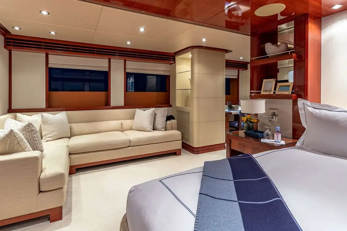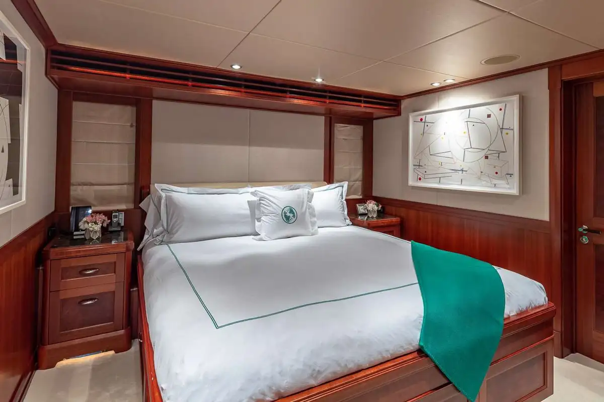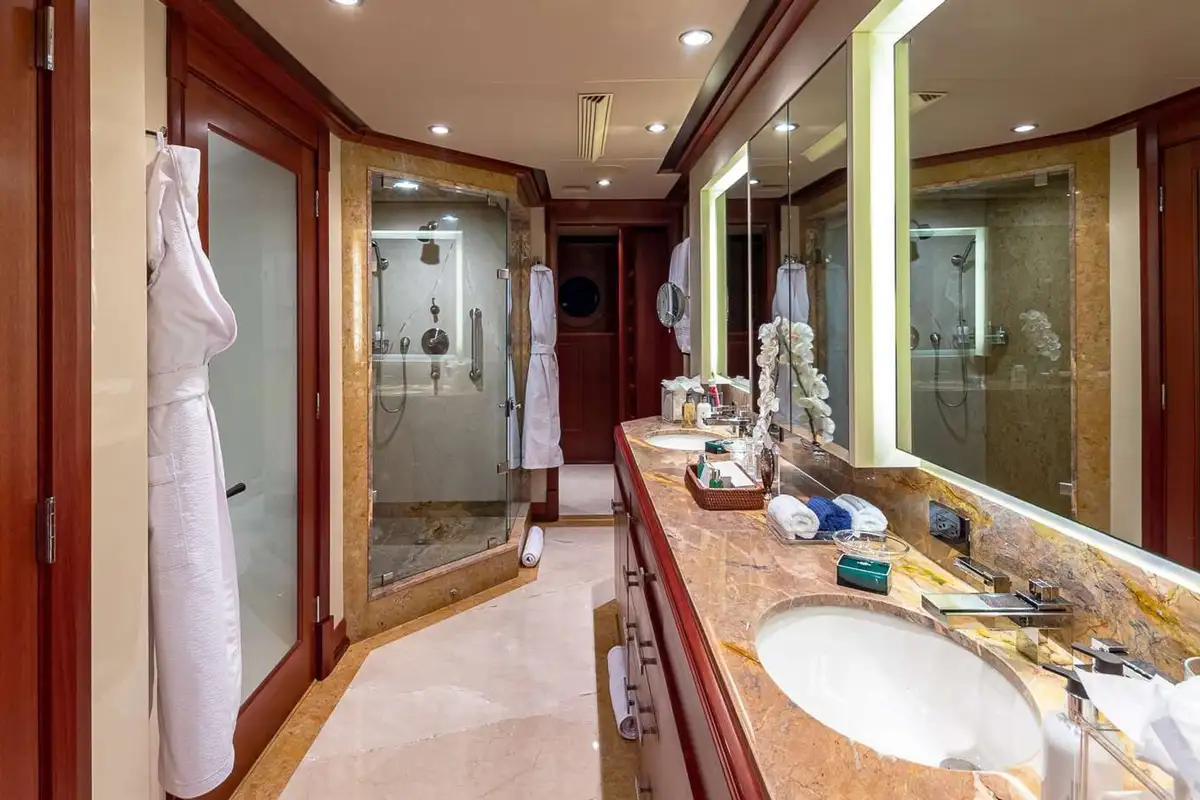 PISCES can host 11 guests in five beautiful and tastefully decorated guest suites. On the main deck, the full-beam master suite is forward and has a private office and lounge area, a king-sized berth and a full-beam en suite bathroom with bath, separate shower compartment and dressing room. On the lower deck, there are two double VIP suites both with king-sized berths, there’s a fourth double cabin and a twin-berth cabin with a pullman berth; all guest cabins have en suite marble bathrooms.
