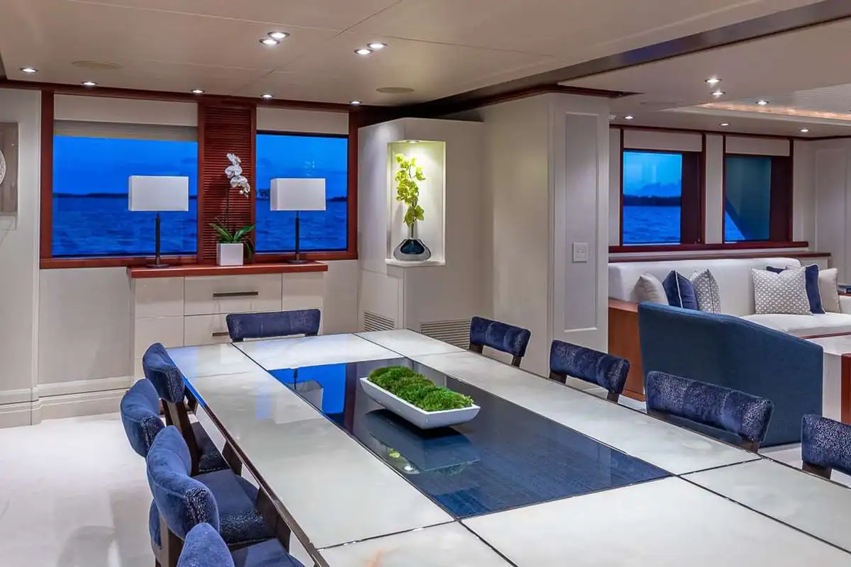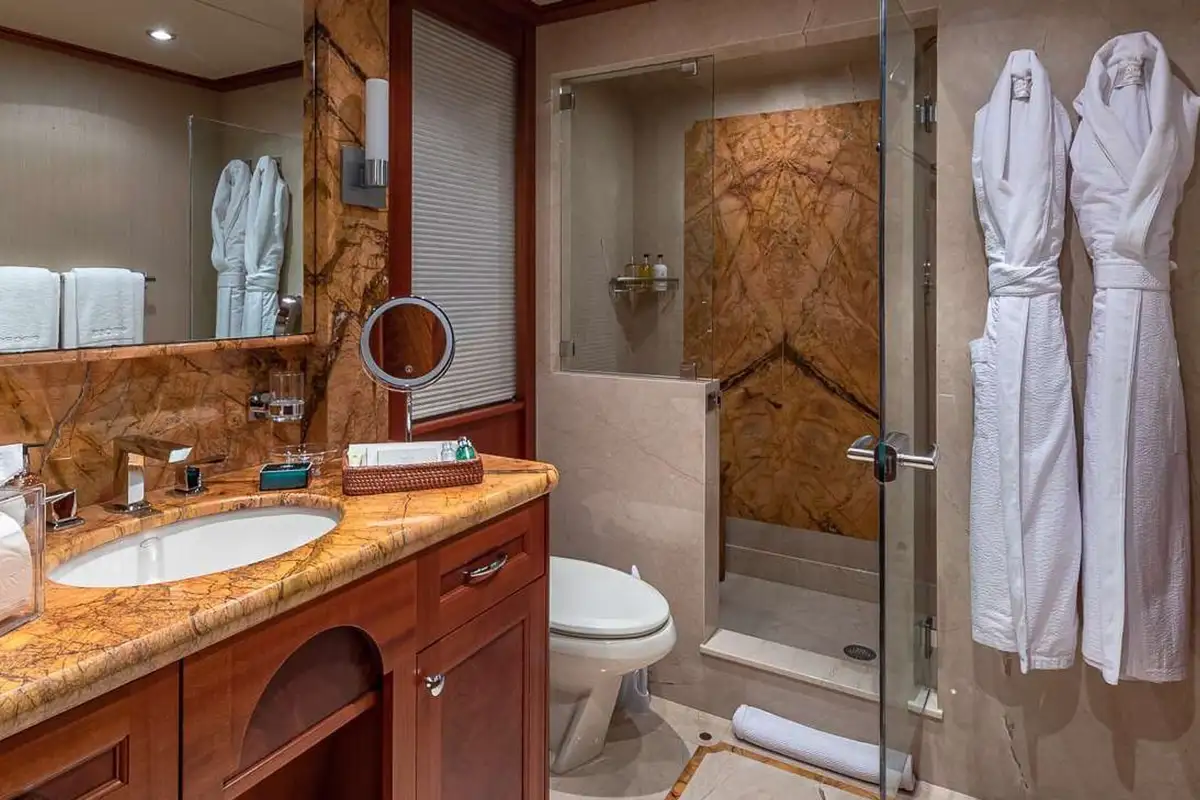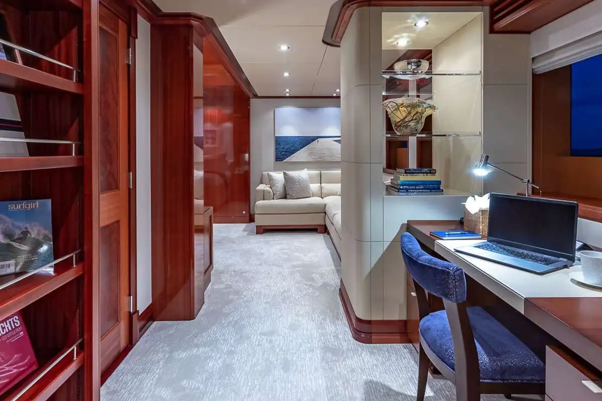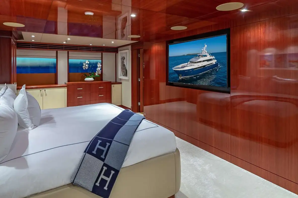 PISCES can host 11 guests in five beautiful and tastefully decorated guest suites. On the main deck, the full-beam master suite is forward and has a private office and lounge area, a king-sized berth and a full-beam en suite bathroom with bath, separate shower compartment and dressing room. On the lower deck, there are two double VIP suites both with king-sized berths, there’s a fourth double cabin and a twin-berth cabin with a pullman berth; all guest cabins have en suite marble bathrooms.