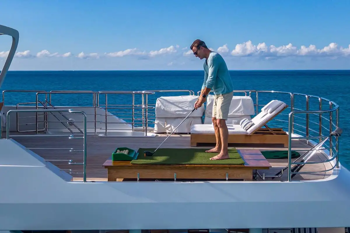 PISCES is set up for you and your guests to enjoy time on board, whatever their passion, pastime or age. Still gleaming from her 2021 interior and exterior refit, she has a tender garage packed full of toys and equipment, from towable inflatables, scuba equipment, surfboards and bodyboards to jetskis, SeaBobs, kayaks, kiteboards, windsurfers and even an E-foil, with her inflatable dock and pool (with jellyfish nets) there is plenty for everyone to enjoy time off PISCES. On board, there is no stopping you either, whether you want to drive eco-friendly golf balls (that are biodegradable and contain fish food) from the sun deck, relax on one of many sun lounger areas or have a run on the yacht’s treadmill you will not be at a loss for ways to keep you and your group entertained.