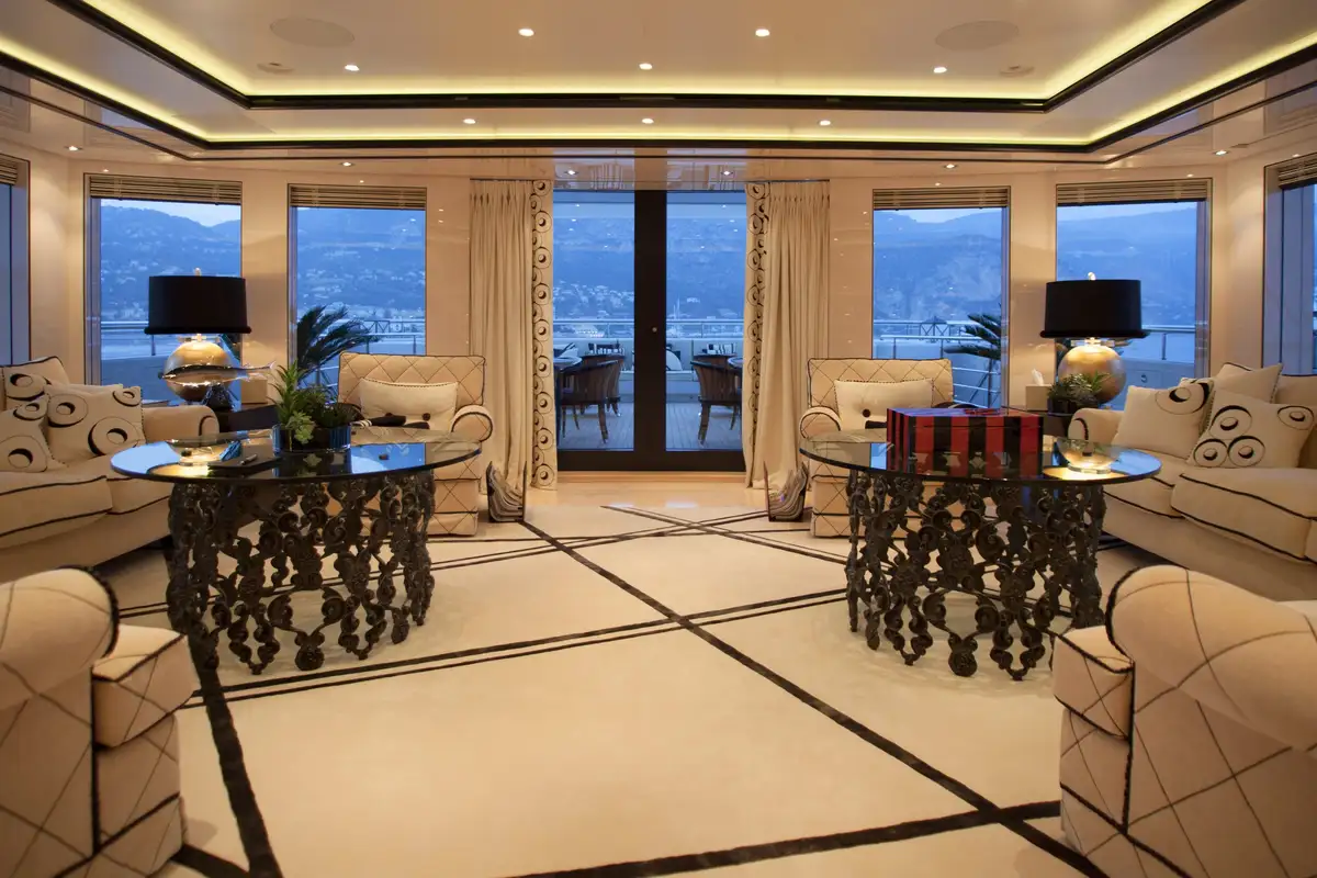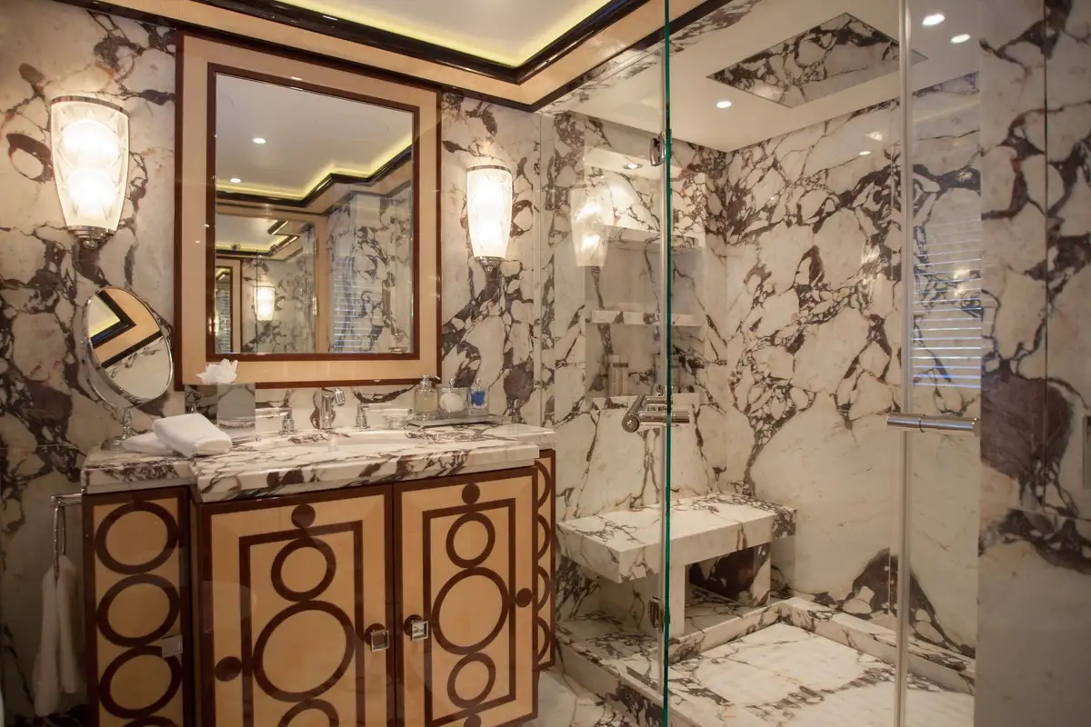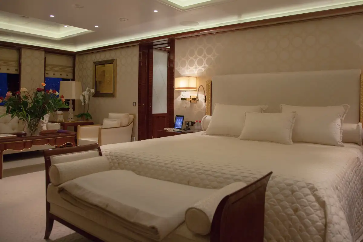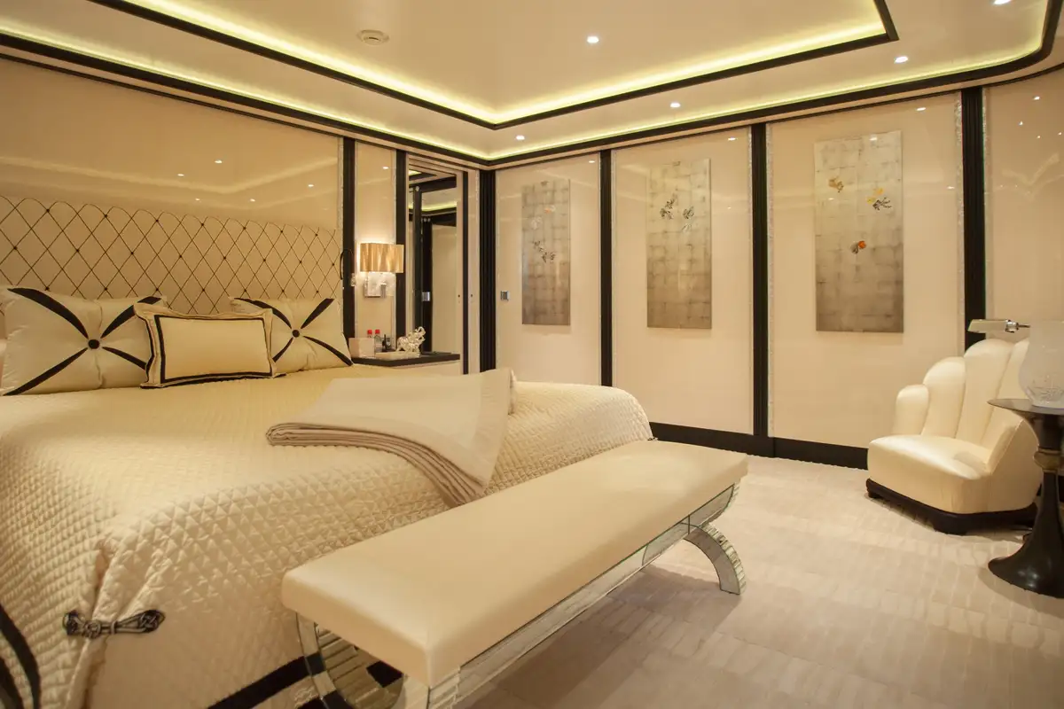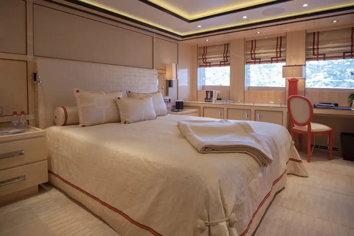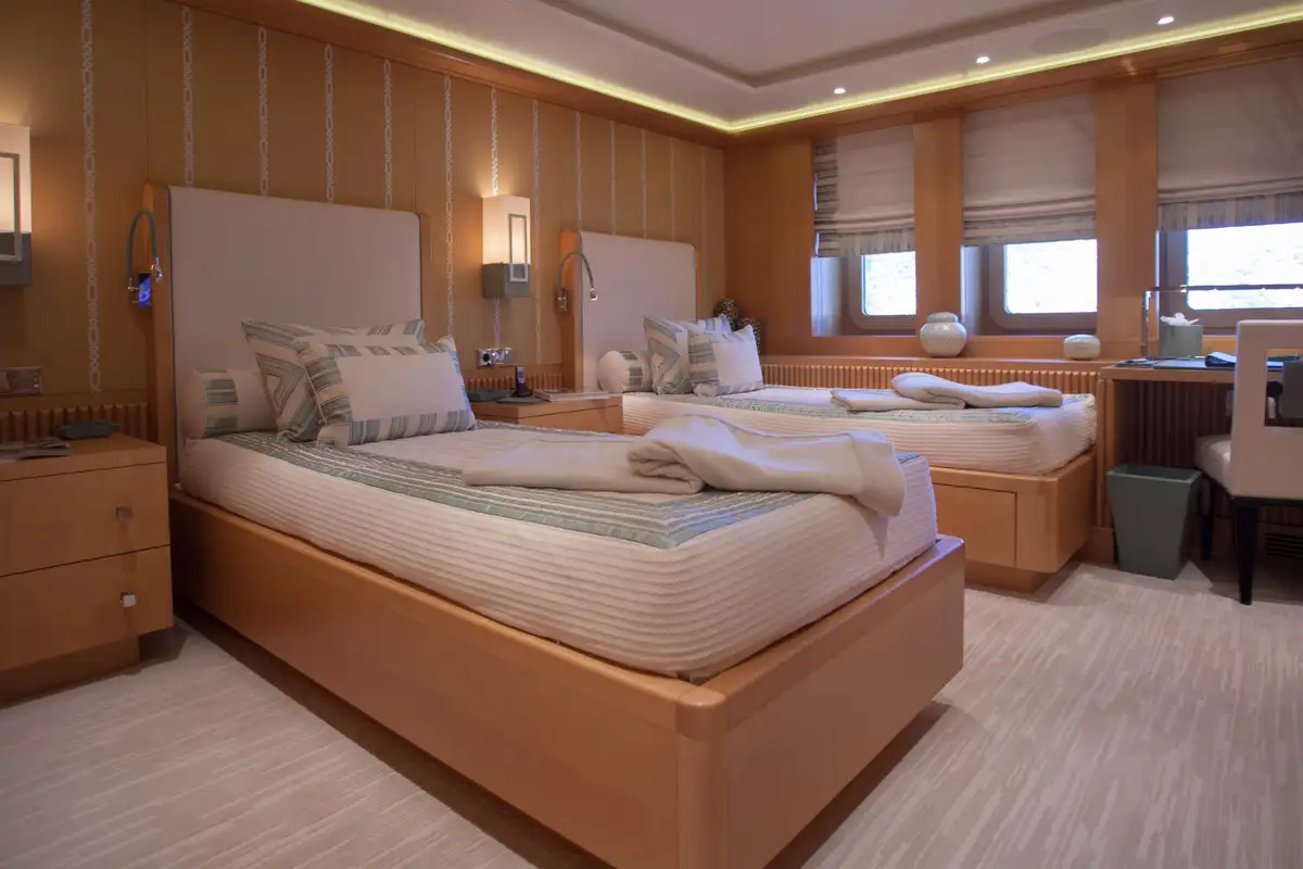 Accommodation is arranged to pamper up to 12 guests in eight suites. The full-beam master suite on the main deck boasts a private office and his-and-hers en suites, while three VIP cabins on the upper deck each feature en suite facilities and king-size beds. The lower deck houses a double cabin and three twin cabins—each with convertible configurations—ensuring flexibility for families or friends travelling together.