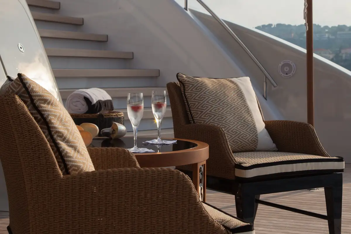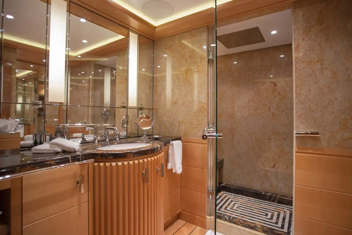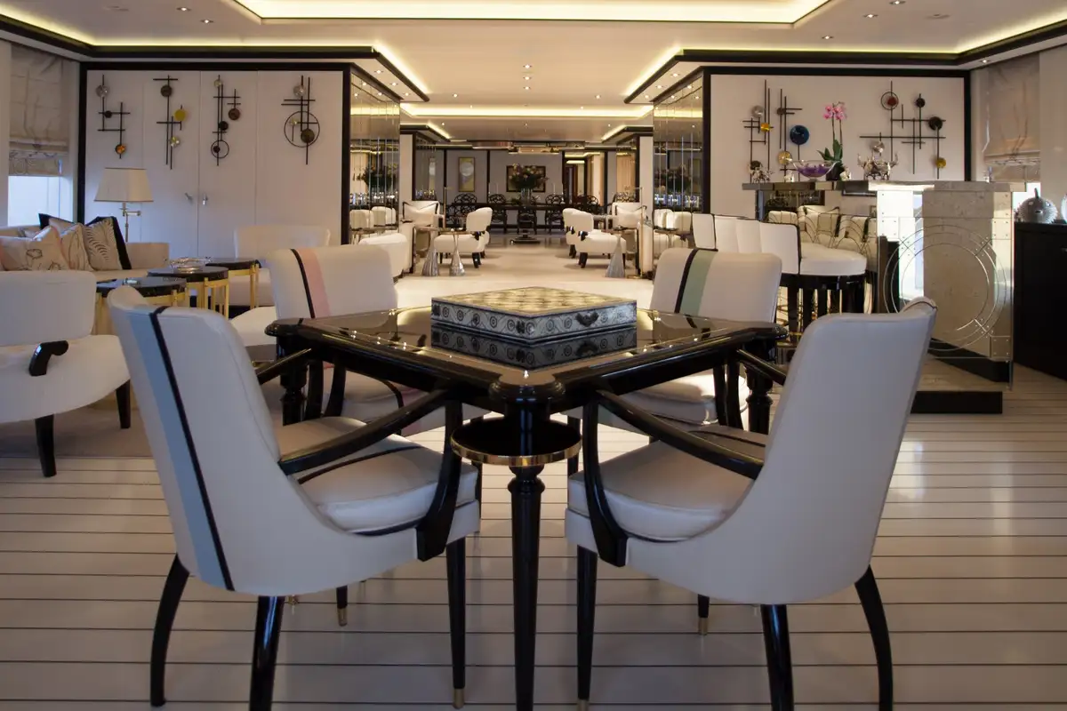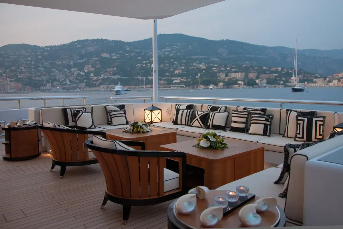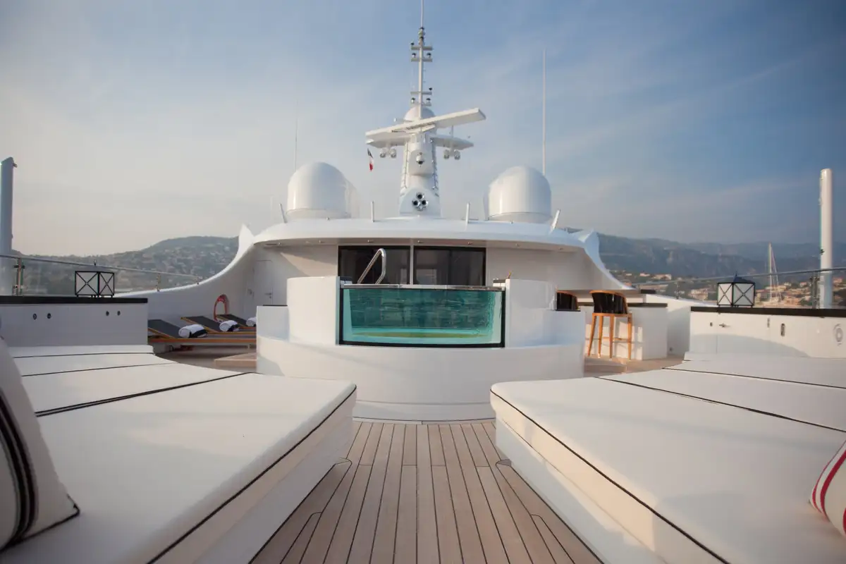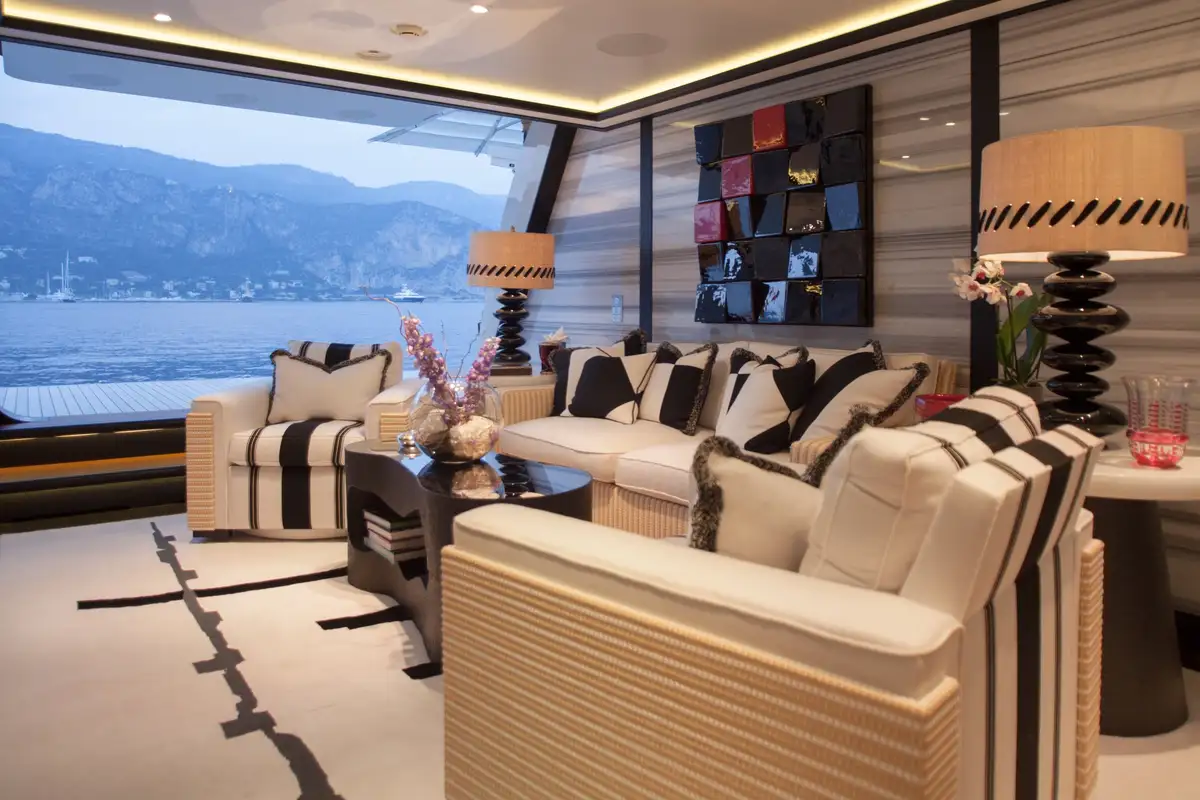 Accommodation is arranged to pamper up to 12 guests in eight suites. The full-beam master suite on the main deck boasts a private office and his-and-hers en suites, while three VIP cabins on the upper deck each feature en suite facilities and king-size beds. The lower deck houses a double cabin and three twin cabins—each with convertible configurations—ensuring flexibility for families or friends travelling together.
