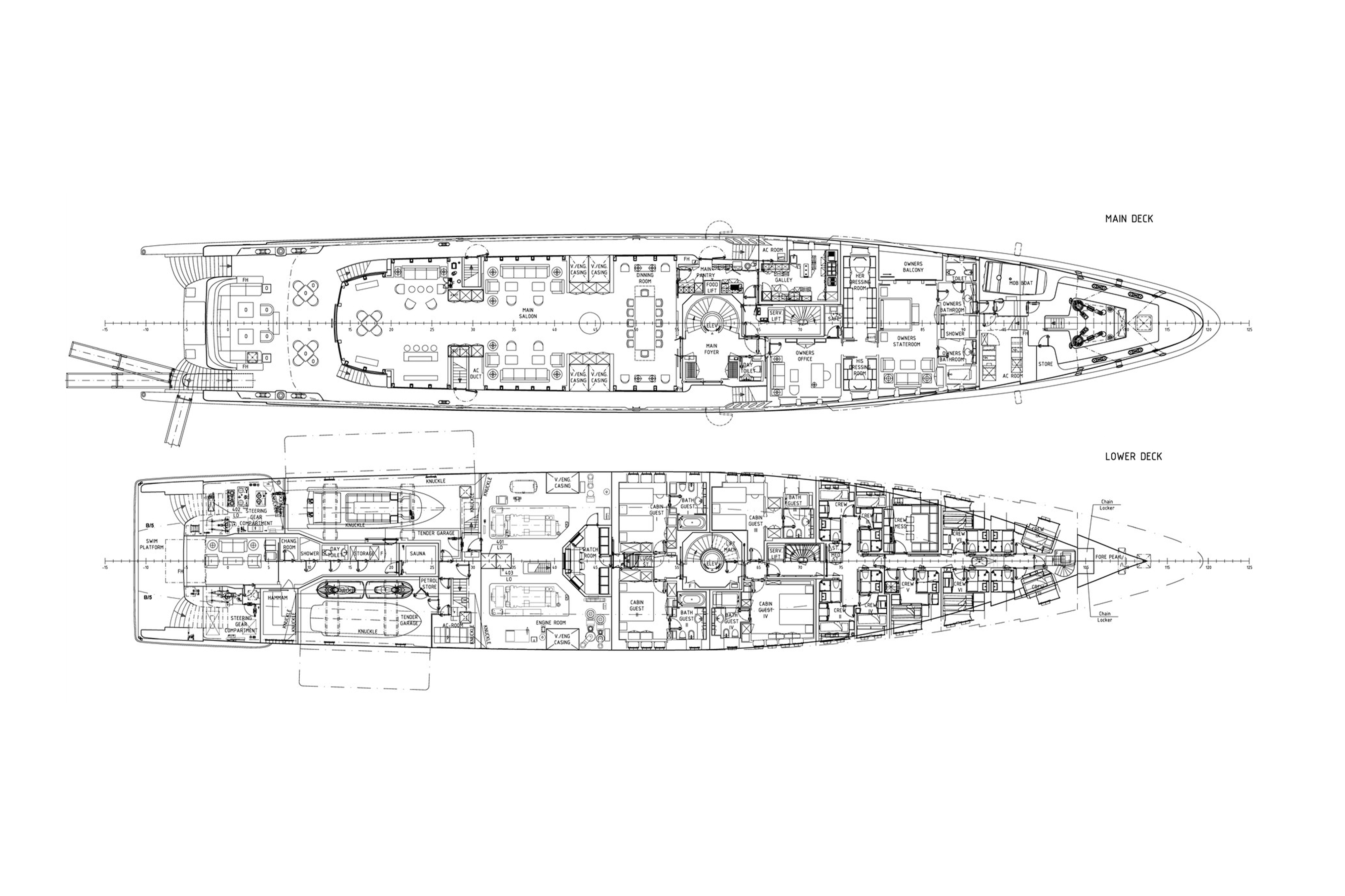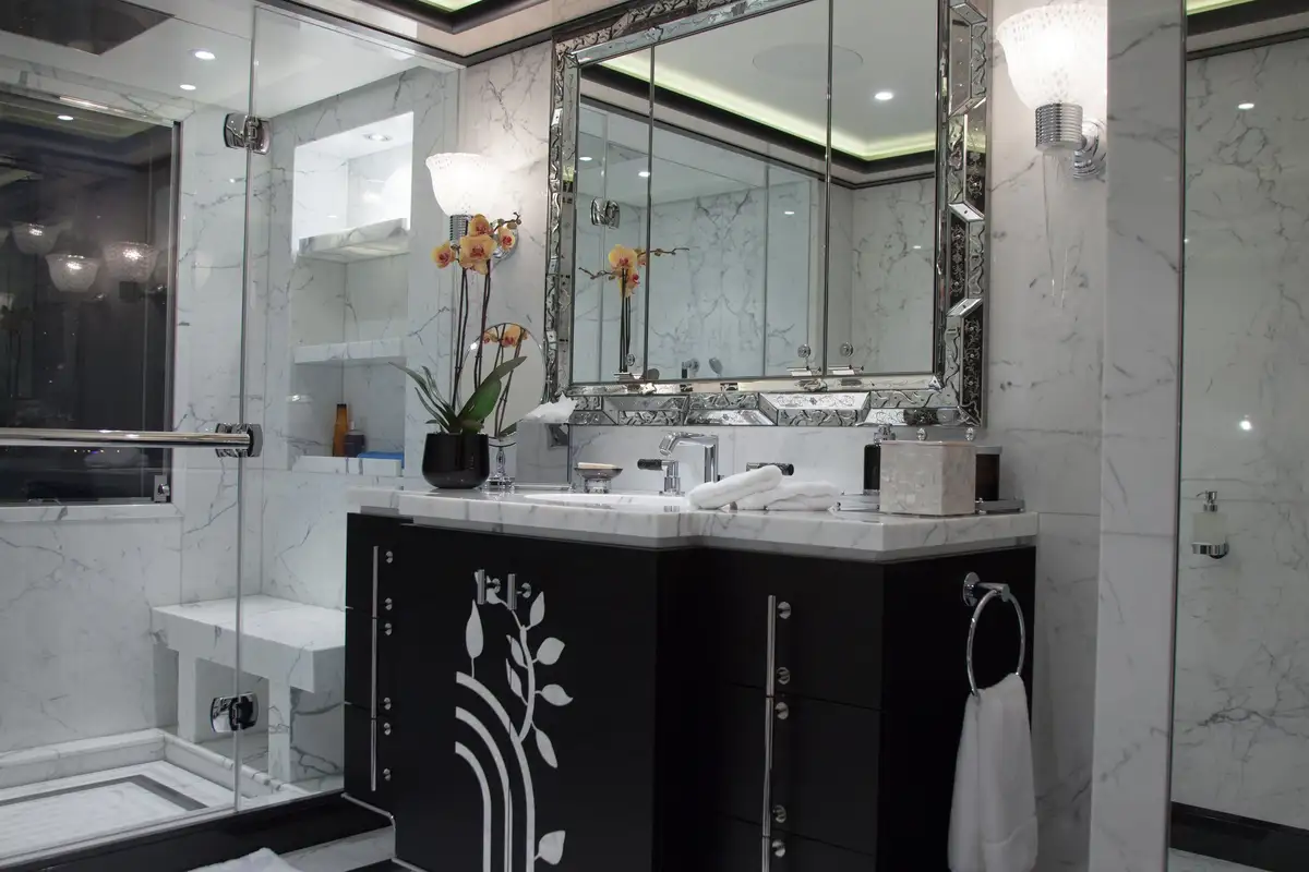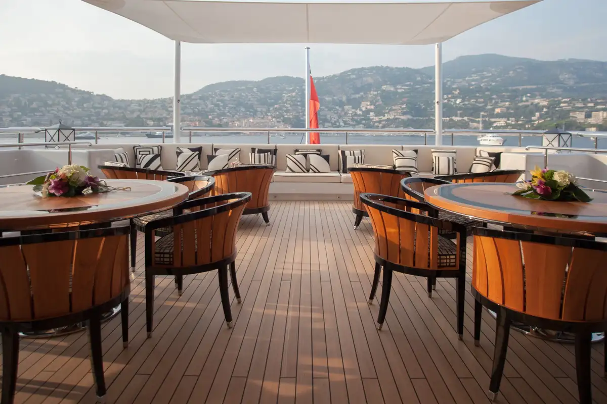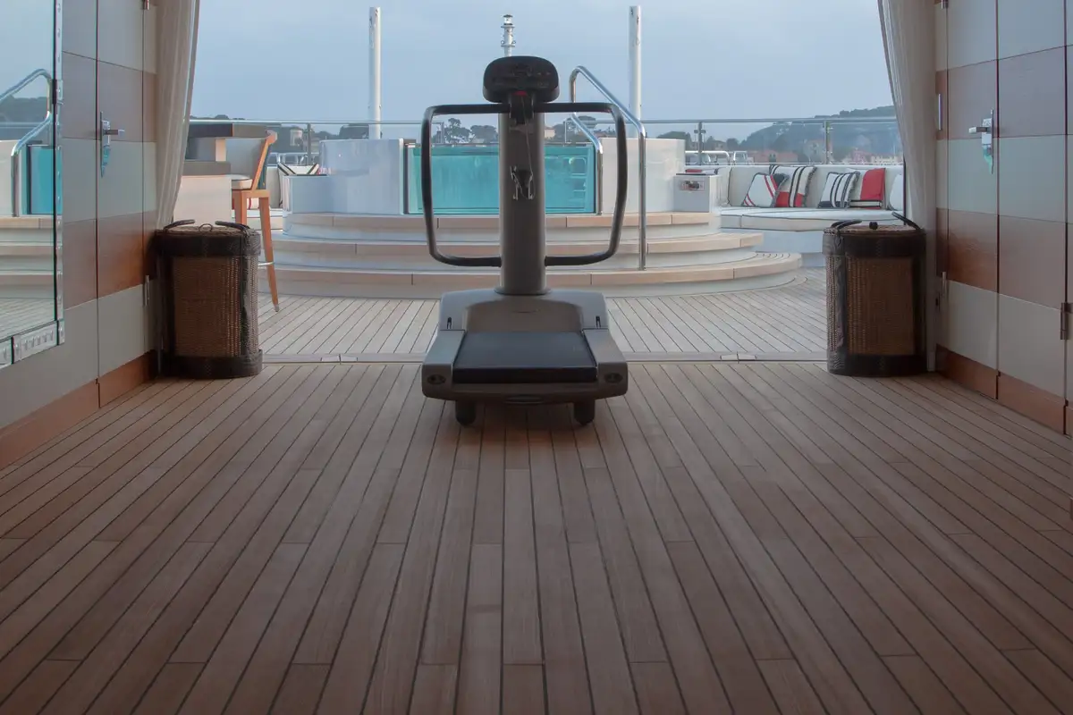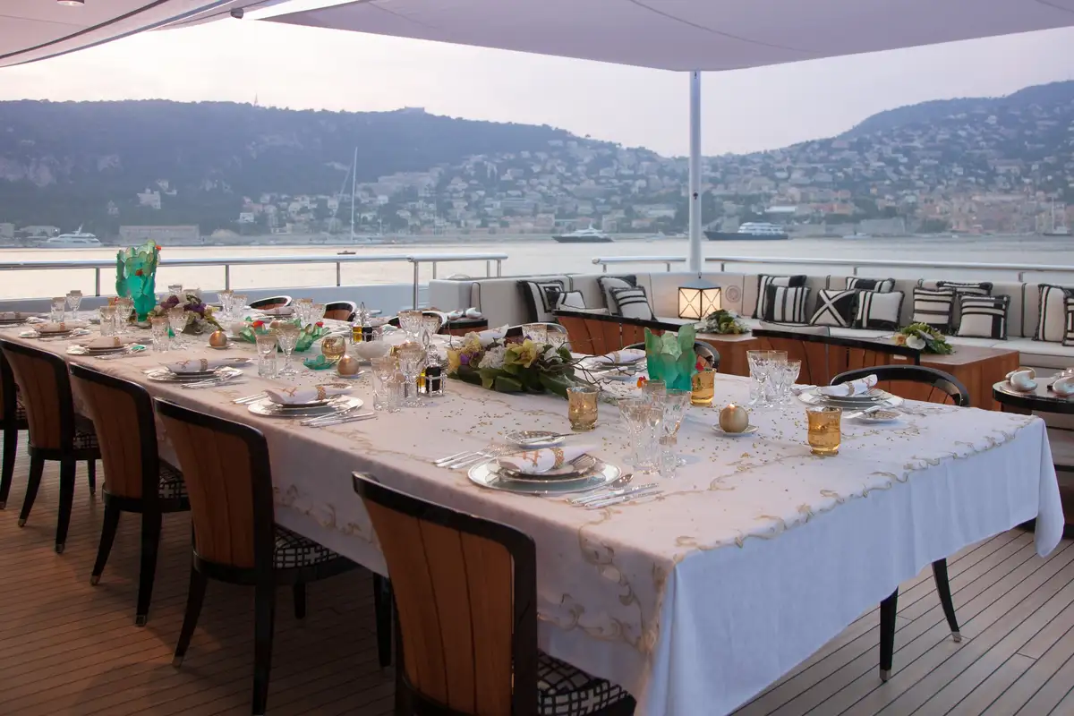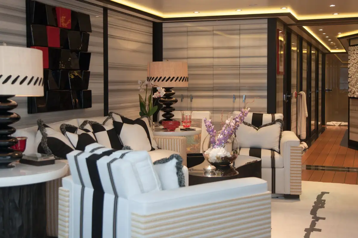 Accommodation is arranged to pamper up to 12 guests in eight suites. The full-beam master suite on the main deck boasts a private office and his-and-hers en suites, while three VIP cabins on the upper deck each feature en suite facilities and king-size beds. The lower deck houses a double cabin and three twin cabins—each with convertible configurations—ensuring flexibility for families or friends travelling together.