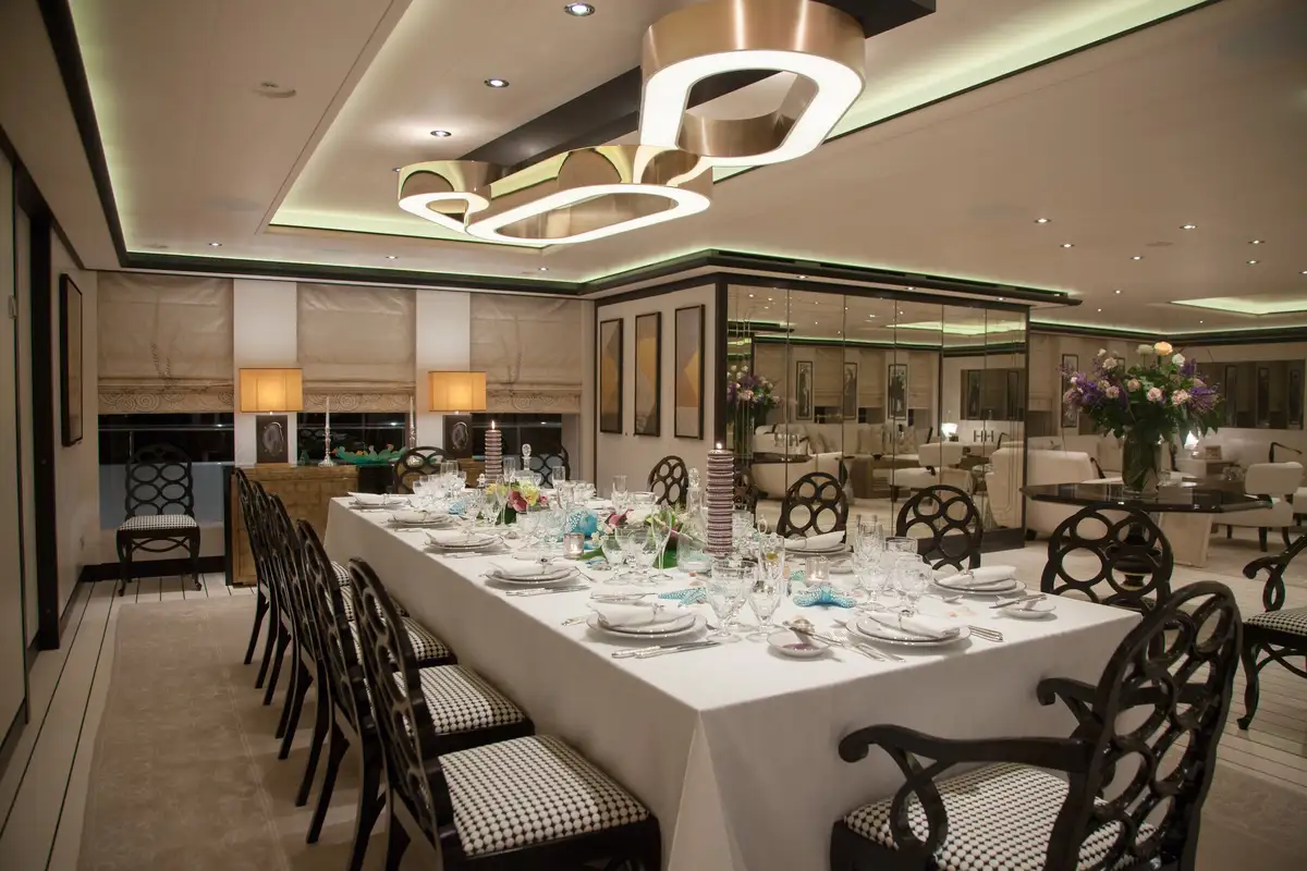 Inside, the H2 Yacht Design–styled interior welcomes you with expansive windows, a warm palette of polished walnut and cream fabrics, and bespoke furnishings throughout. The main deck lounge flows into an elegant formal dining area, whilst a private sky lounge provides an intimate retreat with panoramic views and plush seating for pre-dinner cocktails or a late-night film.
