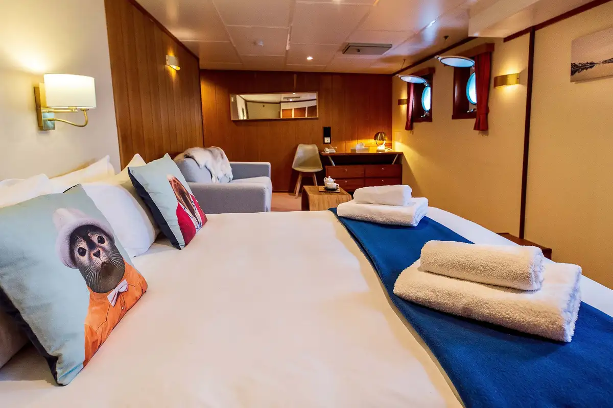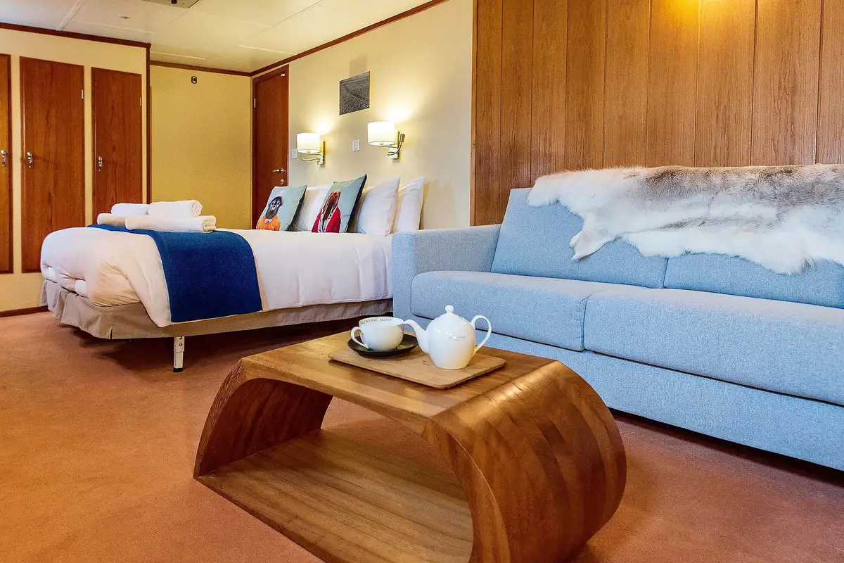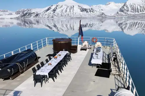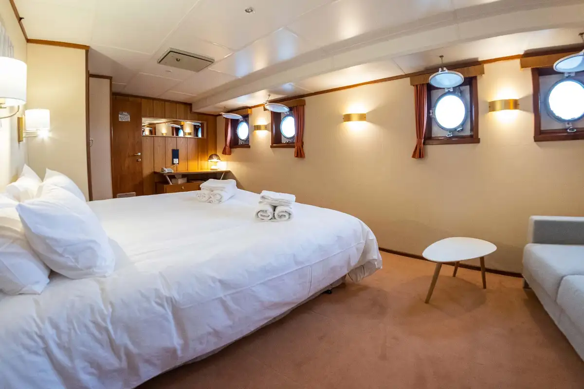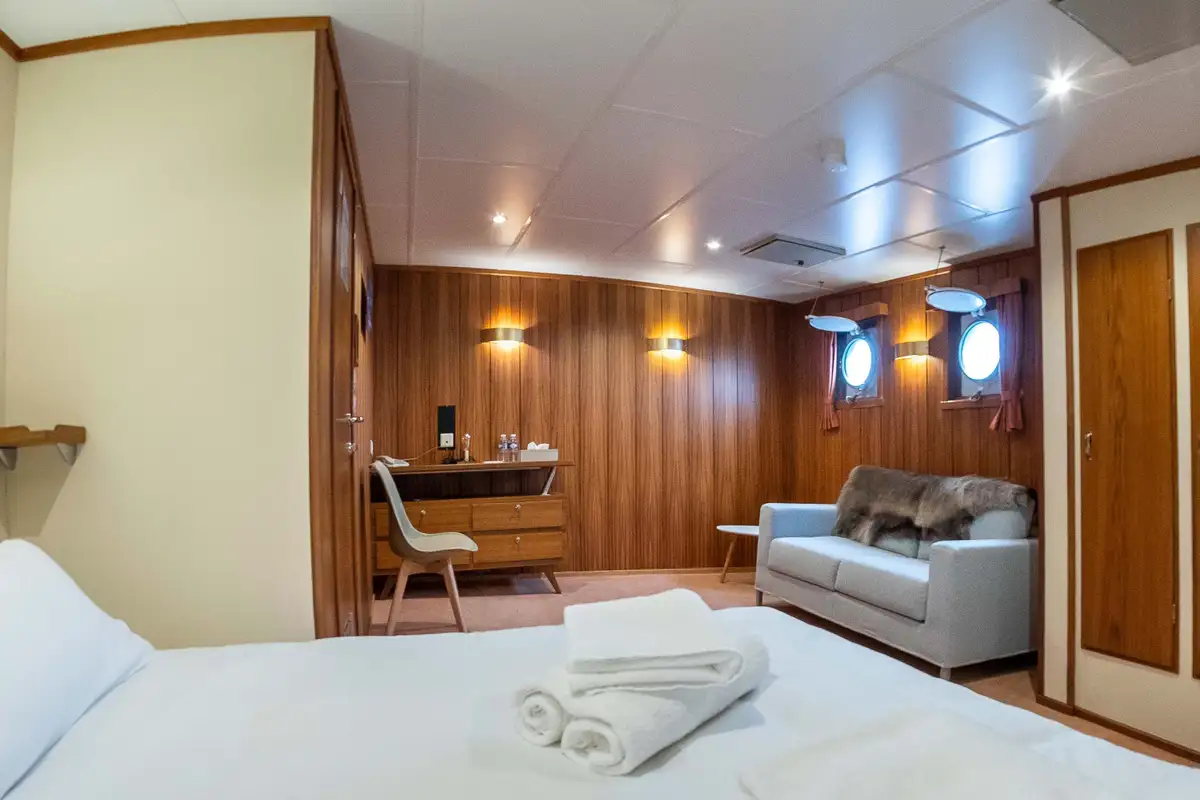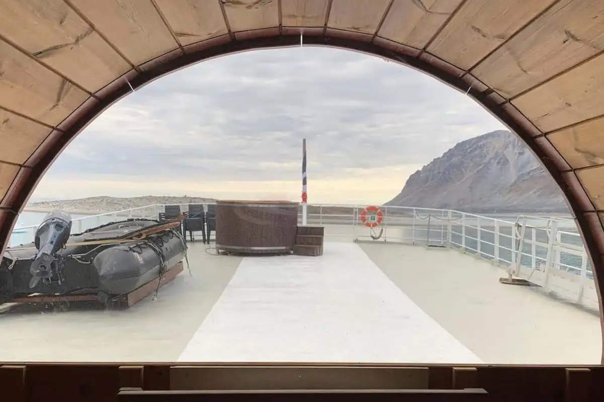 One of the Arctic’s most elegant small ships, POLARFRONT offers a feeling of luxury and style. She offers an on deck sauna and hot tub, spacious cabins and a large guest lounge and dining room. She is a large, stable vessel that offers cruise ship comfort, eight generous cabins lower deck accommodate up to 12 guests, welcomed by a skilful crew of 11, including two expert guides and a talented French chef