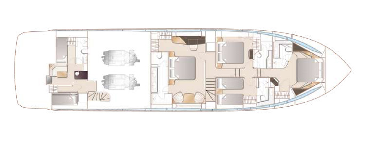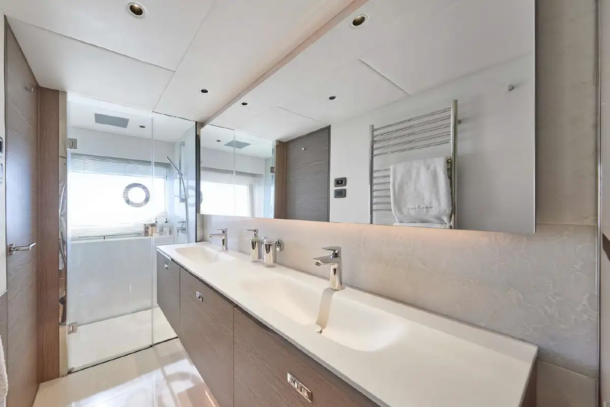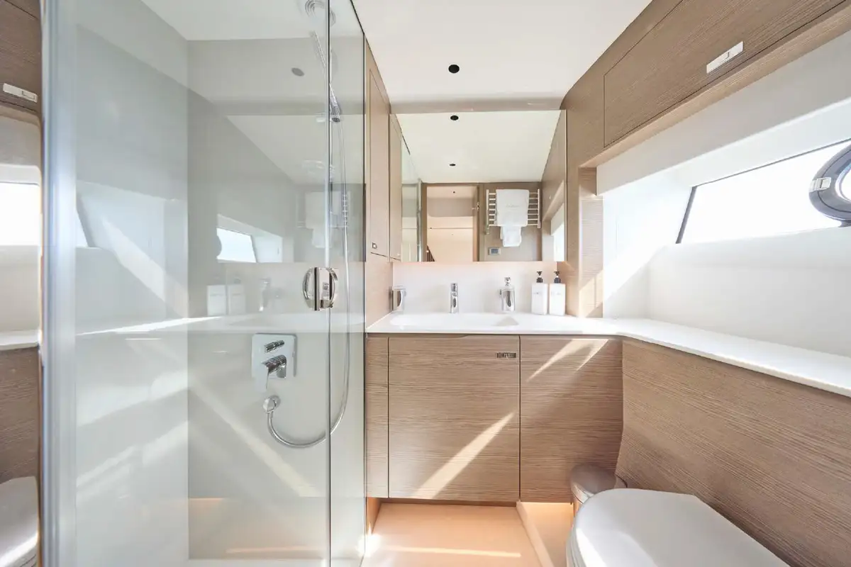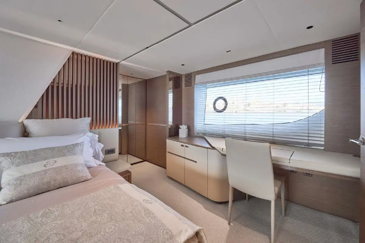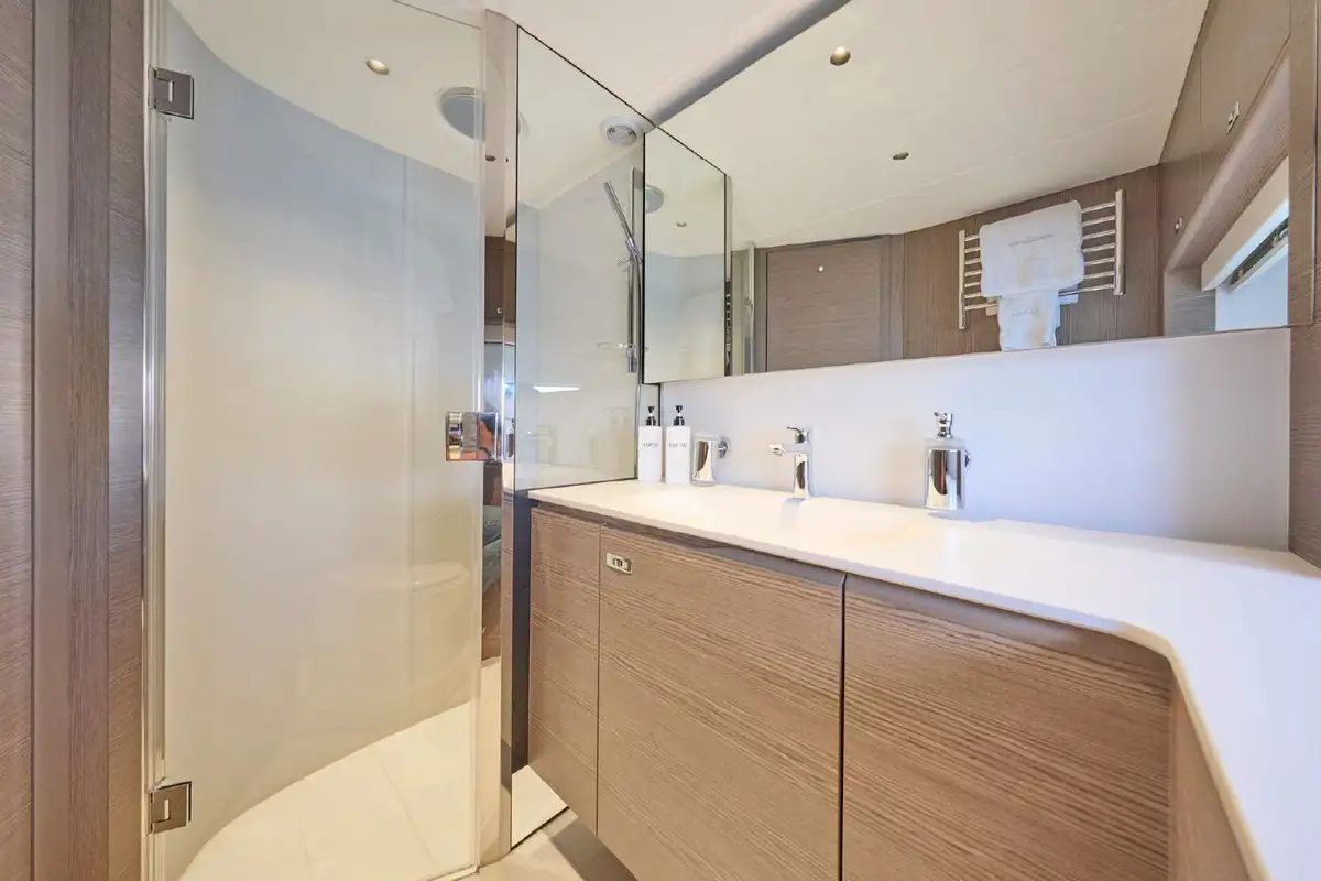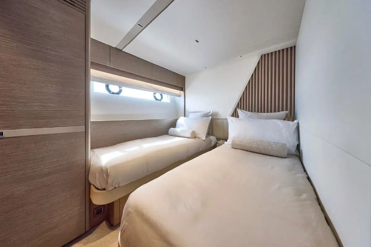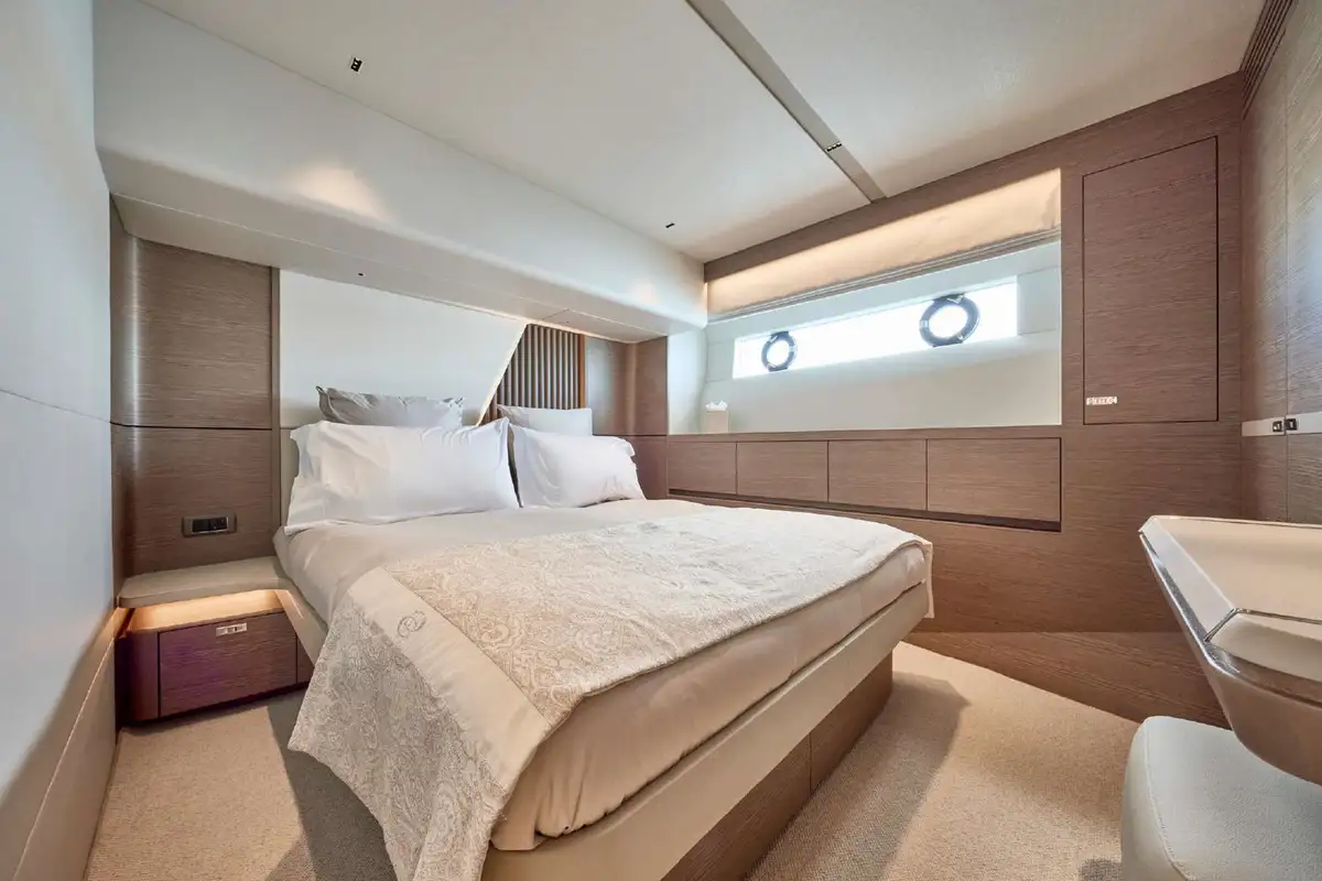 Accommodating up to eight guests, POLARIS boasts four luxurious cabins: a full-beam master suite, two double cabins, and a twin cabin, each with en-suite facilities and refined finishes. A dedicated crew of three ensures a seamless and indulgent charter experience.