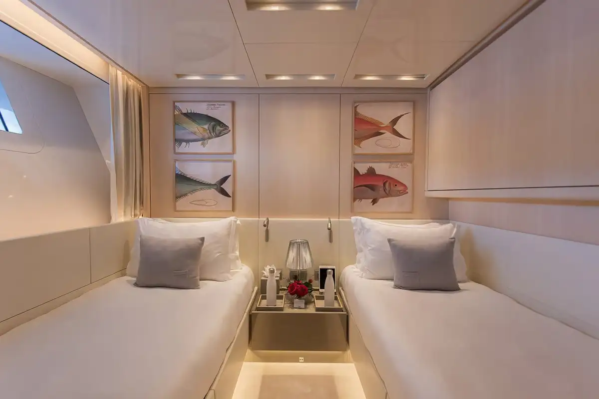 On the lower deck, mirrored double suites with inboard-facing berths and dedicated dressing tables provide elegant guest accommodation, each with its own en suite and walk-in shower. Two twin-berth suites with pullman berths complete the guest suites, which are ideal for children, families, or friends.