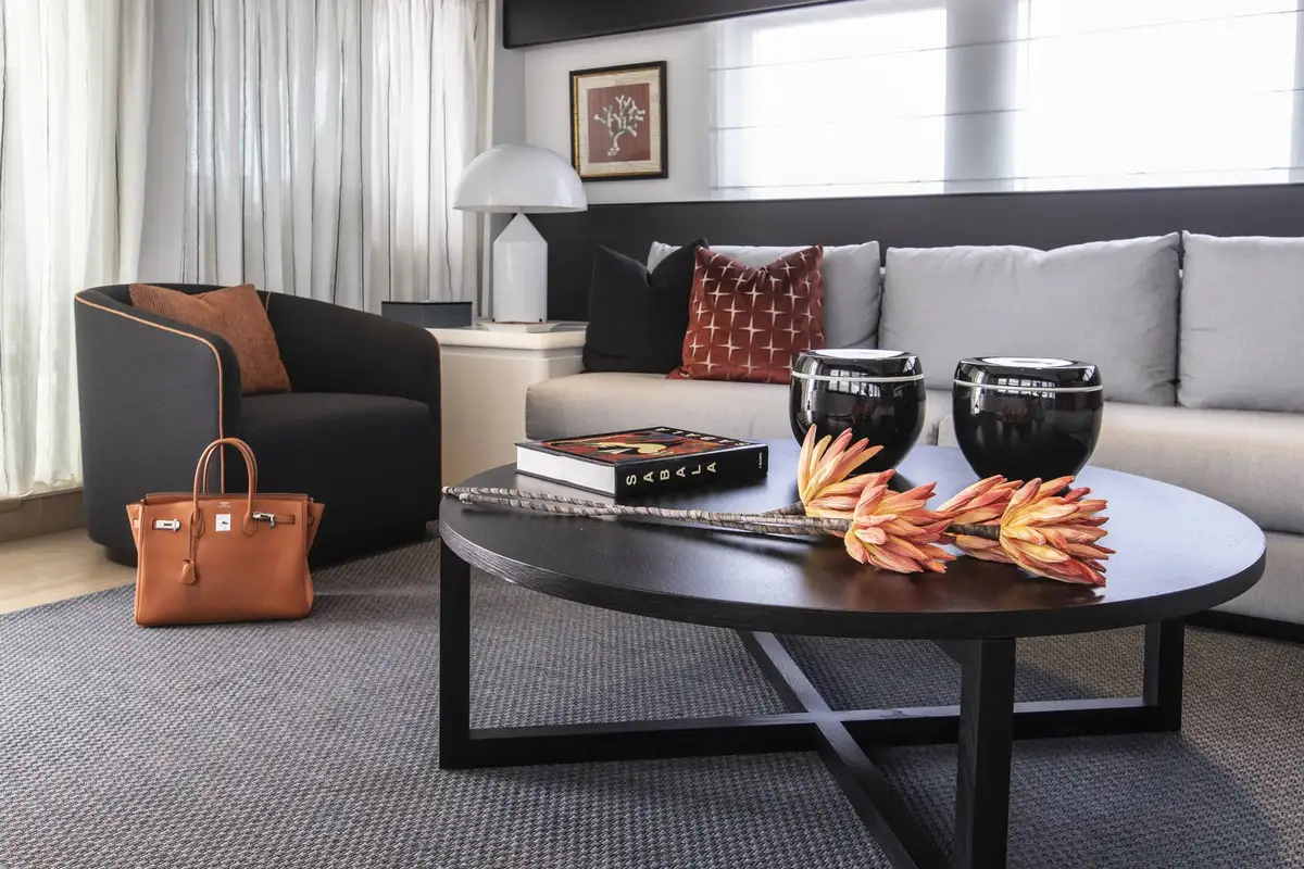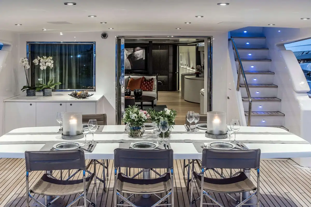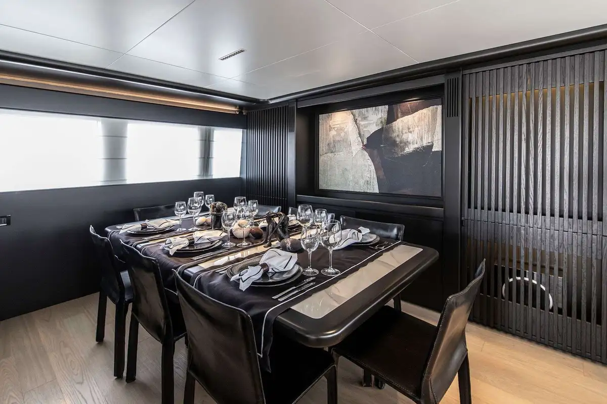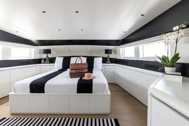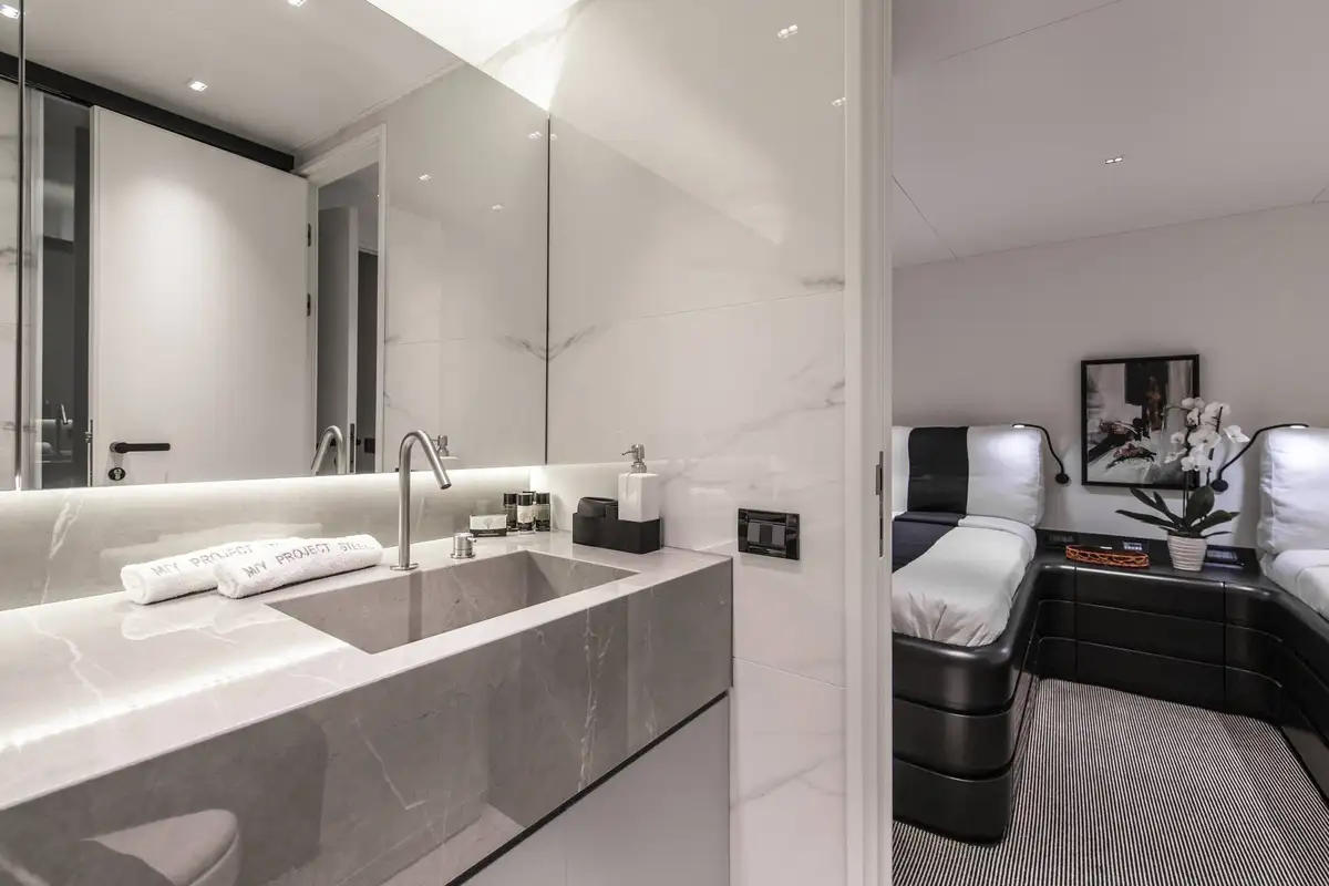 Her interior is smart and modern with a palette of contrasting pale and dark tones. The lounge is open plan with a large lounging area and an eight-seat formal dining table. Up front on the main deck level is the master suite, which has a king size double bed, a sofa for private relaxation and a marble en suite bathroom.