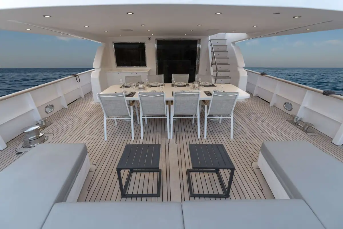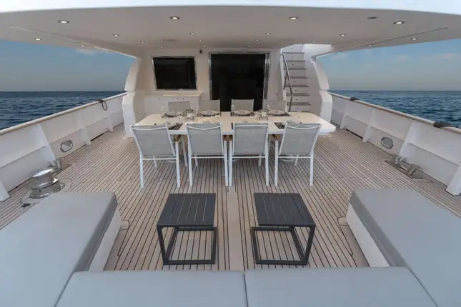 Her spacious sundeck is a mezzanine design with a lounge bar and a large expanse of open deck space. There are sunpads on the forward coachroof and the main deck aft is another large social space with a large dining table in shade, open-air seating further aft and four elevated sunbeds astern. Steps lead down from here to a large bathing platform, which is an excellent launch pad for watersports.