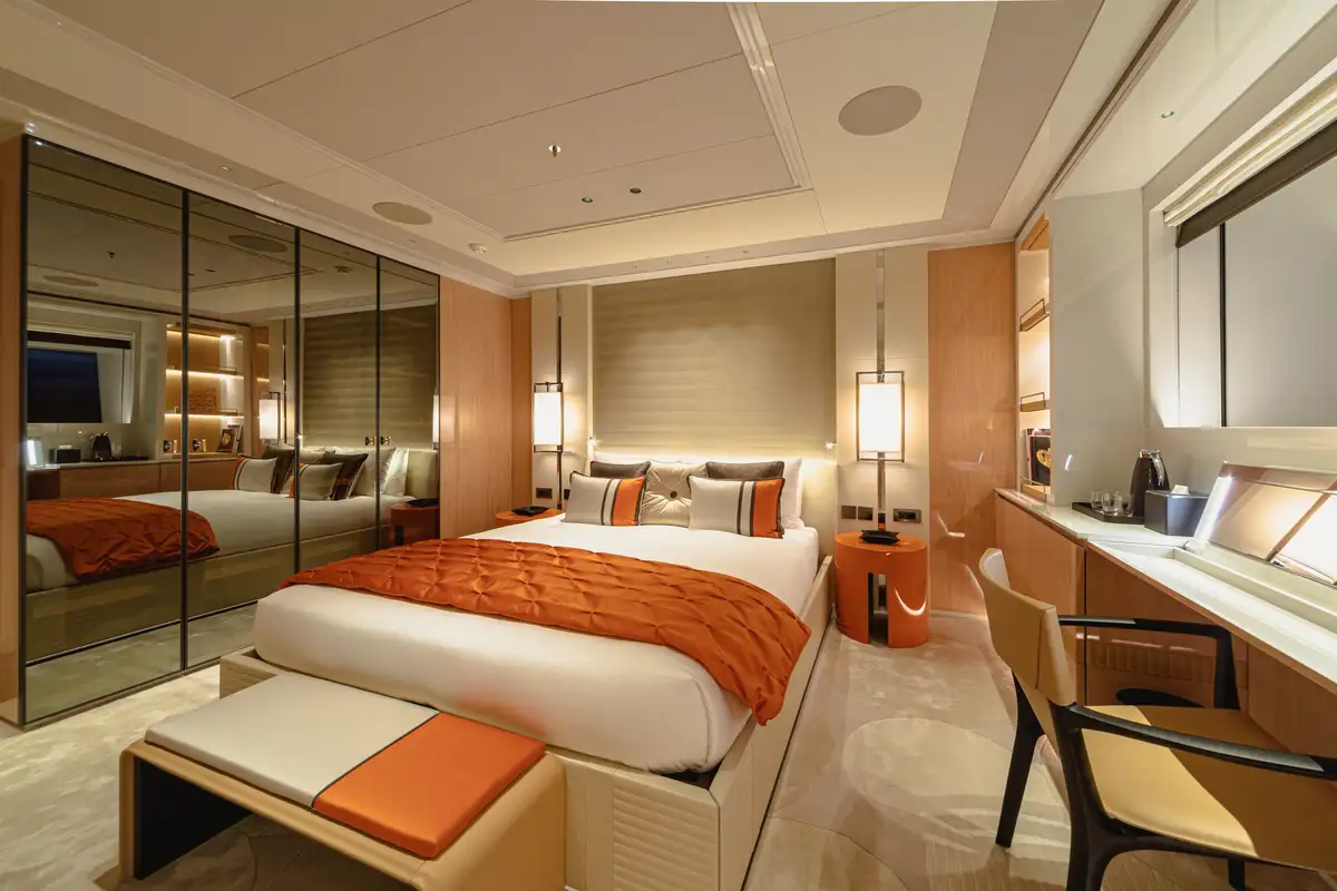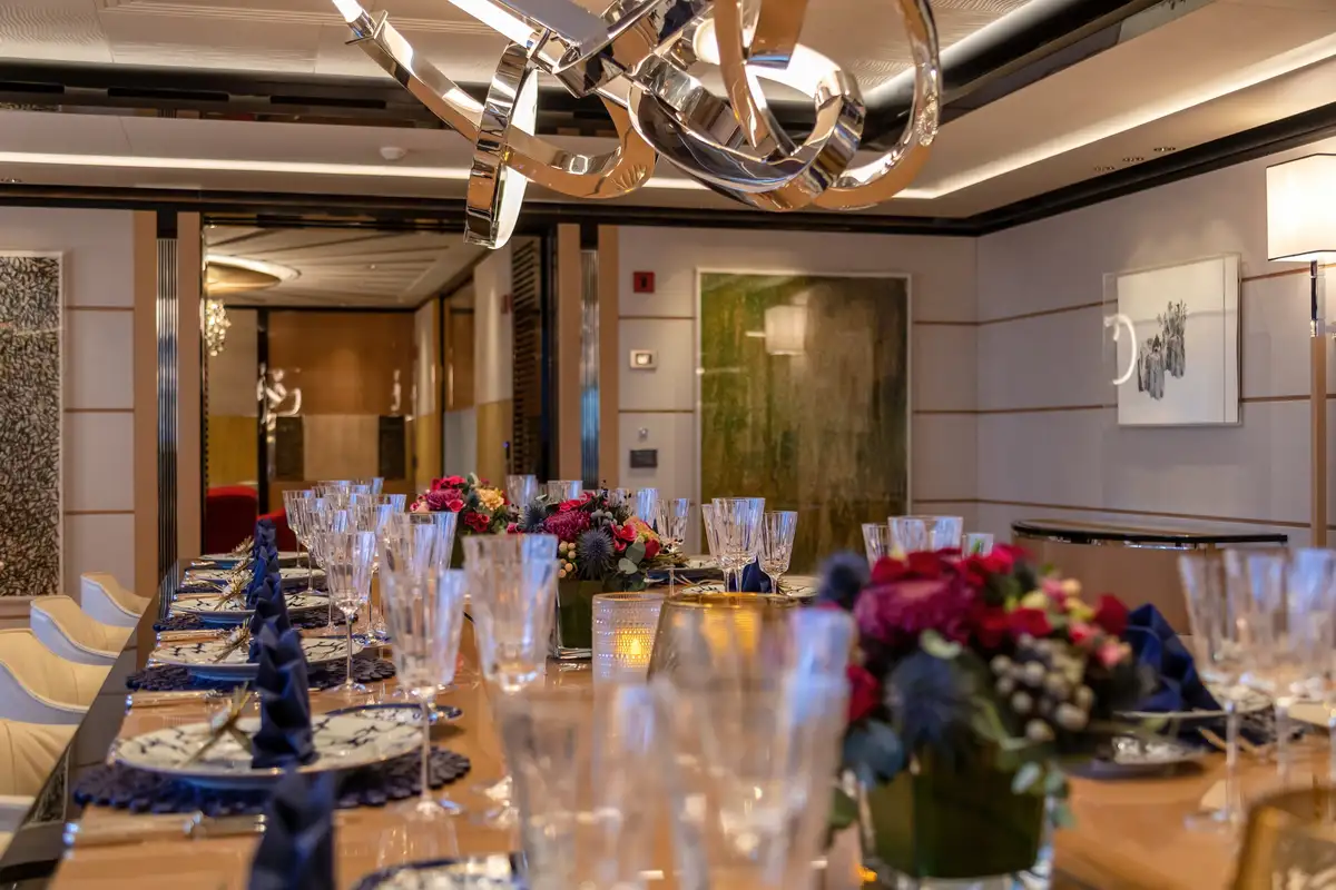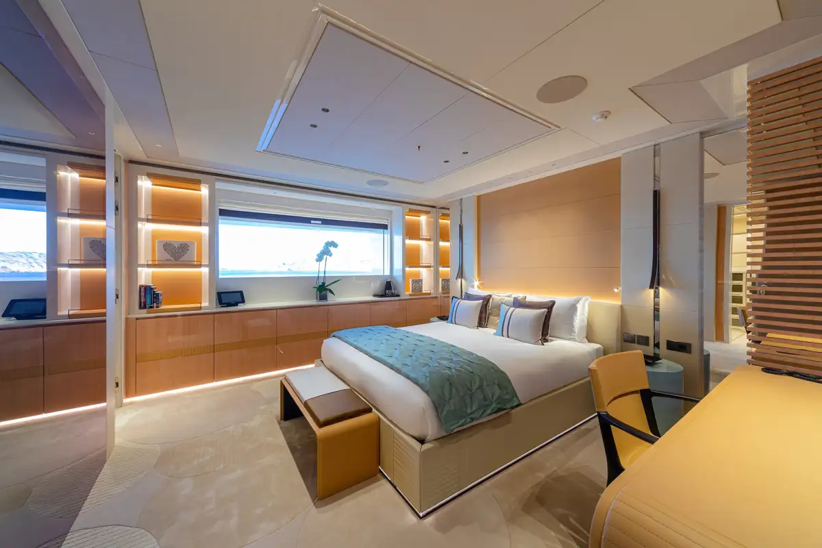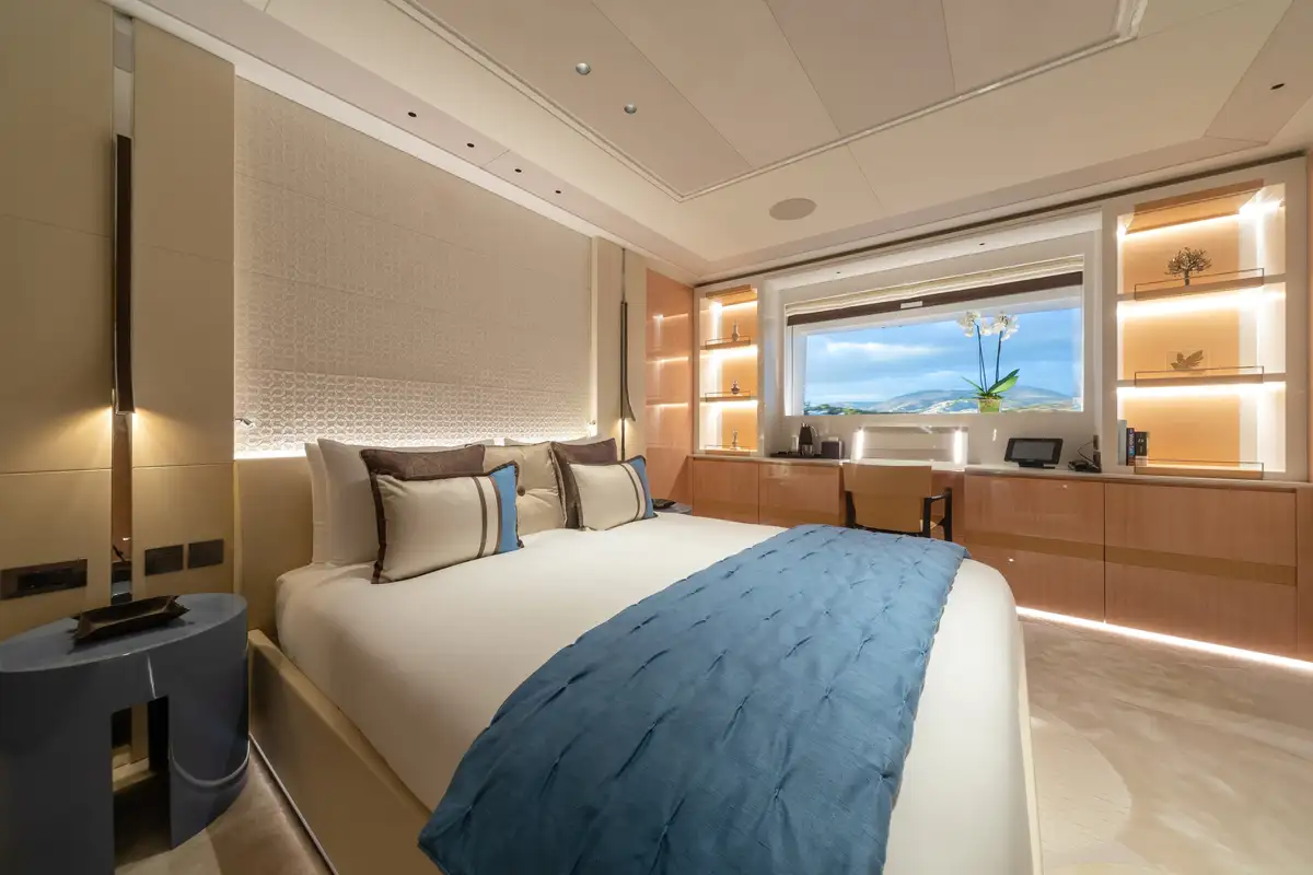 PROJECT X accommodates up to 12 guests in nine guest cabins, each with their own colour scheme. Additionally, on board a corporate yacht charter guests can enjoy the impressive full beam office/ conference room with separate PA/ secretary facilities on upper deck forward. Complete with panoramic views, active charter guests can make the most of the unique enclosed gym on sun deck with day room and direct access to large jacuzzi area and sun pads.
