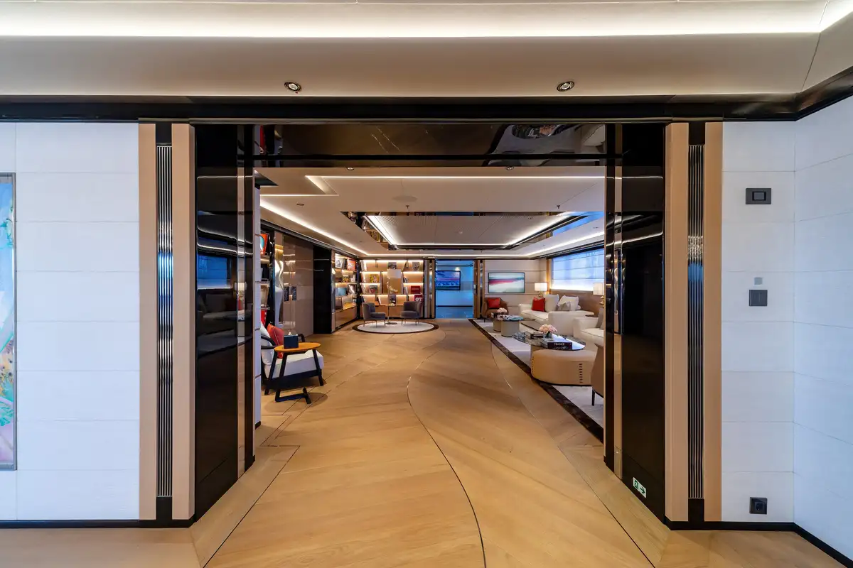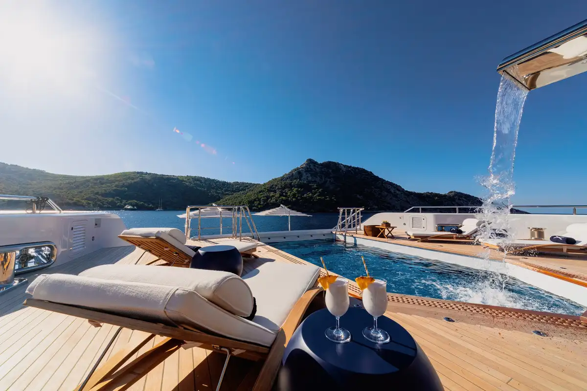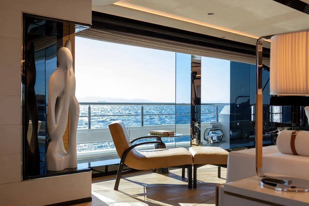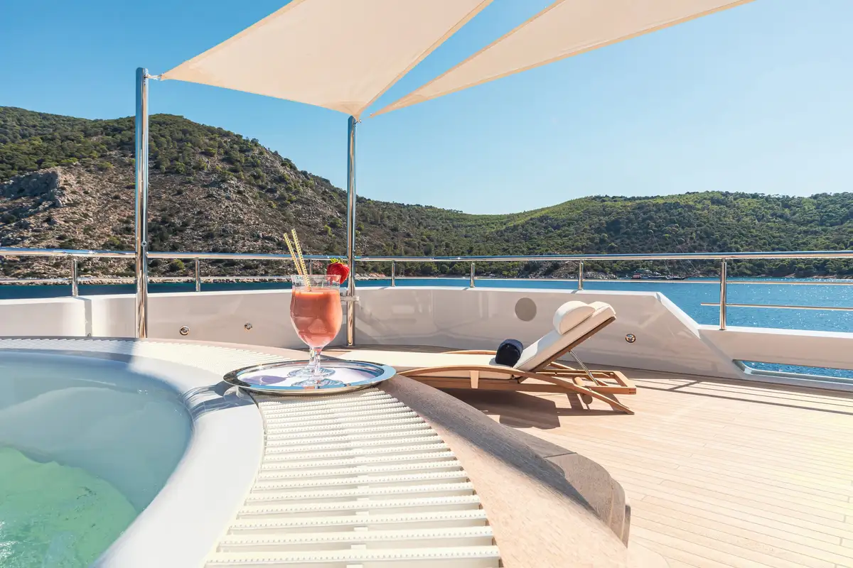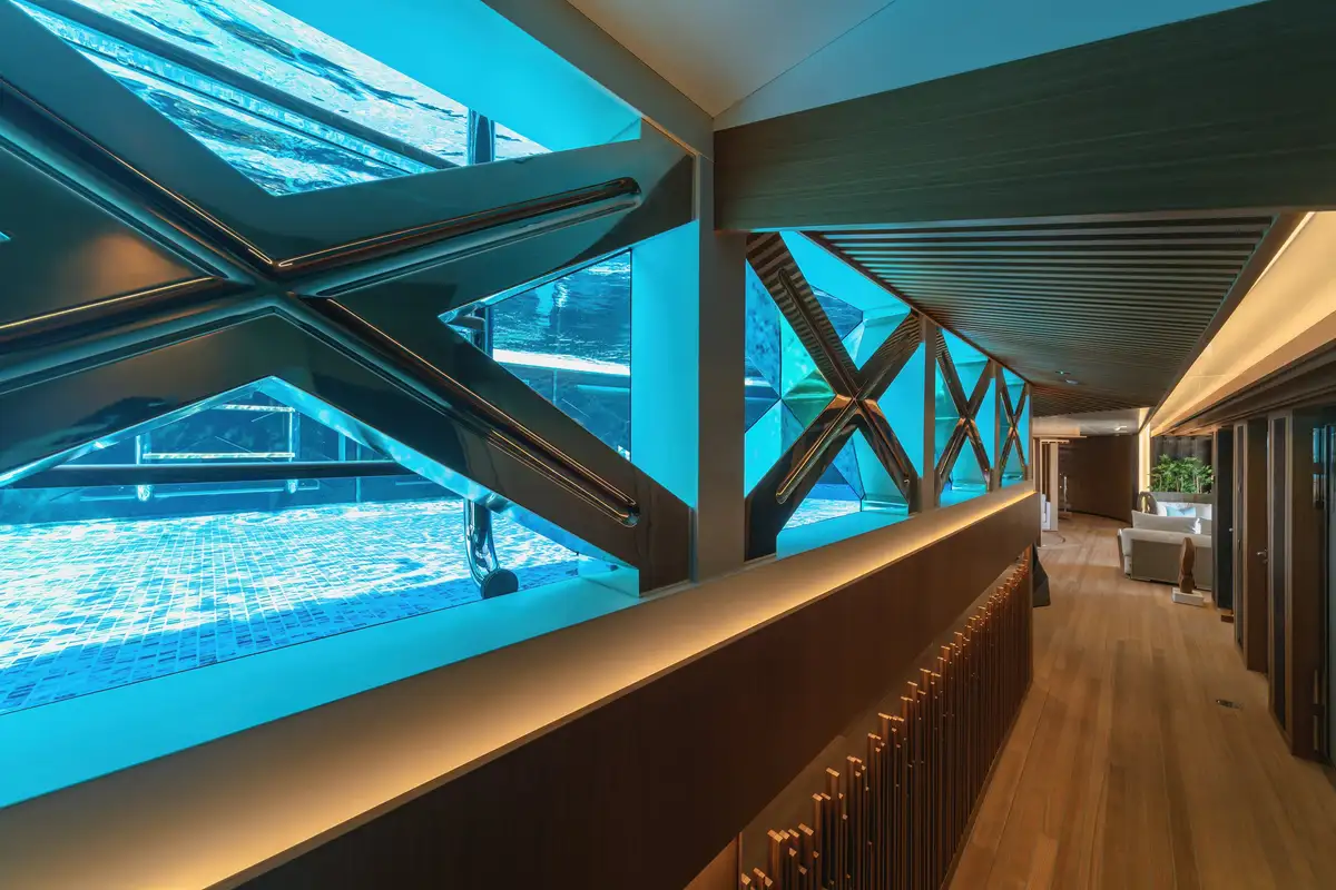 An interior flooded with natural light, redefines the connection with your surroundings and nowhere is this better expressed than in her uniquely impressive glass elevator and atrium. Other alluring features include a large private owner's deck with jacuzzi and sun lounging terrace and sensational views through full-height windows in the master suite and lounges. The main deck is home to a large pool on the aft deck with vast sun bathing facilities and bar.