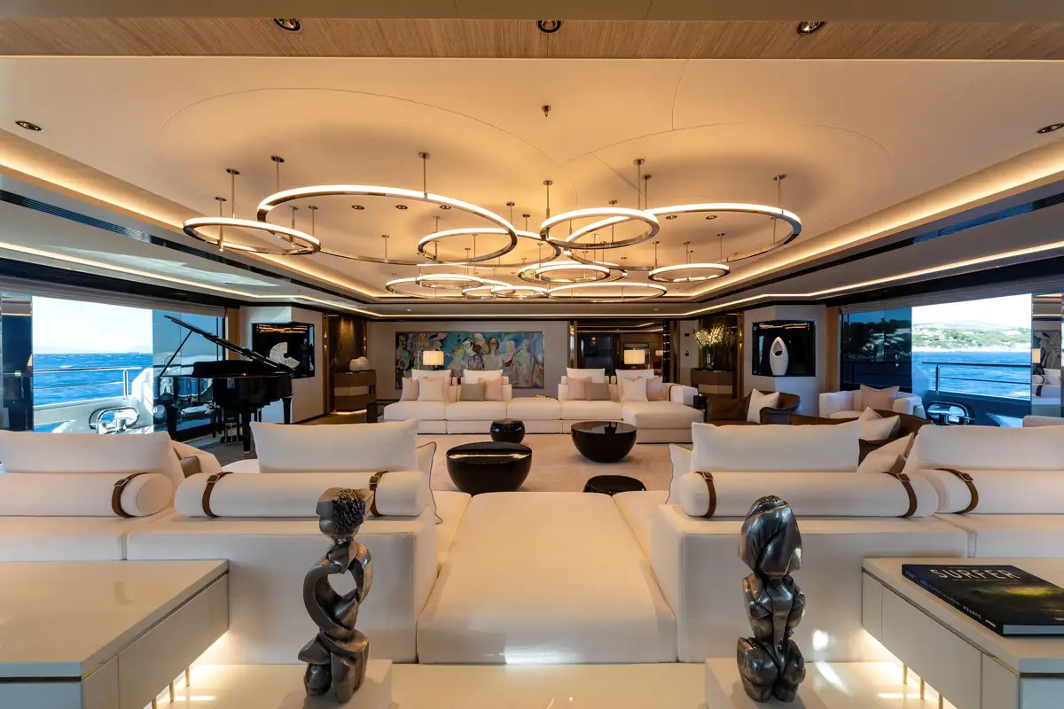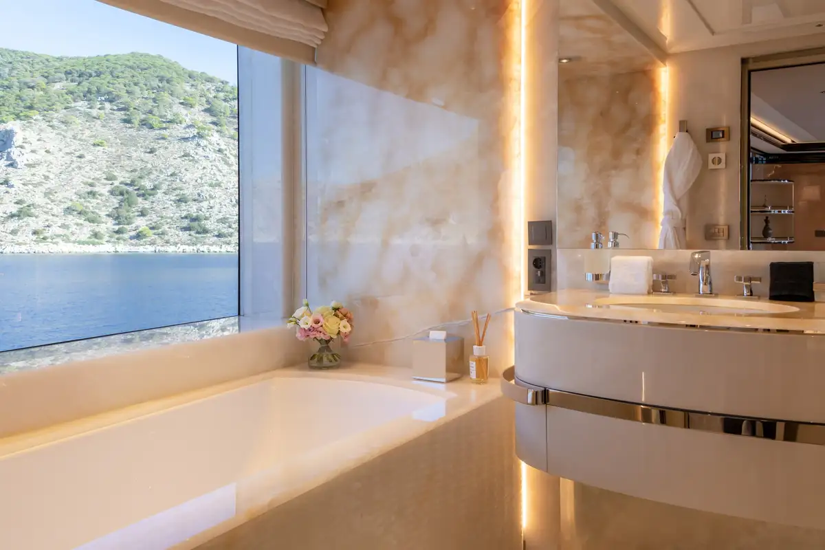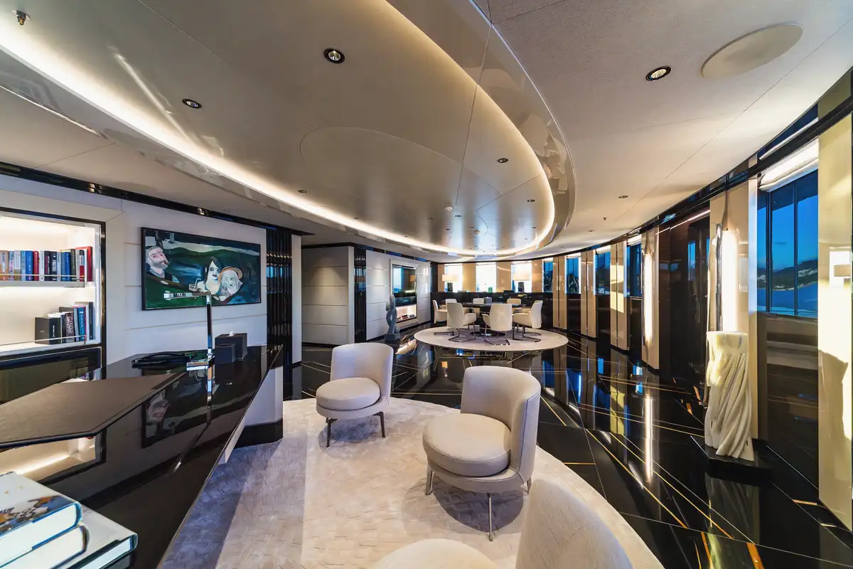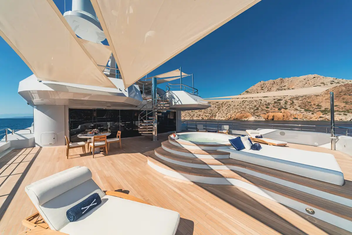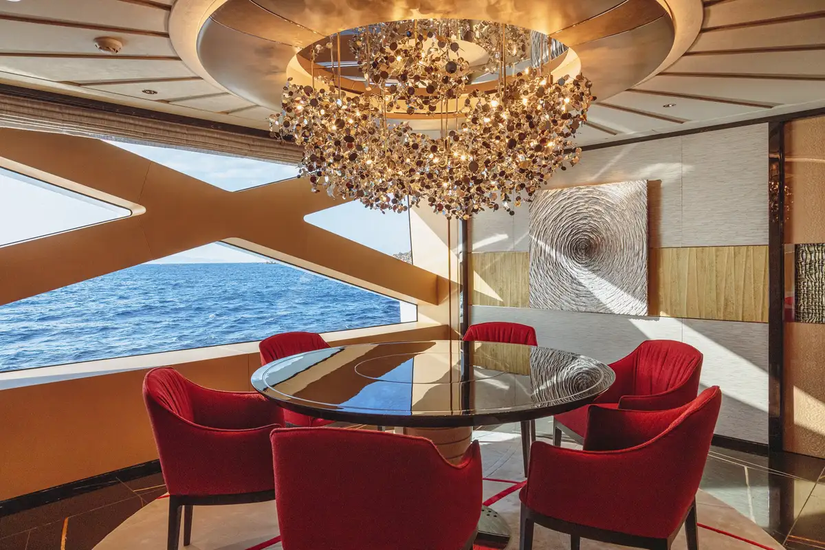 An interior flooded with natural light, redefines the connection with your surroundings and nowhere is this better expressed than in her uniquely impressive glass elevator and atrium. Other alluring features include a large private owner's deck with jacuzzi and sun lounging terrace and sensational views through full-height windows in the master suite and lounges. The main deck is home to a large pool on the aft deck with vast sun bathing facilities and bar.