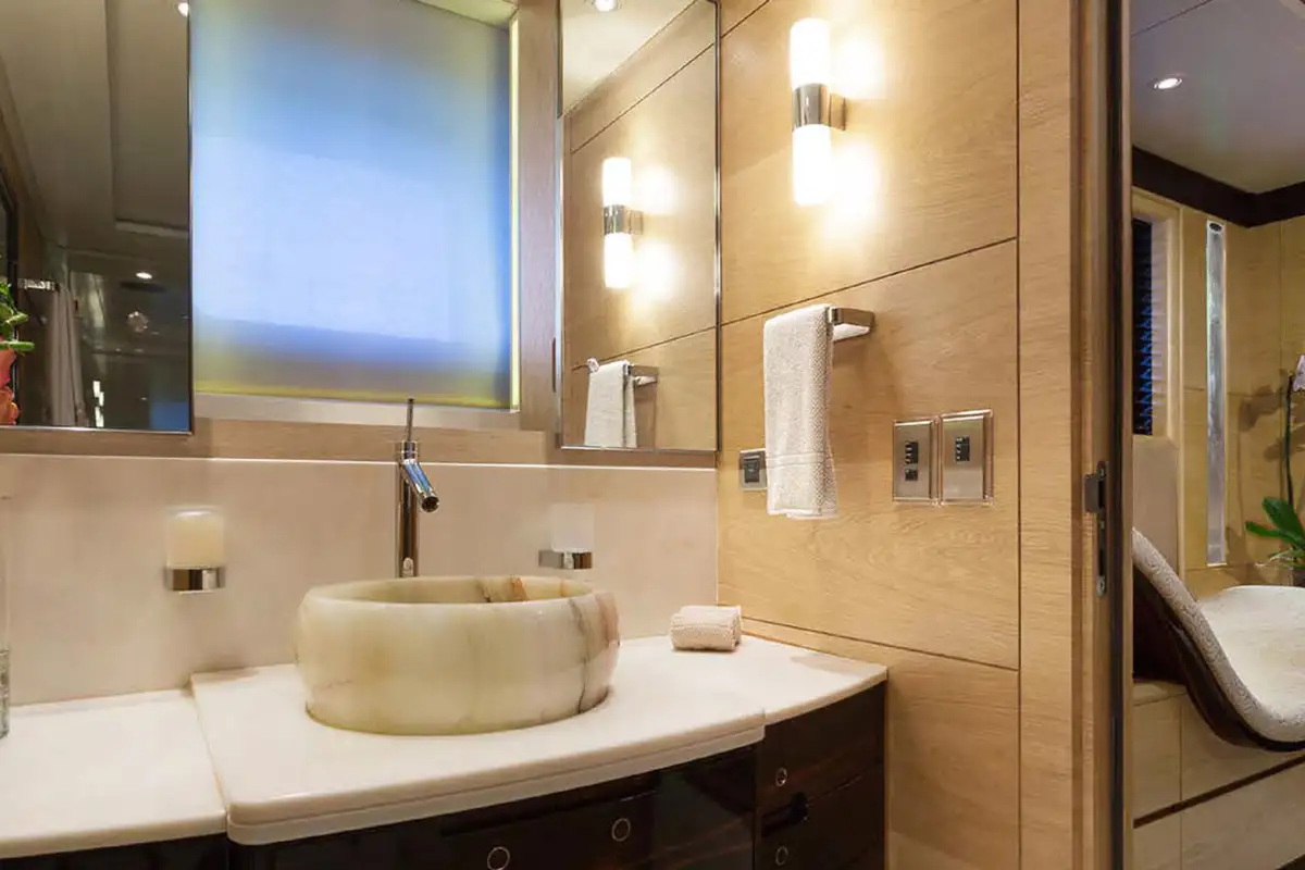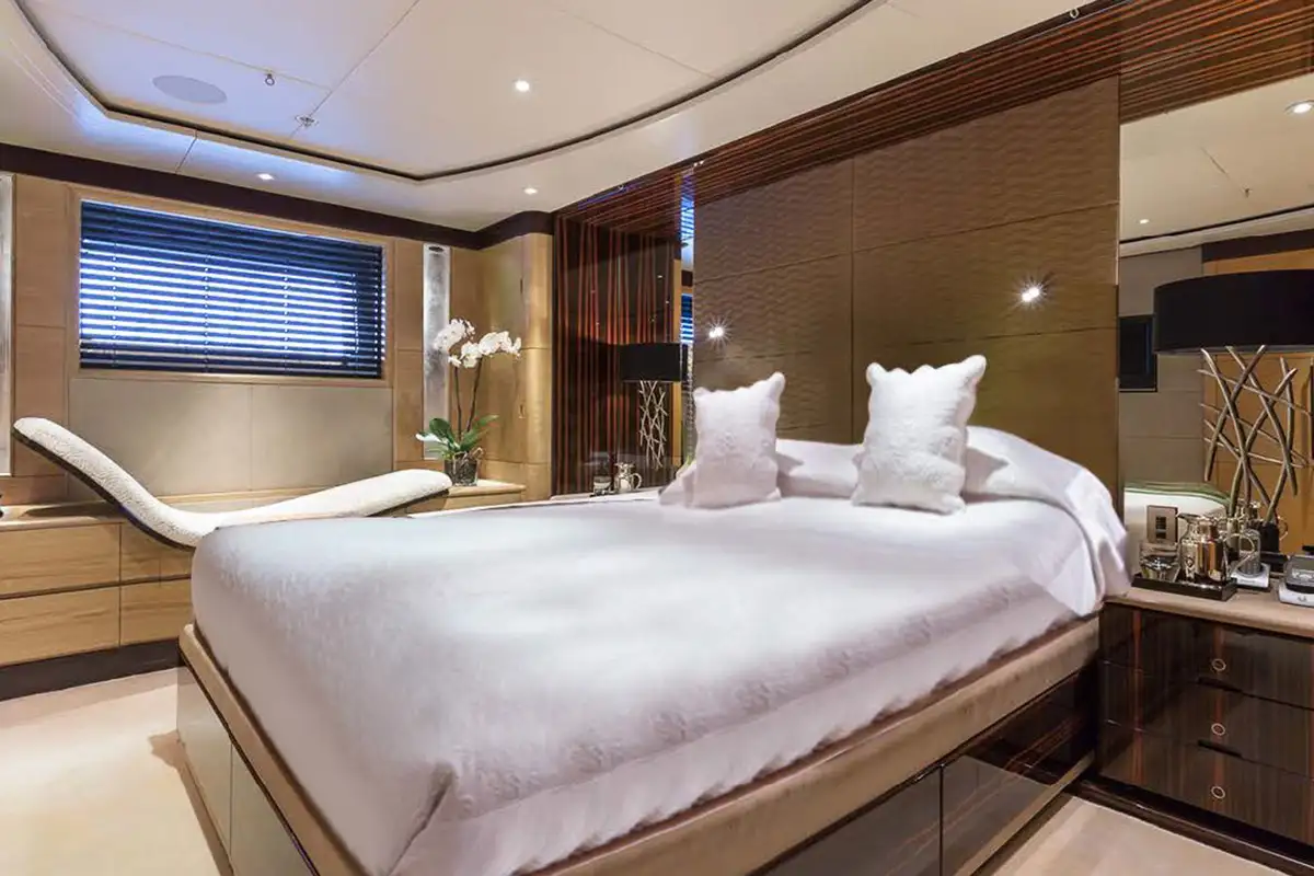 Below on the lower deck is accommodation for 10/12 guests across five luxurious staterooms consisting of a full beam master suite, two doubles, and two twins each with a Pullman berth.