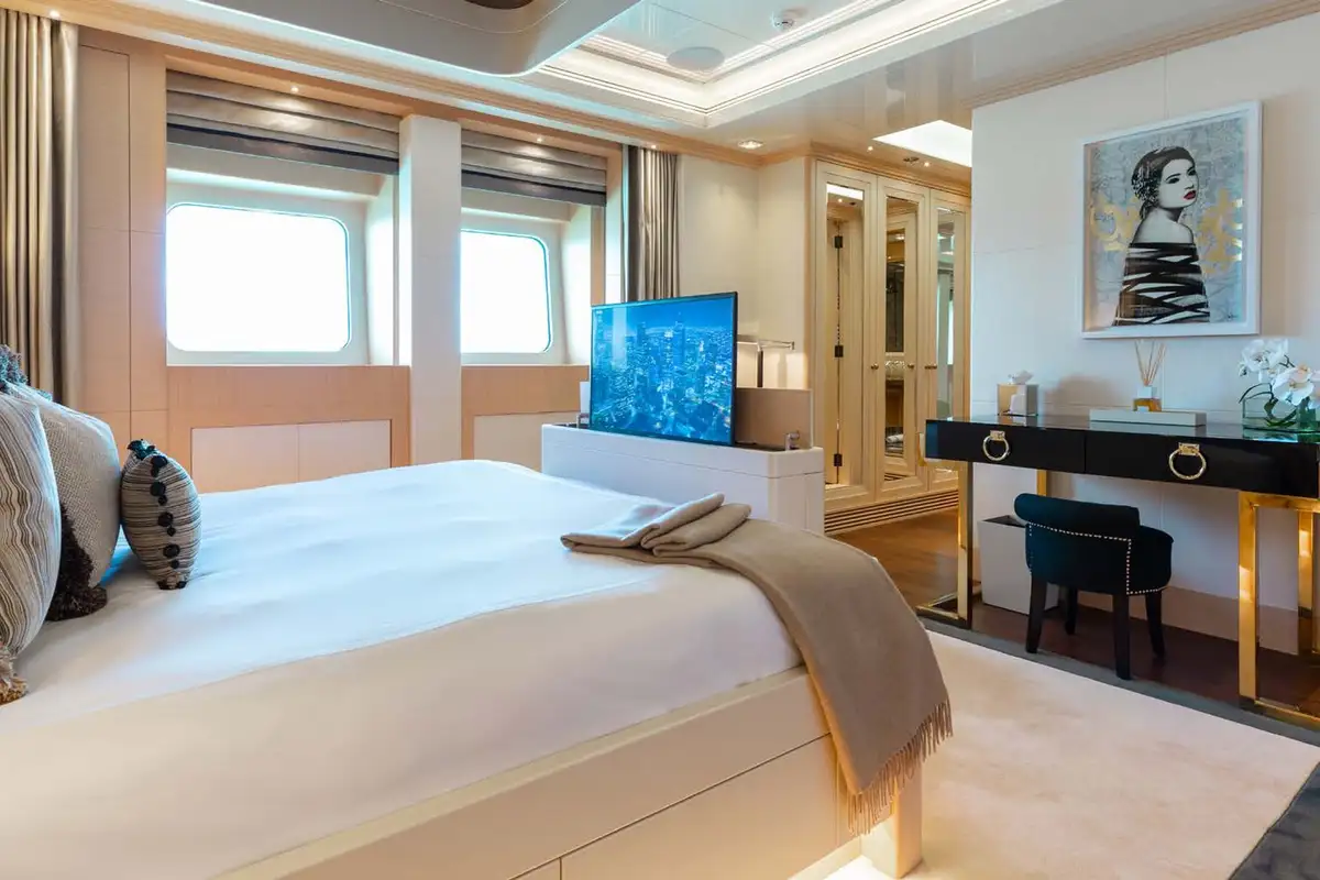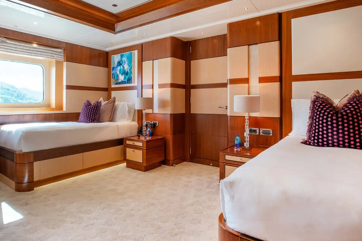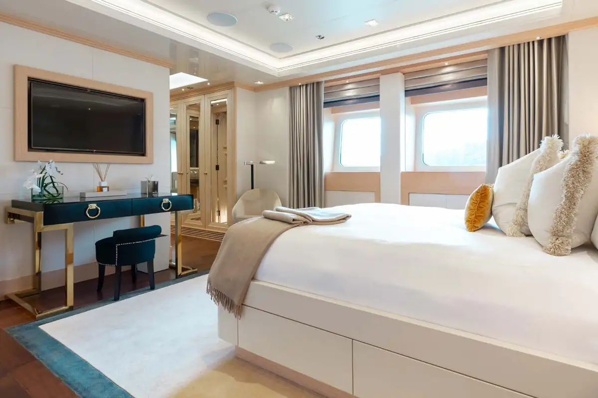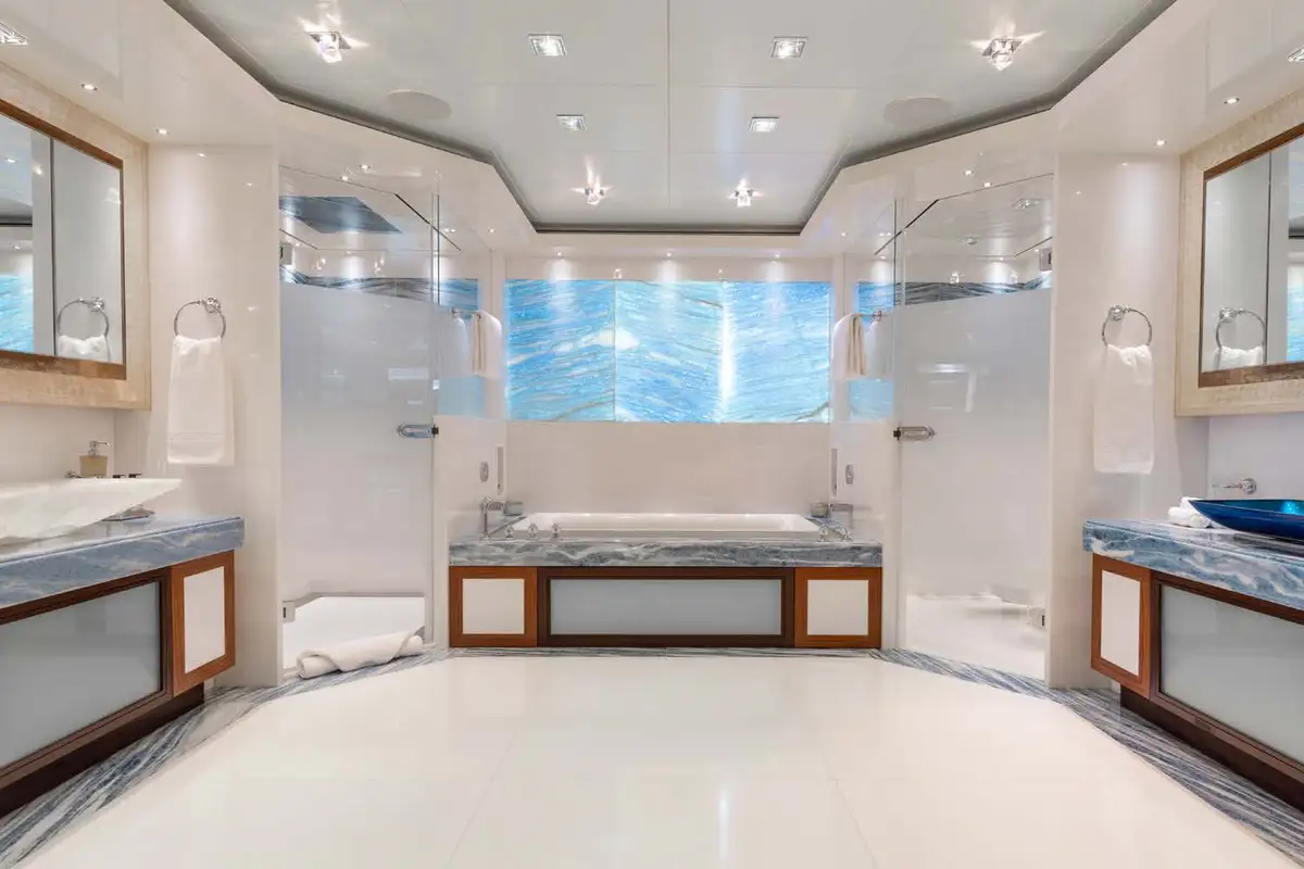 To change for dinner, make your way to the vast master cabin with its his and hers bathroom and two private balconies. The yacht sleeps 12 guests in seven cabins; beyond the bridge deck’s full beam master cabin, on the main deck there are two VIP suites, two double cabins, one twin cabin and one staff cabin. Zero speed stabilisers provide a comfortable guest experience at anchor.