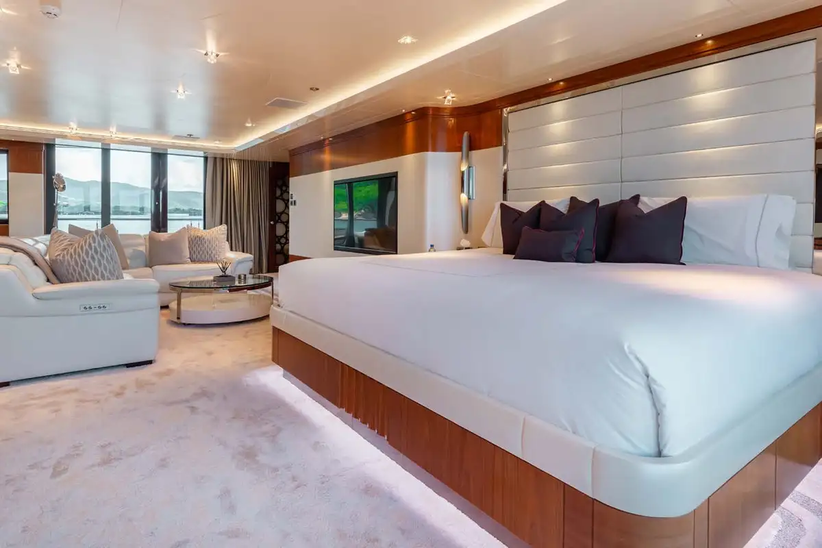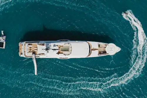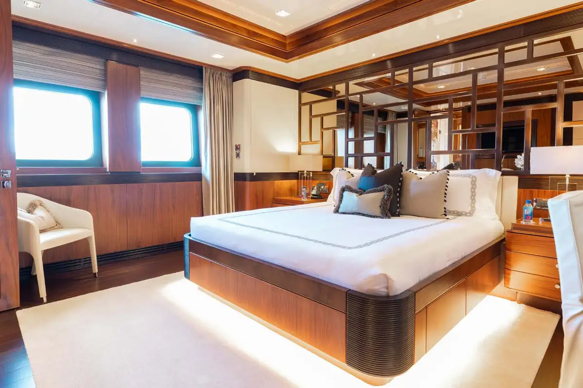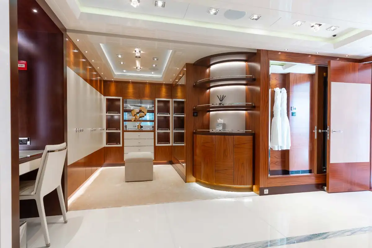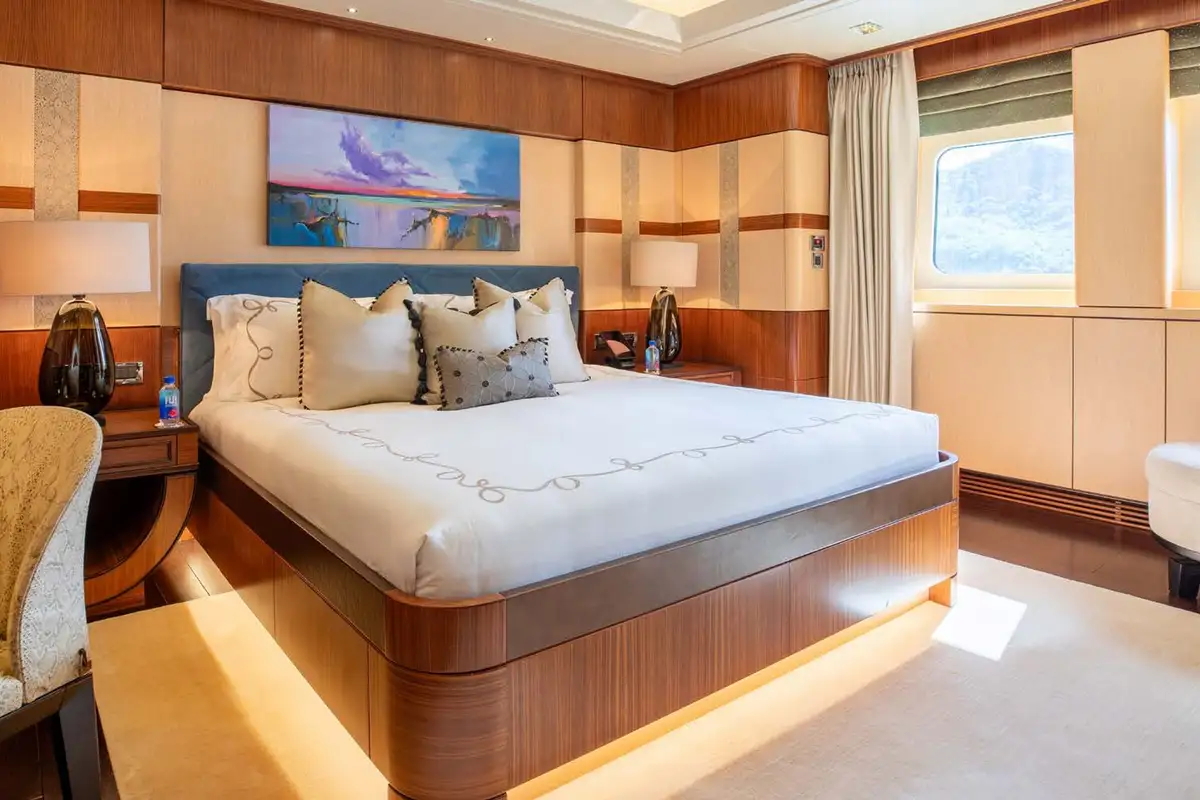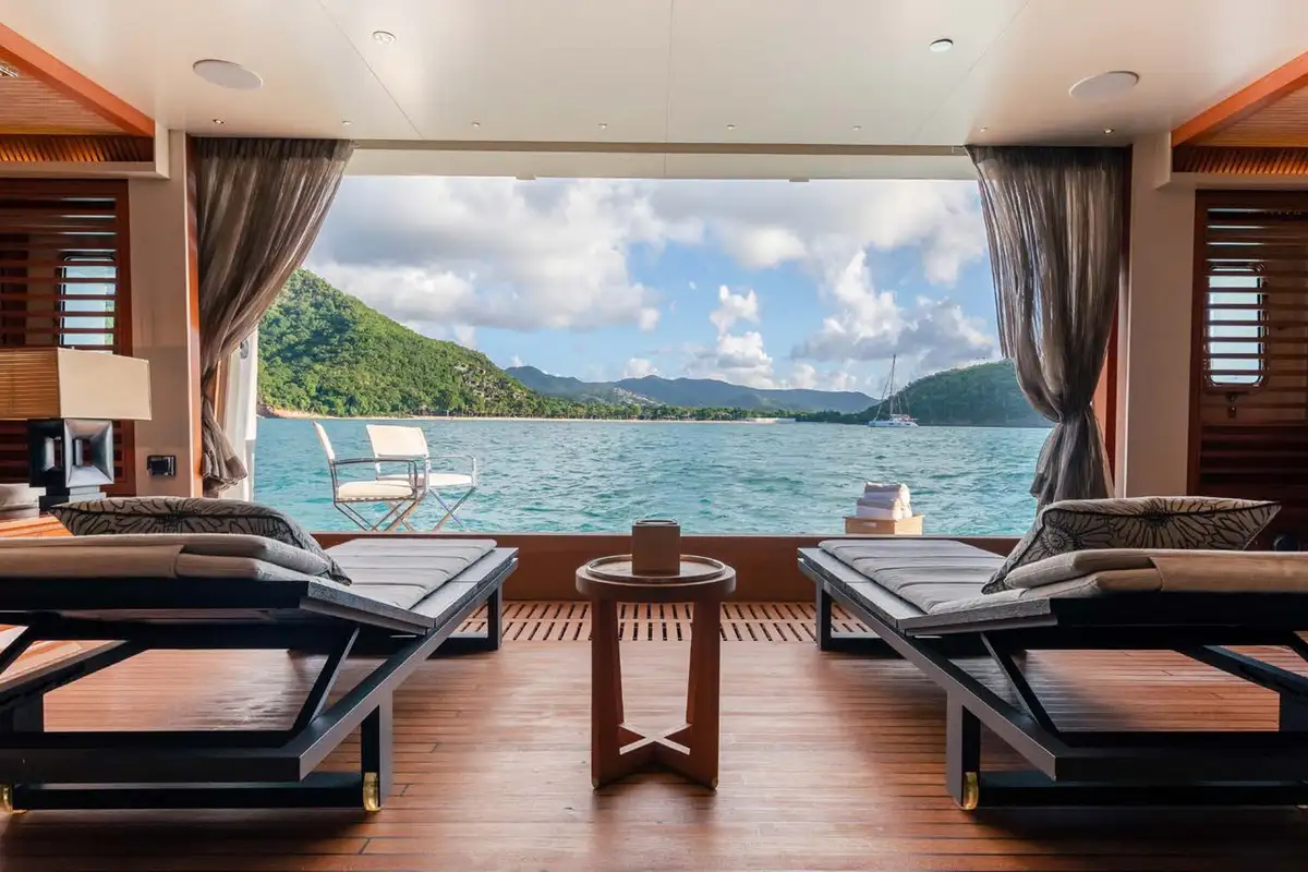 To change for dinner, make your way to the vast master cabin with its his and hers bathroom and two private balconies. The yacht sleeps 12 guests in seven cabins; beyond the bridge deck’s full beam master cabin, on the main deck there are two VIP suites, two double cabins, one twin cabin and one staff cabin. Zero speed stabilisers provide a comfortable guest experience at anchor.