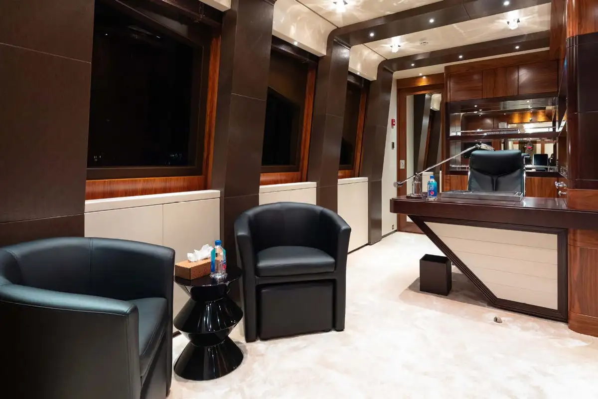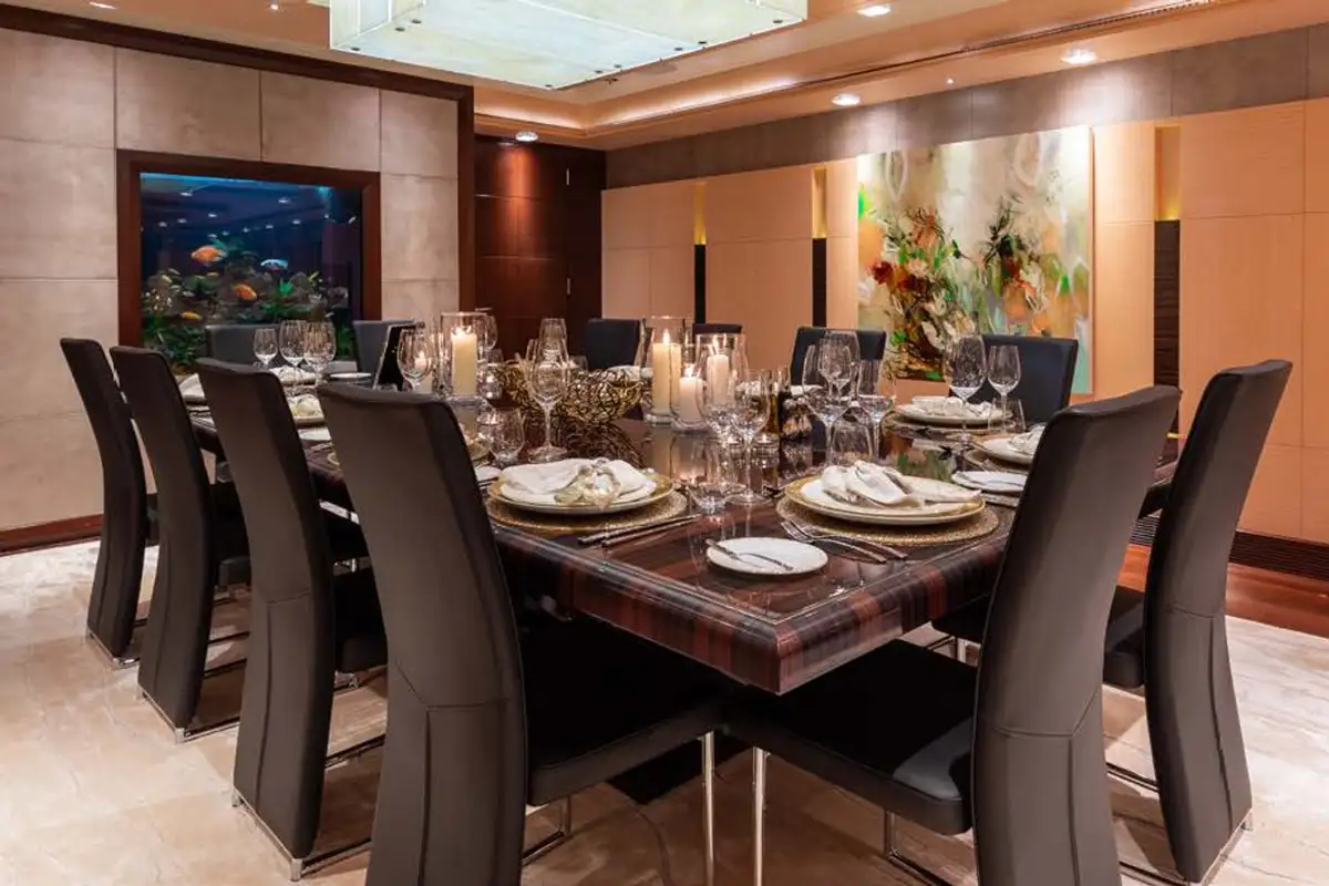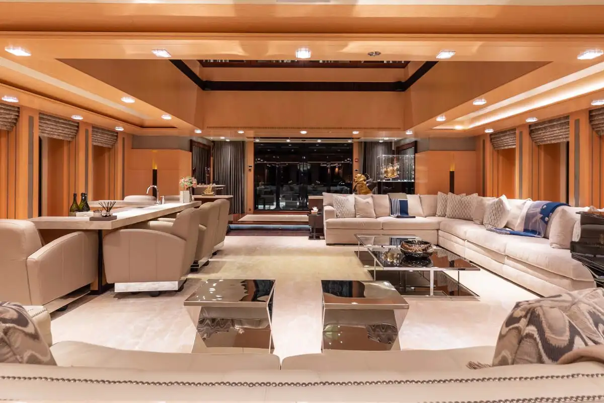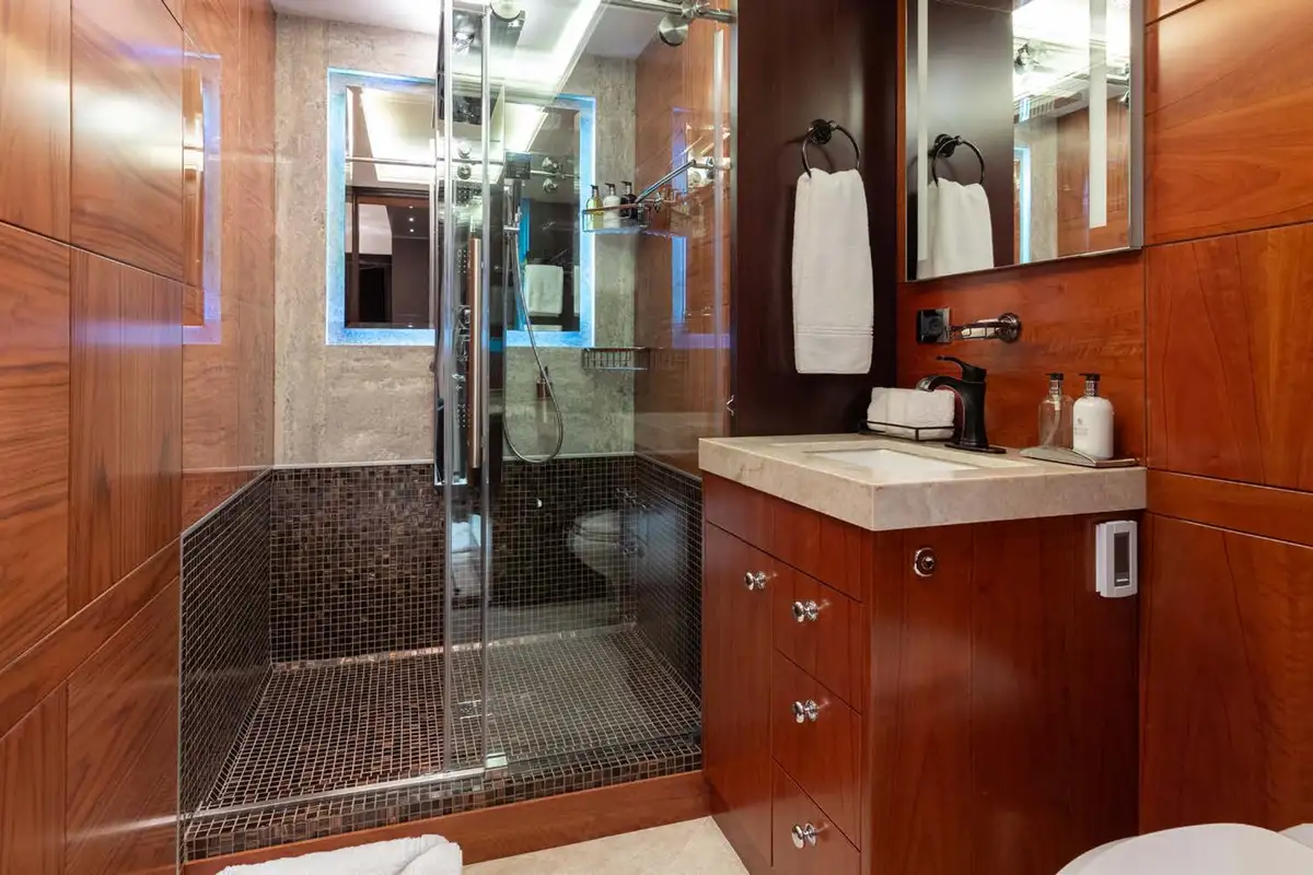 To change for dinner, make your way to the vast master cabin with its his and hers bathroom and two private balconies. The yacht sleeps 12 guests in seven cabins; beyond the bridge deck’s full beam master cabin, on the main deck there are two VIP suites, two double cabins, one twin cabin and one staff cabin. Zero speed stabilisers provide a comfortable guest experience at anchor.