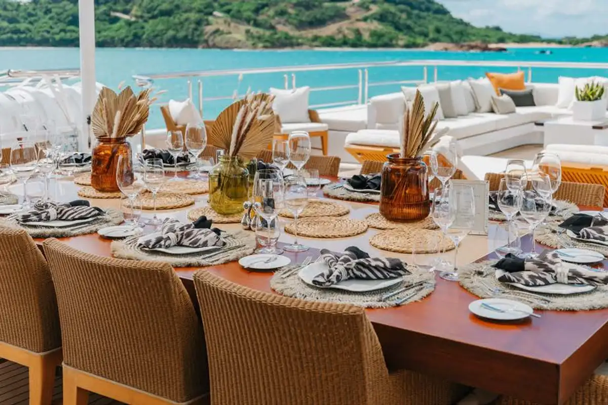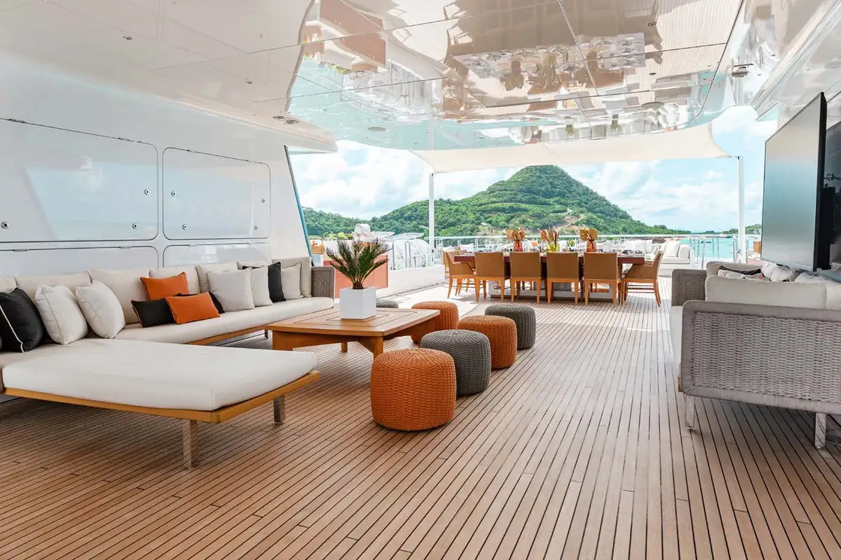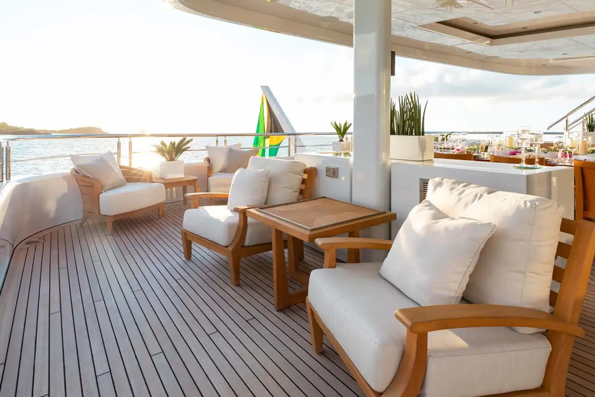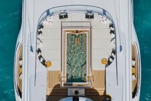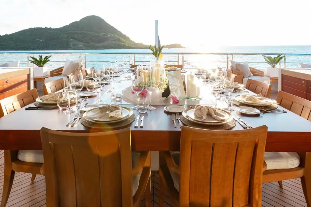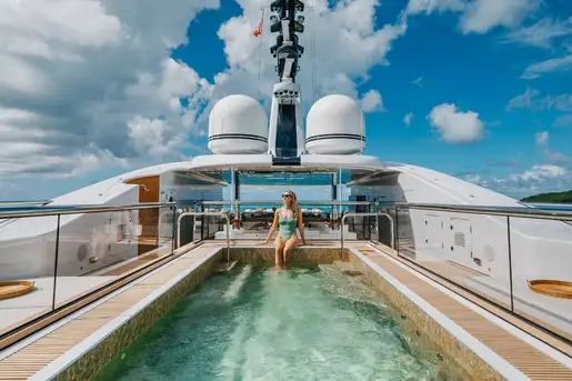 Lunch is served on the sun deck, while the captain moves the yacht to a new anchorage. The sun deck is perfect for an afternoon of relaxation, with the five metre jacuzzi pool large enough to fit everyone together, surrounded by comfy sun pads for a little sunbathing; the pool has a contraflow swimming system to allow for endless ‘laps’.