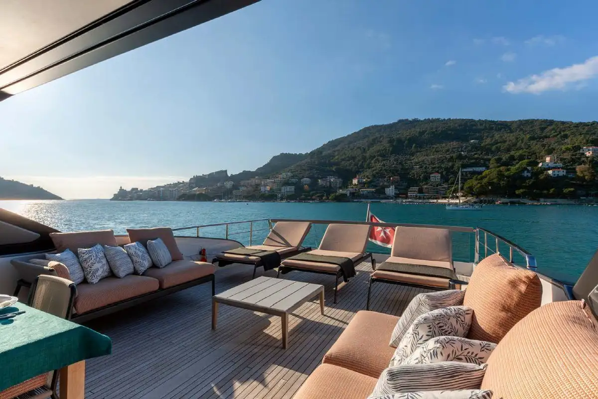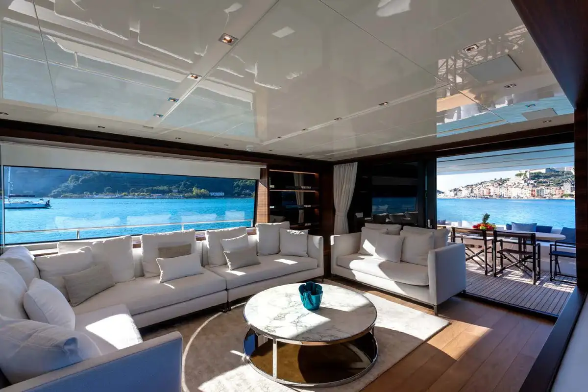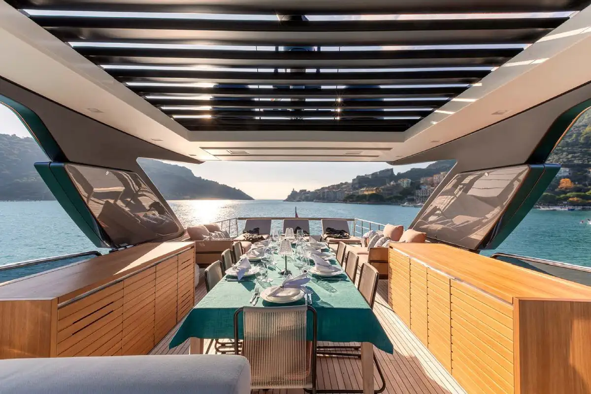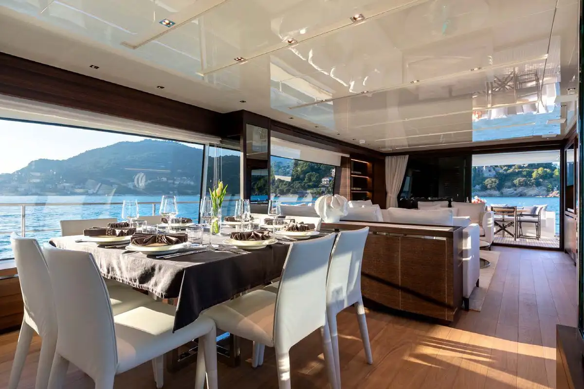 Sleek and inviting exterior spaces align QUEEN MARTINA and make her a perfect example of the expert planning and craftmanship that Sanlorenzo is famed for. The wide, expansive sun deck, with sun loungers, couches, and a dedicated dining area, is the perfect place to spend the afternoon either in the shade or under the sun. A dedicated bar runs parallel to the dining table, where the crew will happily hand you a fresh beverage. Descending the sun deck, you'll be greeted by the main deck. Providing excellent shelter from the elements and the harsh midday sun, it's a perfect rendezvous point for al fresco dining, cocktails, or somewhere to cool off after taking a dip in the sea.
