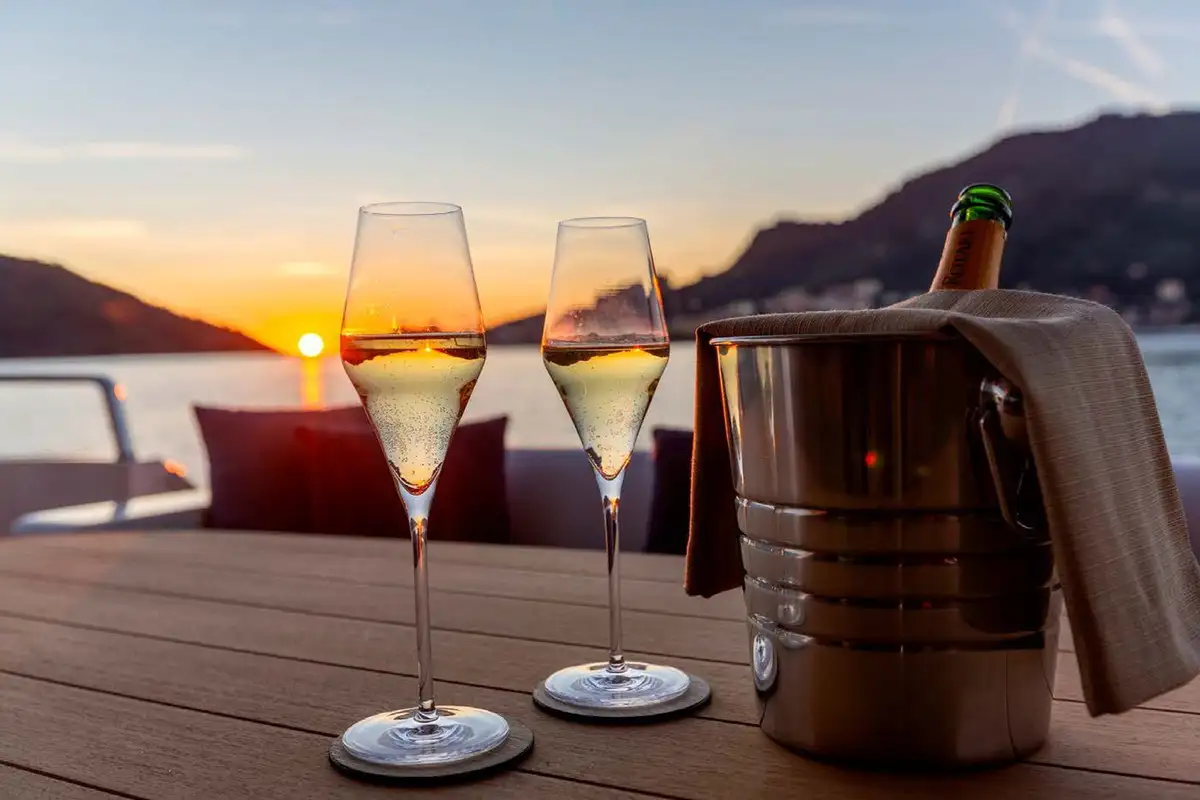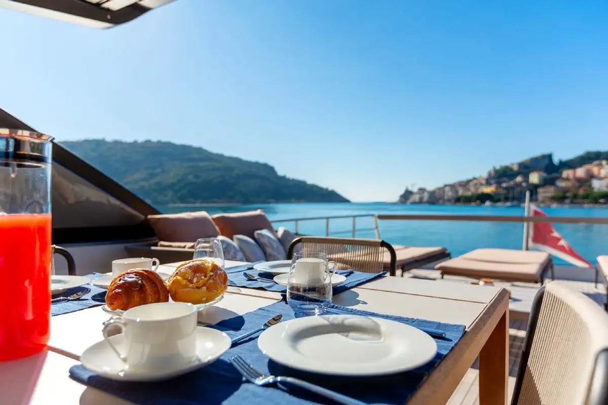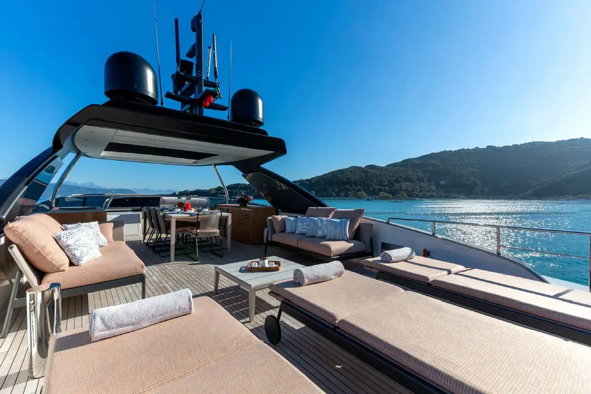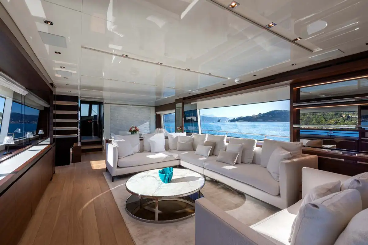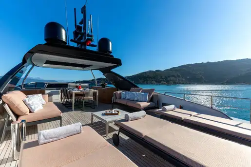Sleek and inviting exterior spaces align QUEEN MARTINA and make her a perfect example of the expert planning and craftmanship that Sanlorenzo is famed for. The wide, expansive sun deck, with sun loungers, couches, and a dedicated dining area, is the perfect place to spend the afternoon either in the shade or under the sun. A dedicated bar runs parallel to the dining table, where the crew will happily hand you a fresh beverage. Descending the sun deck, you'll be greeted by the main deck. Providing excellent shelter from the elements and the harsh midday sun, it's a perfect rendezvous point for al fresco dining, cocktails, or somewhere to cool off after taking a dip in the sea.