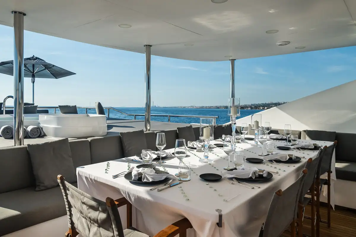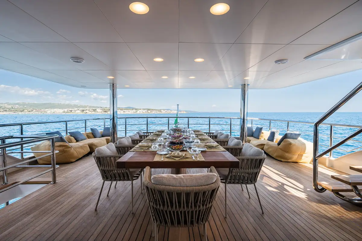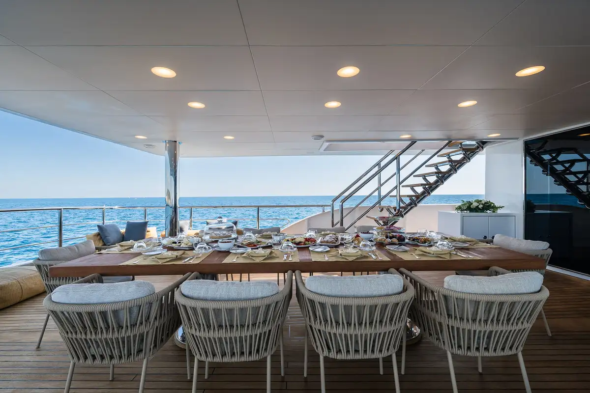 Once you're up and about, why not eat breakfast on the upper deck, where an al fresco table is set so that you all can start the day together. Plates packed with fresh produce and nutrients from the Balearic and Spanish coast await in addition to delicious pastries baked fresh by the chef, who prides himself on making every meal you savour on board to be a unique, flavourful experience.