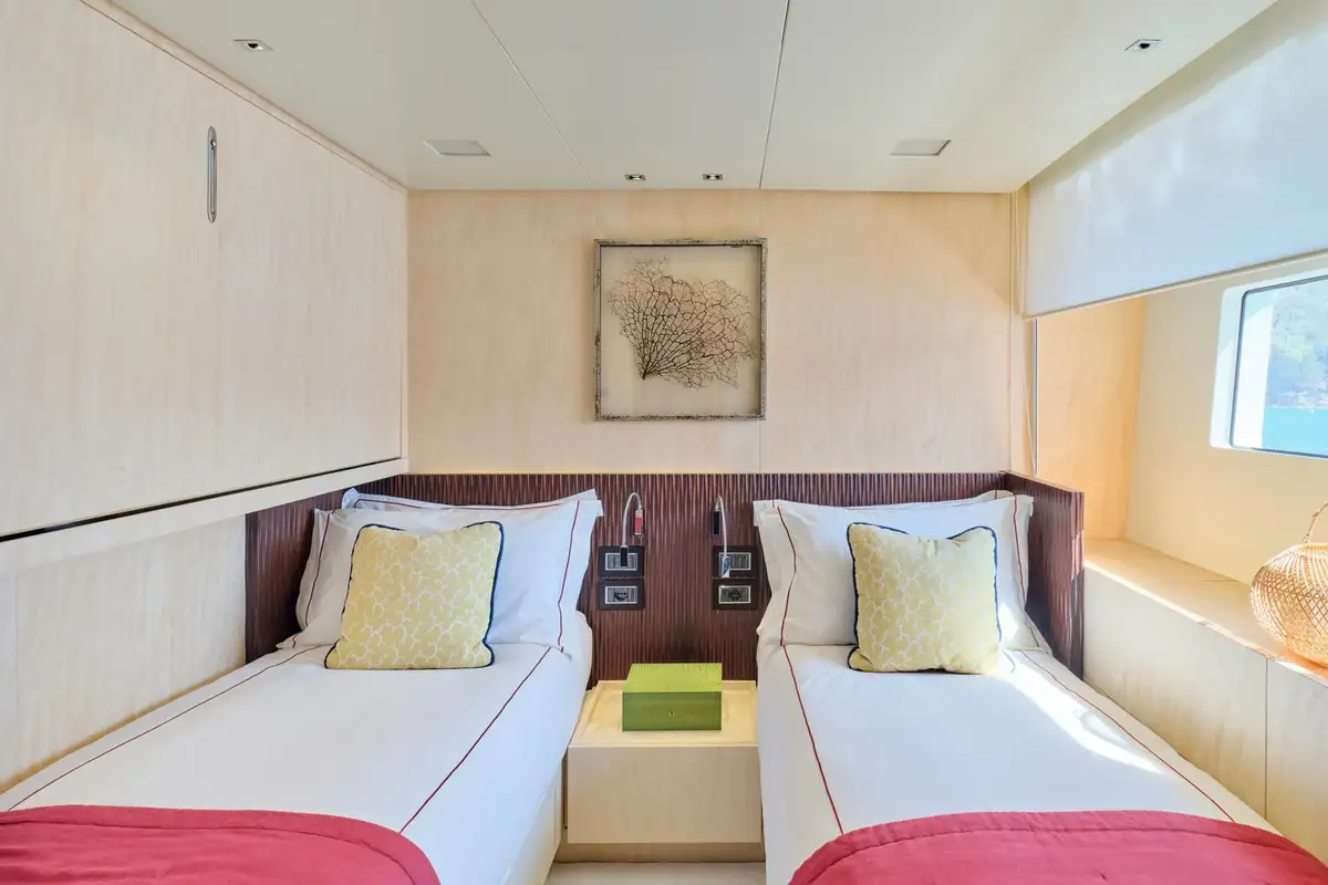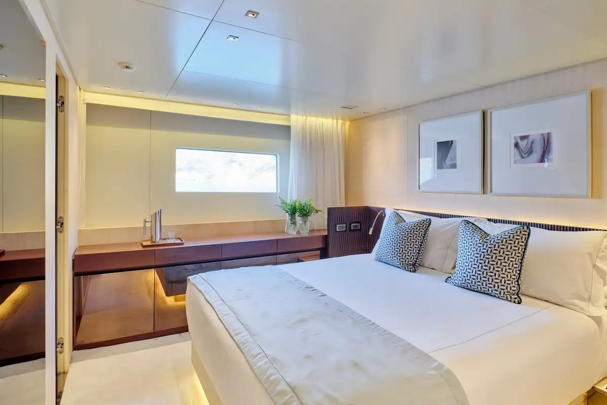 Your guests’ accommodation is on the lower deck. Here, they will be treated to similar luxury – contemporary suites with fuss-free styling, making each suite a light, harmonious space. There are two double VIP suites and two twin-berth suites (one with the added convenience of an additional pullman berth).