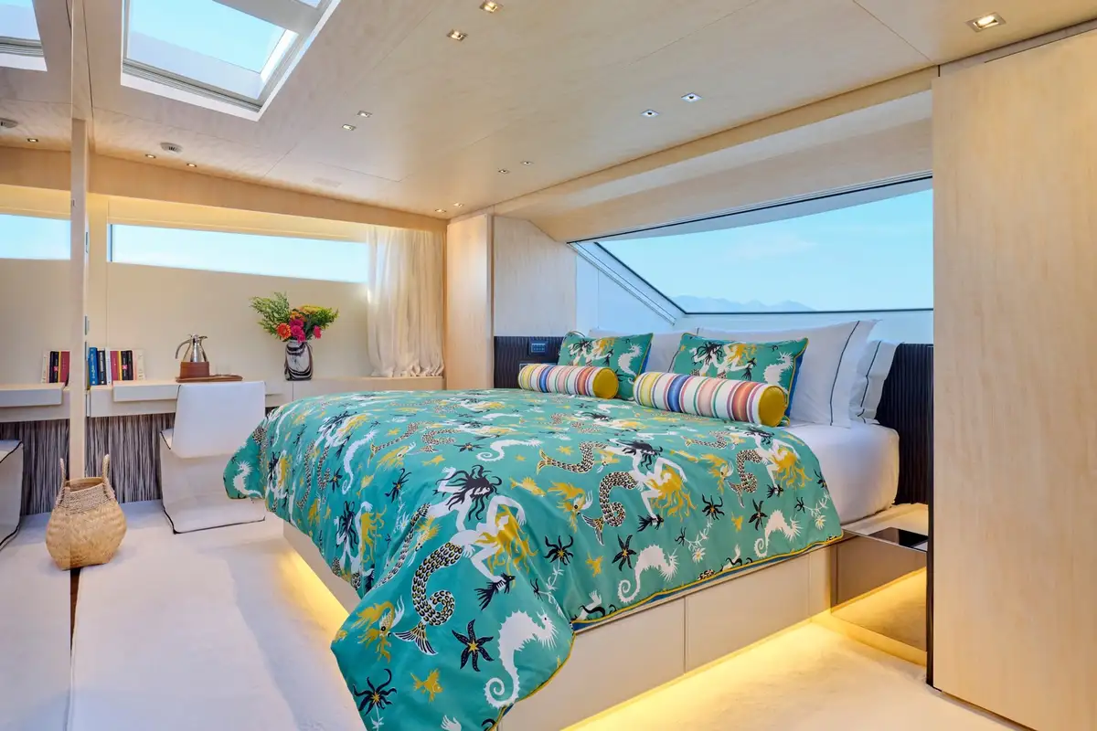 Entering the main saloon, you’ll see an impressive modern and stylish space. Turquoise chairs add a splash of colour, and picture windows run the length, so whether you’re indulging in fine cuisine at the formal dining area or unwinding in the lounge area, you can appreciate your surroundings – inside and out. Ahead on this deck is your master suite. With a large angled window over the head of the bed and skylights aft, the suite is a fantastically light area to rest and revive. To the rear of the suite is a majestic en suite bathroom, with a monsoon shower and his and hers sinks.